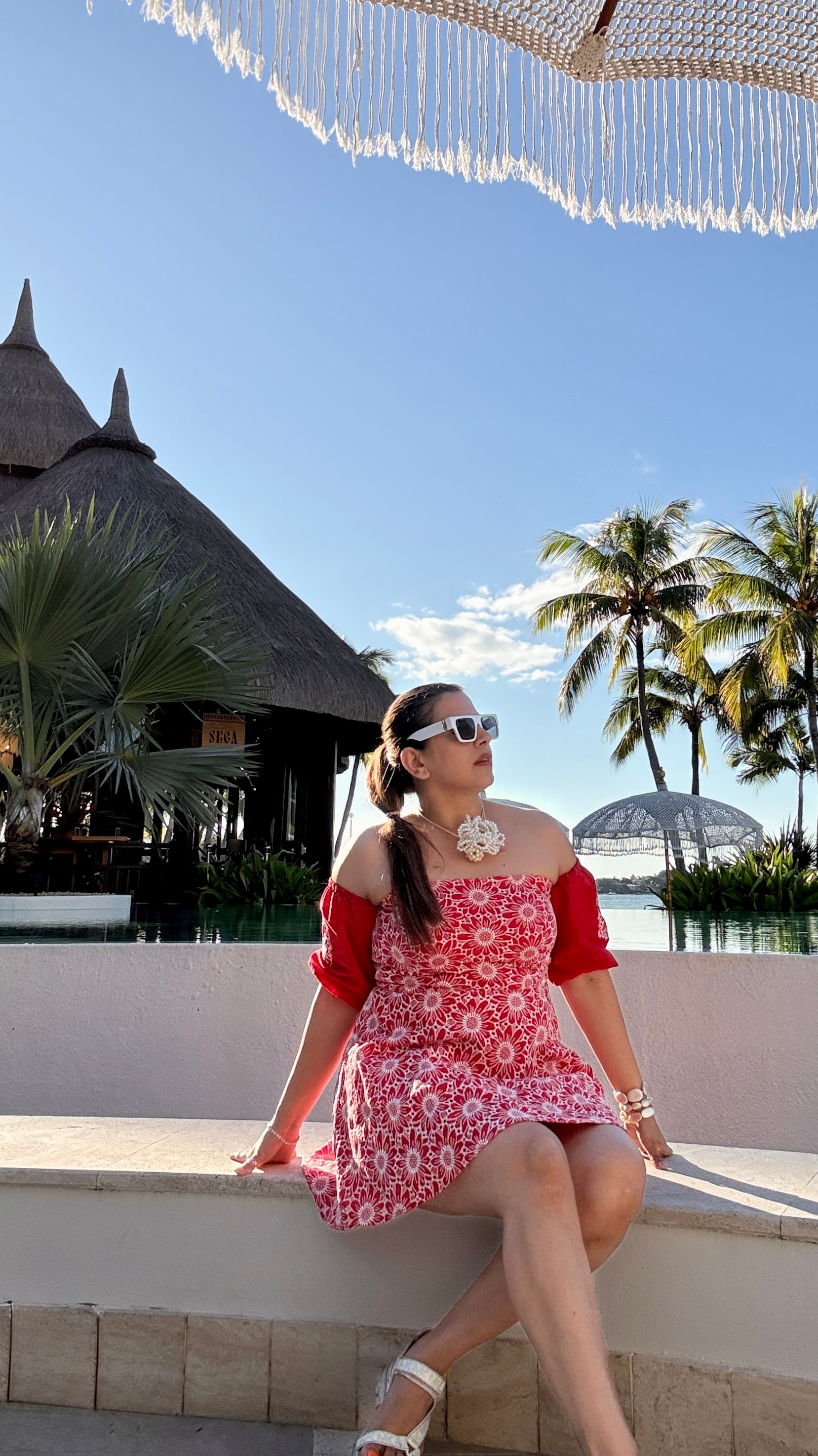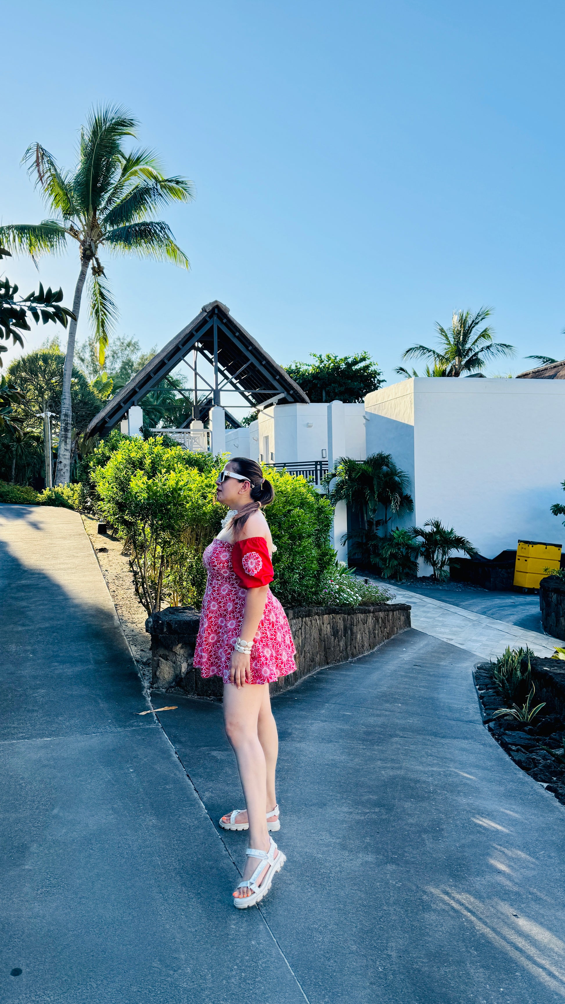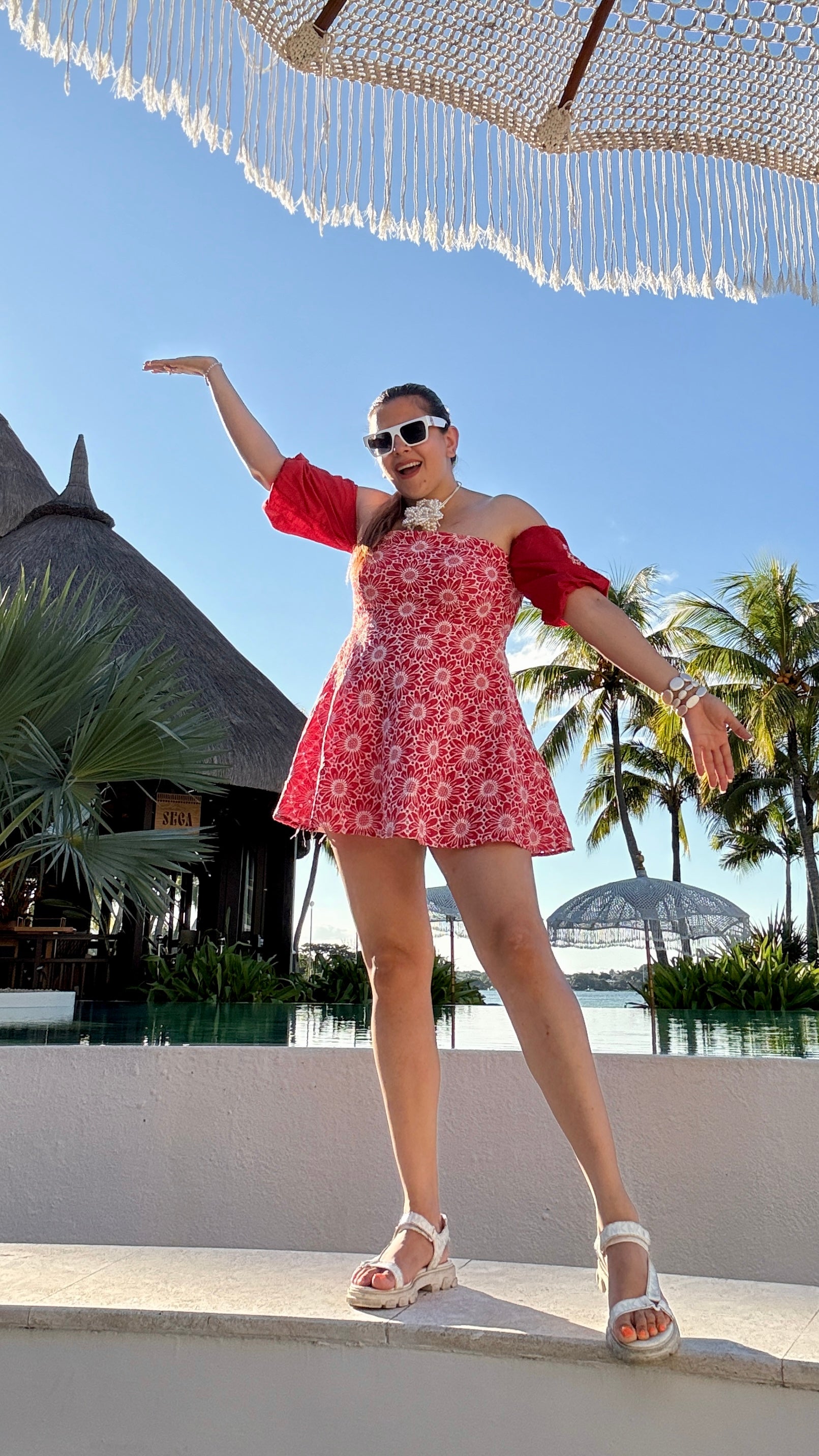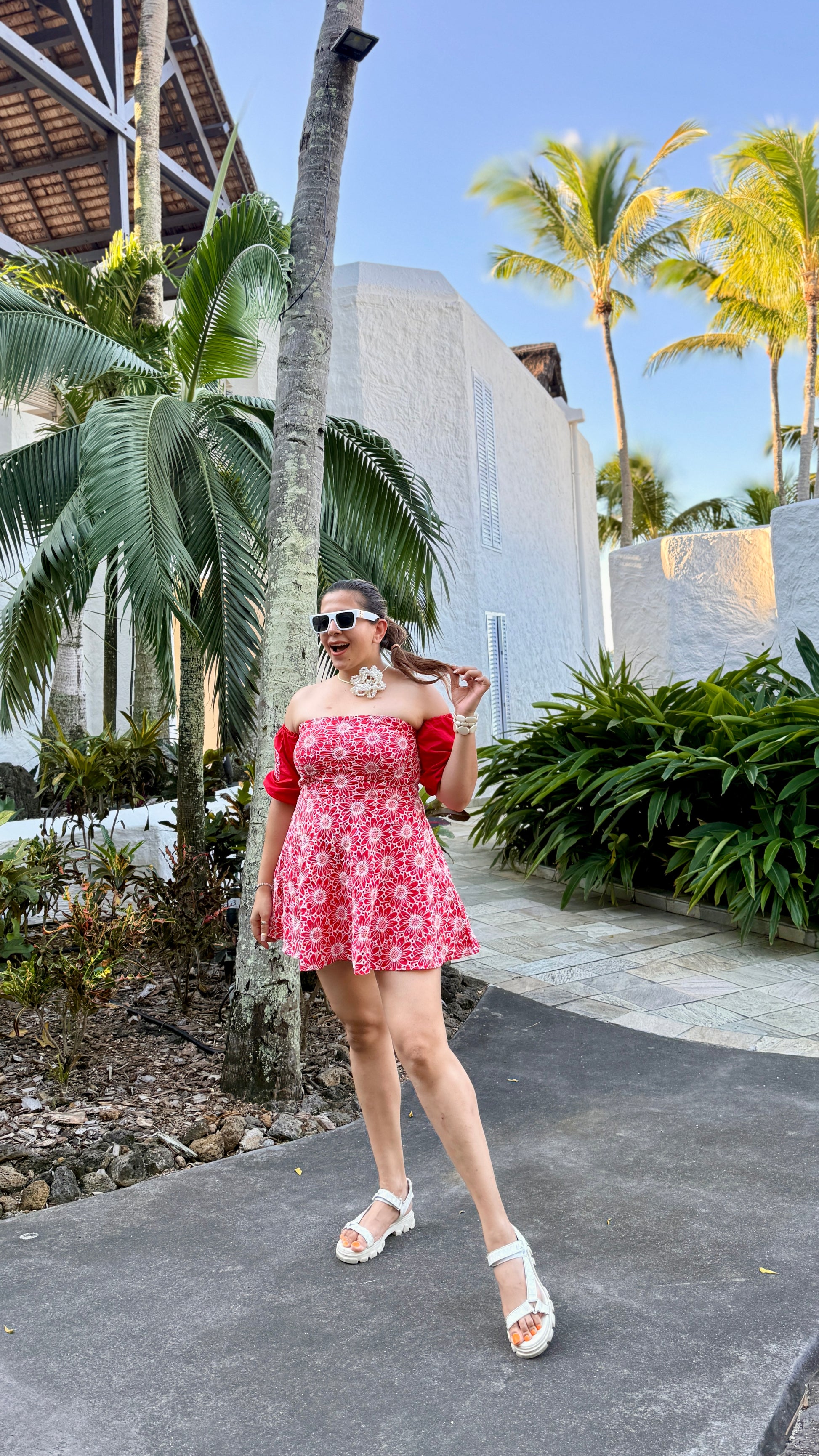 This vibrant red Hakoba cotton top 🌺 features intricate floral embroidery 🌼, puffed off-shoulder sleeves ❤️, and a fitted bodice for a chic, summery vibe 🌞—perfect for tropical getaways 🌴👒. |