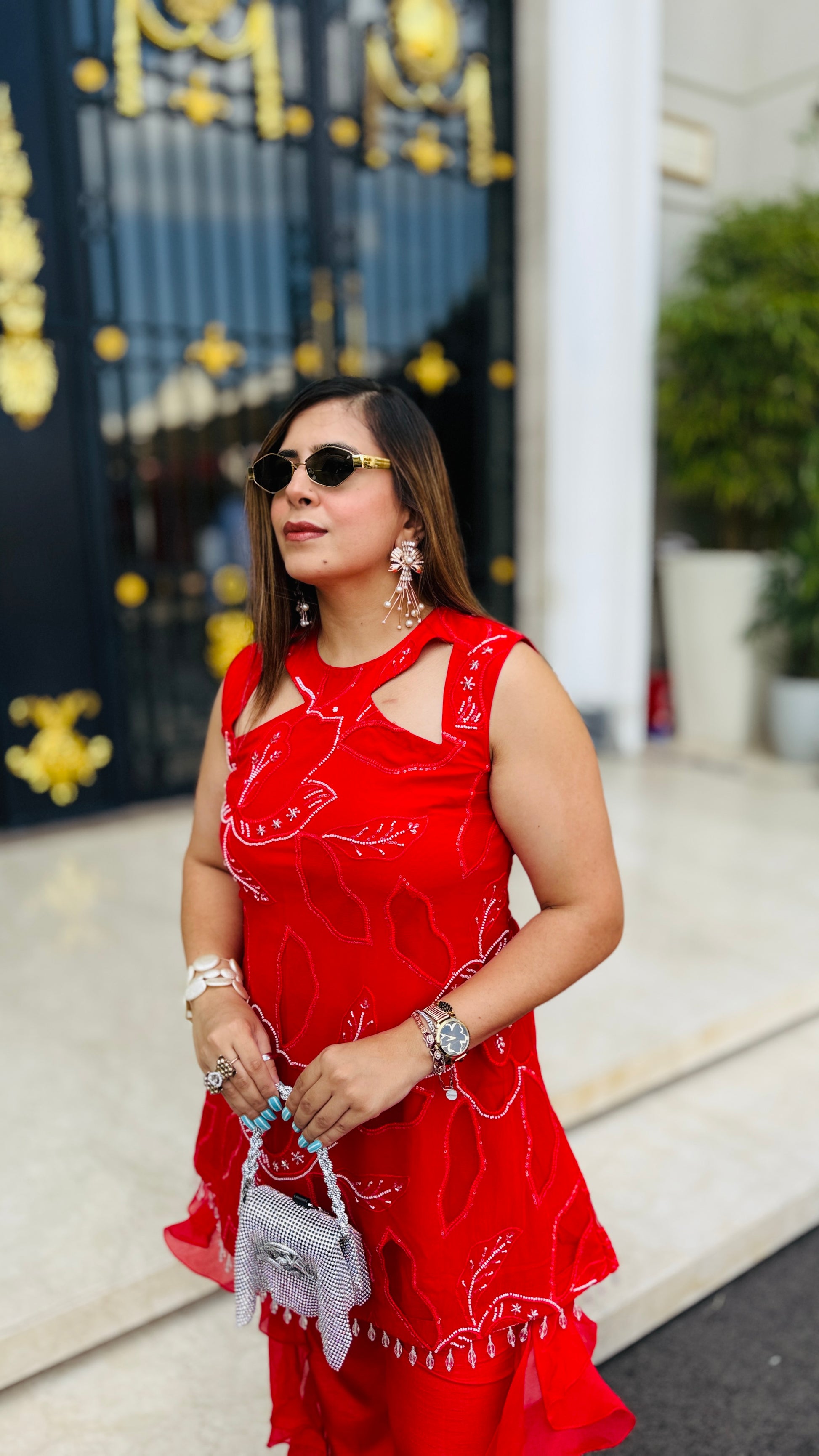 Turn heads in this Red Hollywood Co-Ord 💖✨ Featuring chic cut-out detailing, bold floral embroidery, and dramatic ruffle pants 🎀👖—perfect for your glam moments under the sun! 😎🌸💃 |