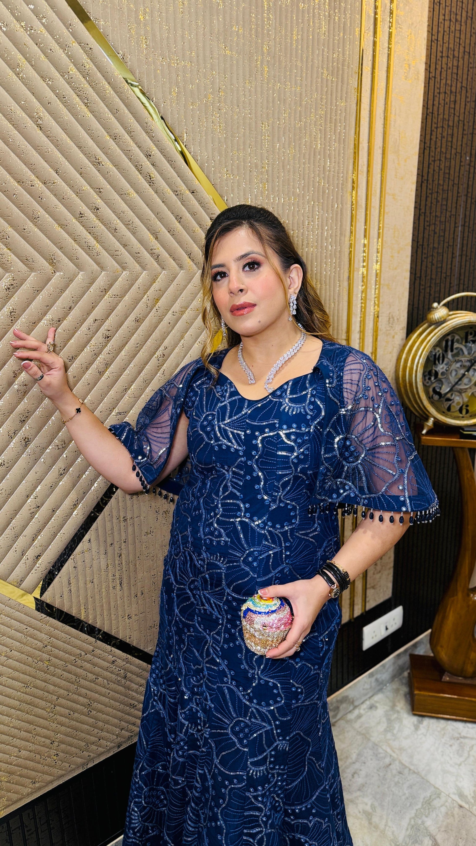 | Description | Lakhina Couture presents this navy blue fish-cut gown crafted for women who love dramatic elegance. Designed for weddings, festive nights, and grand celebrations, it features a structured square neckline, flowing net panels, knife-pleated ghera, and an attached cape with subtle cancan for volume. Made to order for a refined fit and couture finish beyond readymade styles. |
