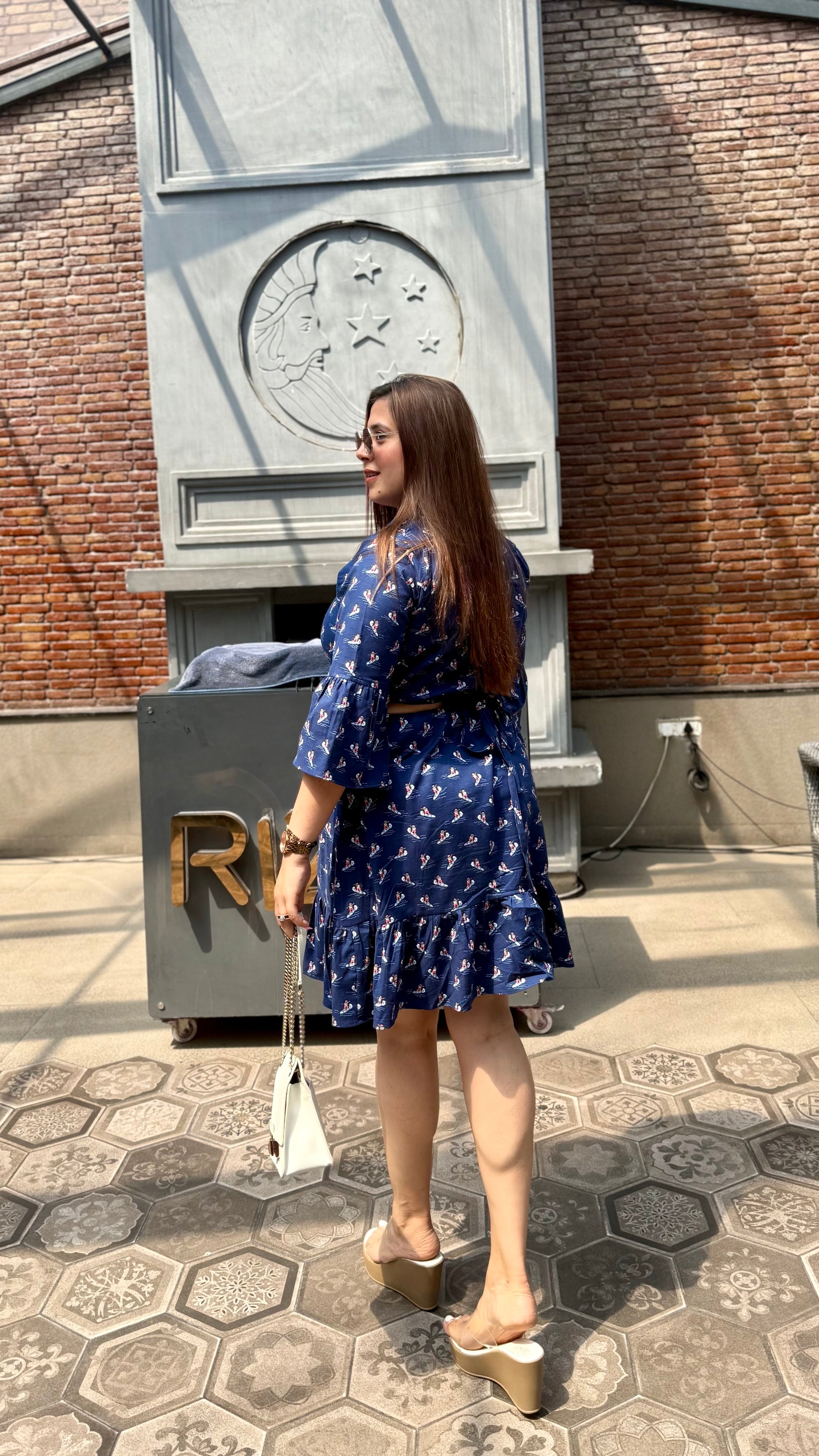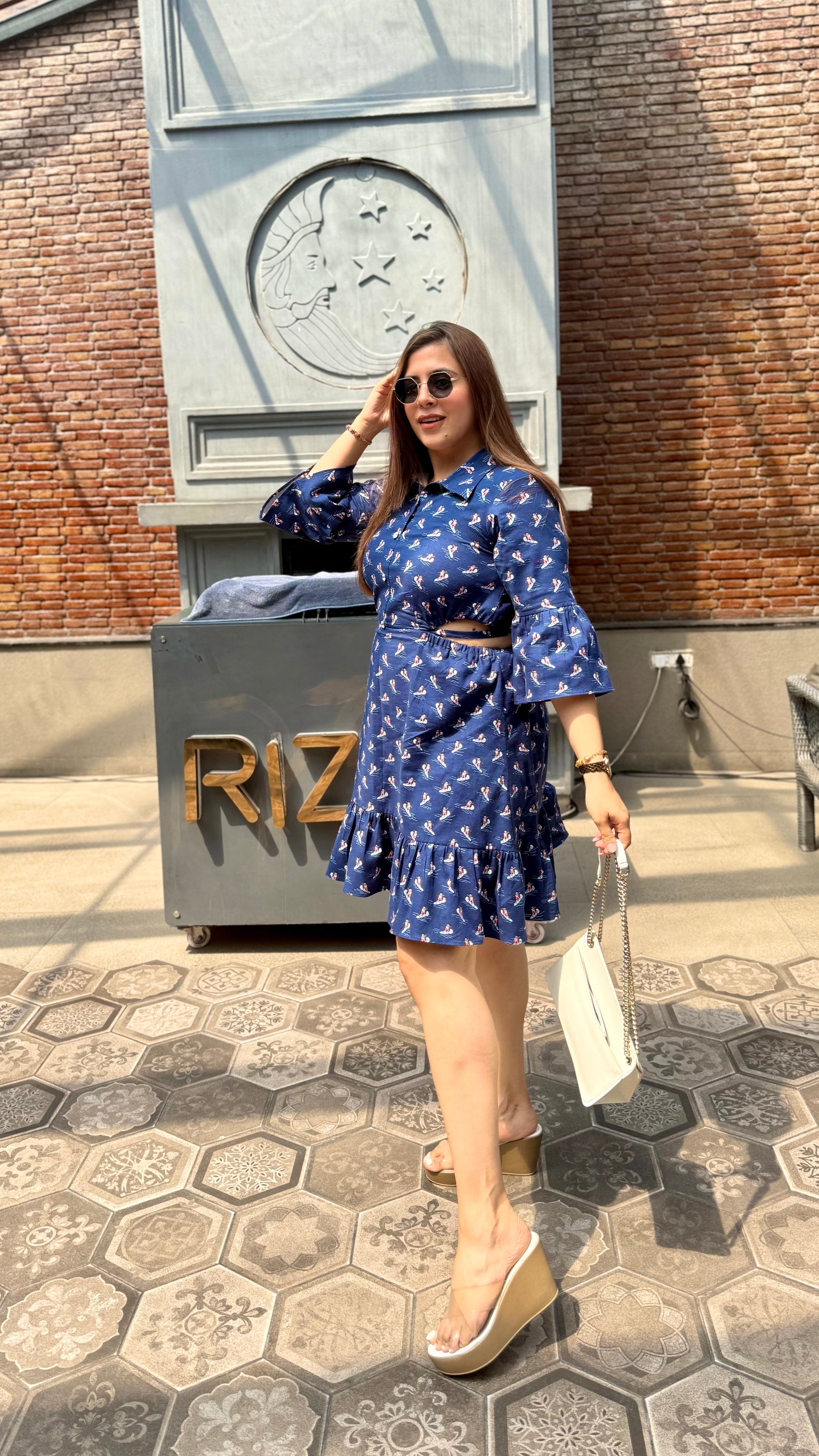 The Santa Cotton Dress 🌸 is a navy blue cotton dress featuring a playful sailboat print ⛵, collared neckline, 10+7 sleeves, side cut-outs 🔥, flared ruffled hem 💃 & buttoned front.