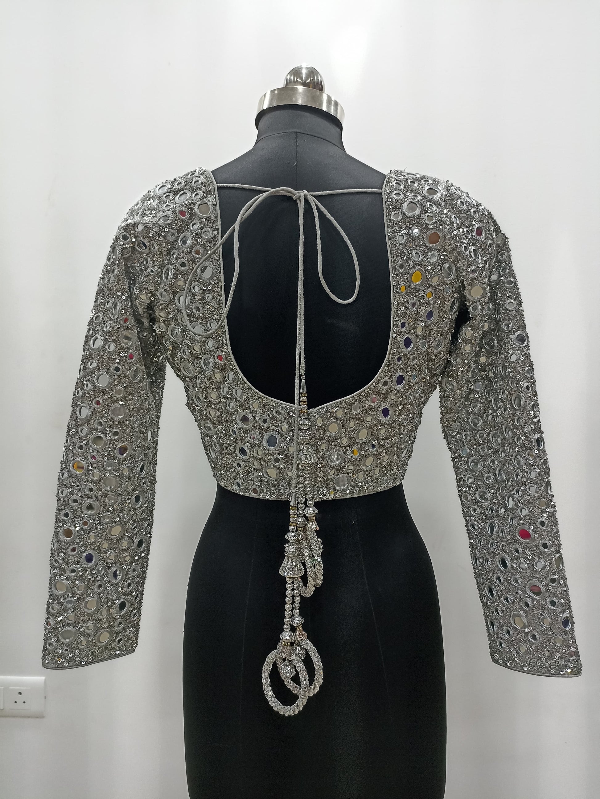 Silver Luxe Blouse: ✨ Elegantly crafted with intricate mirror work and a sleek silver finish, this blouse shines with sophistication. Perfect for adding glam to any festive or party look! 💃 |