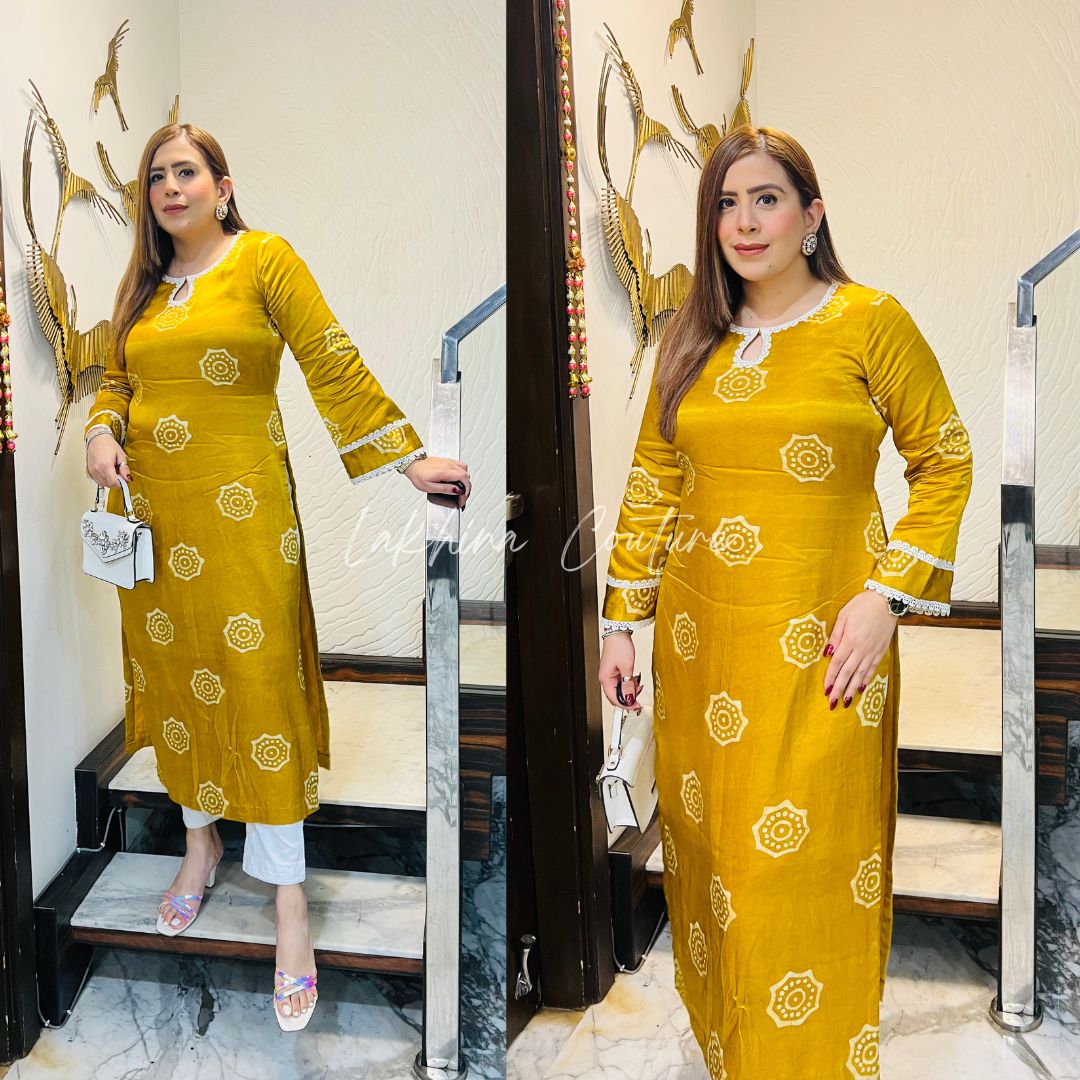 This vibrant sunshine yellow batik kurti boasts intricate patterns and elegant lace detailing on the sleeves. Ideal for festive or casual occasions, it pairs beautifully with white bottoms and accessories. 🌞👗✨ #BrightStyle |