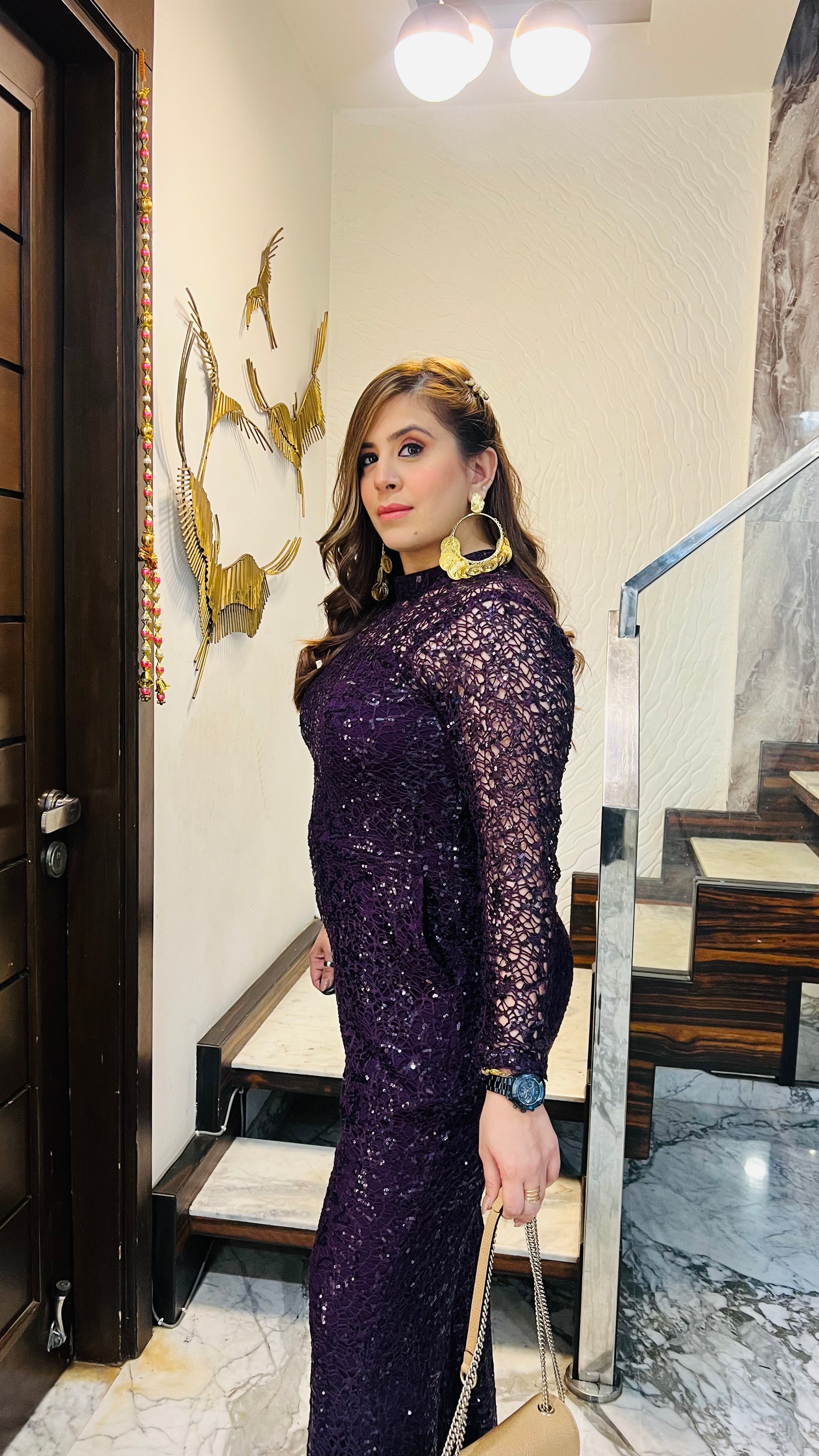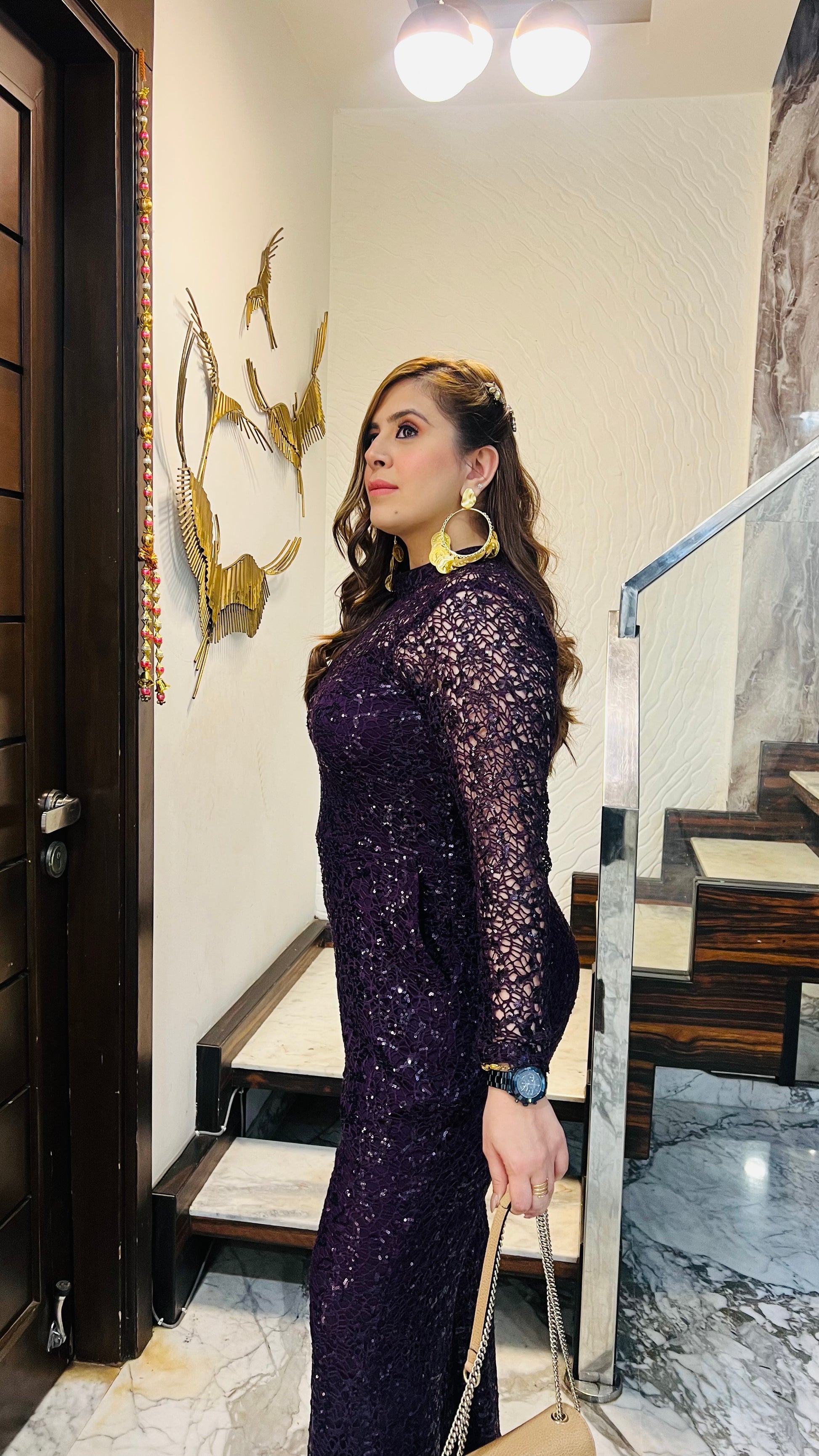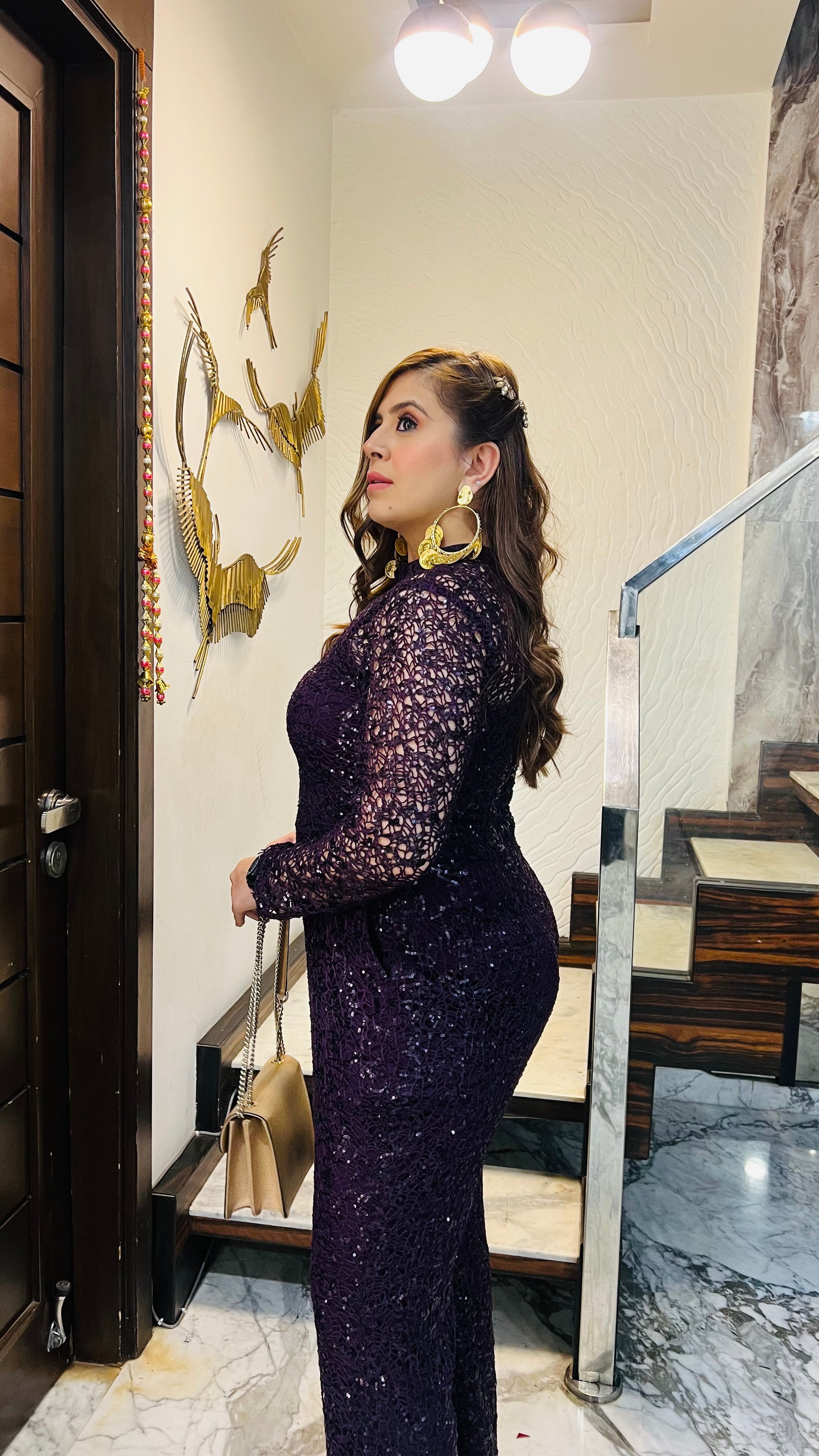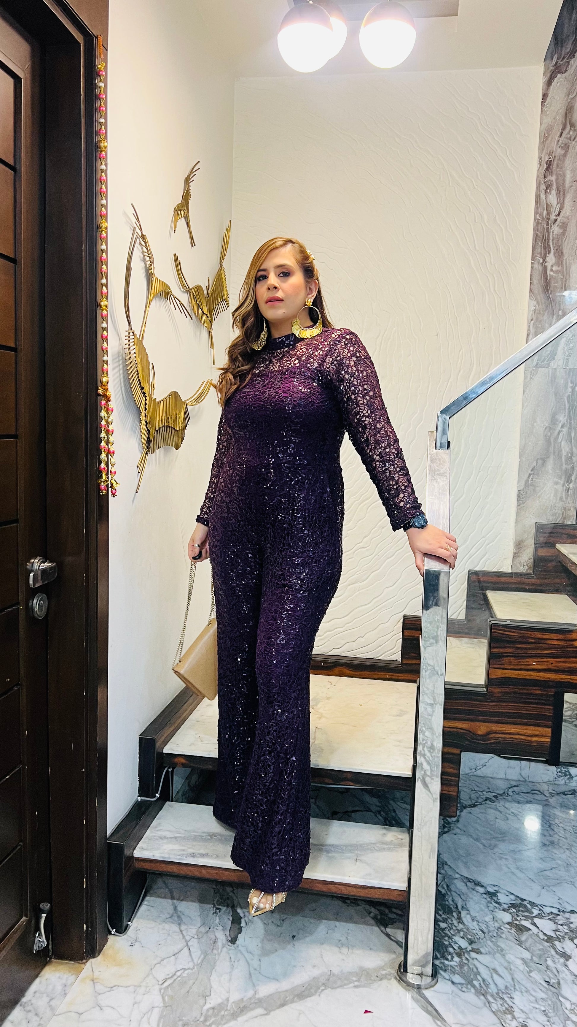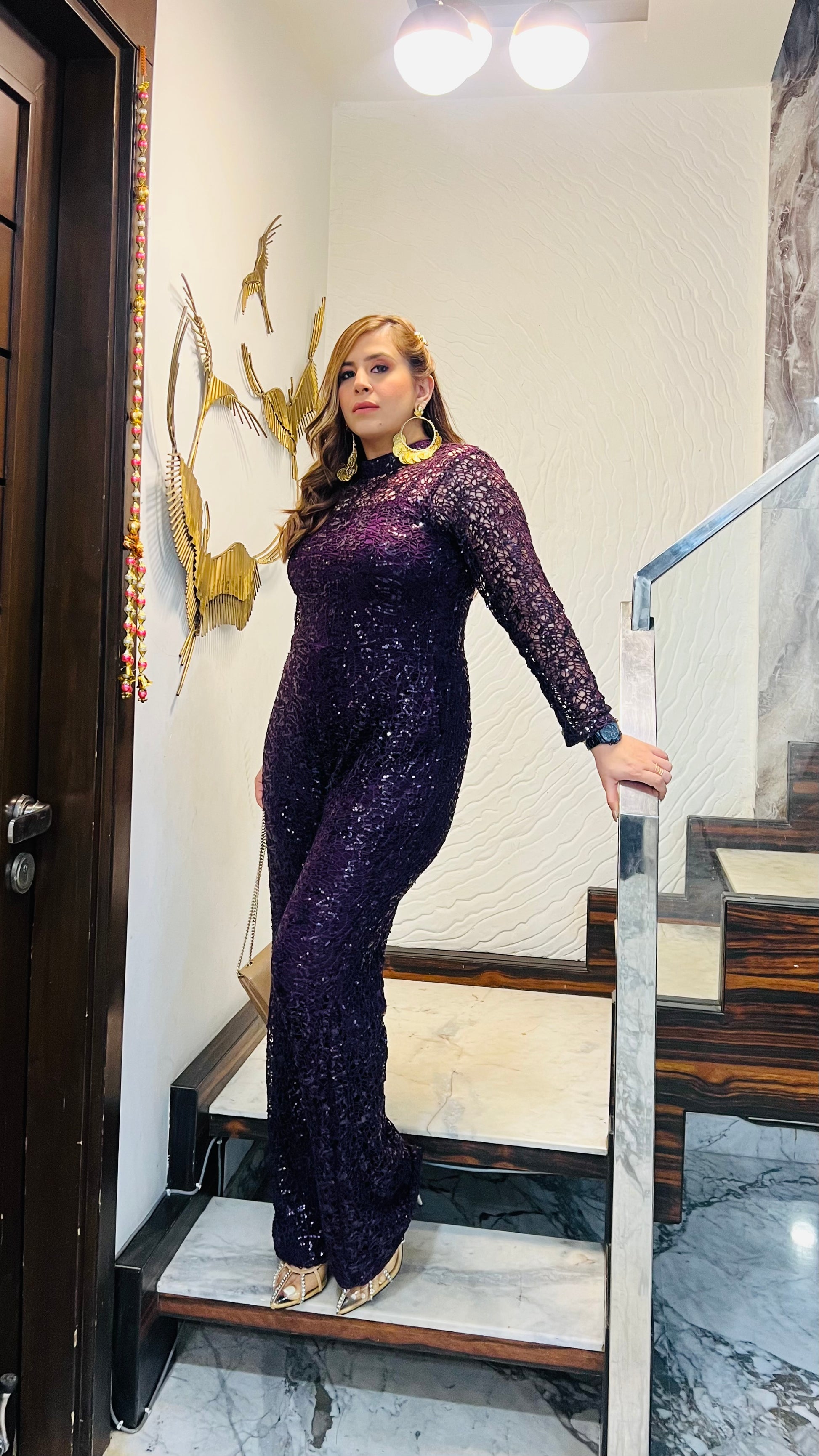 ✨ Party in purple net jumpsuit ✨ Step into elegance with this stunning deep purple sequin jumpsuit 💜. Featuring sheer net sleeves, satin lycra comfort, and a flared silhouette ✨, it’s perfect for glamorous evenings! 🌙💃 |