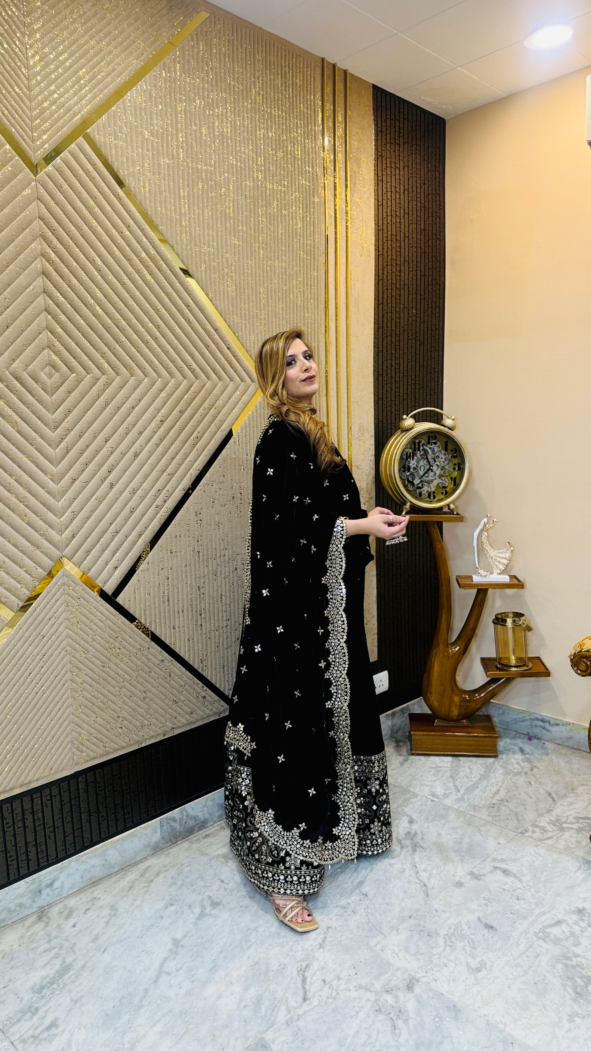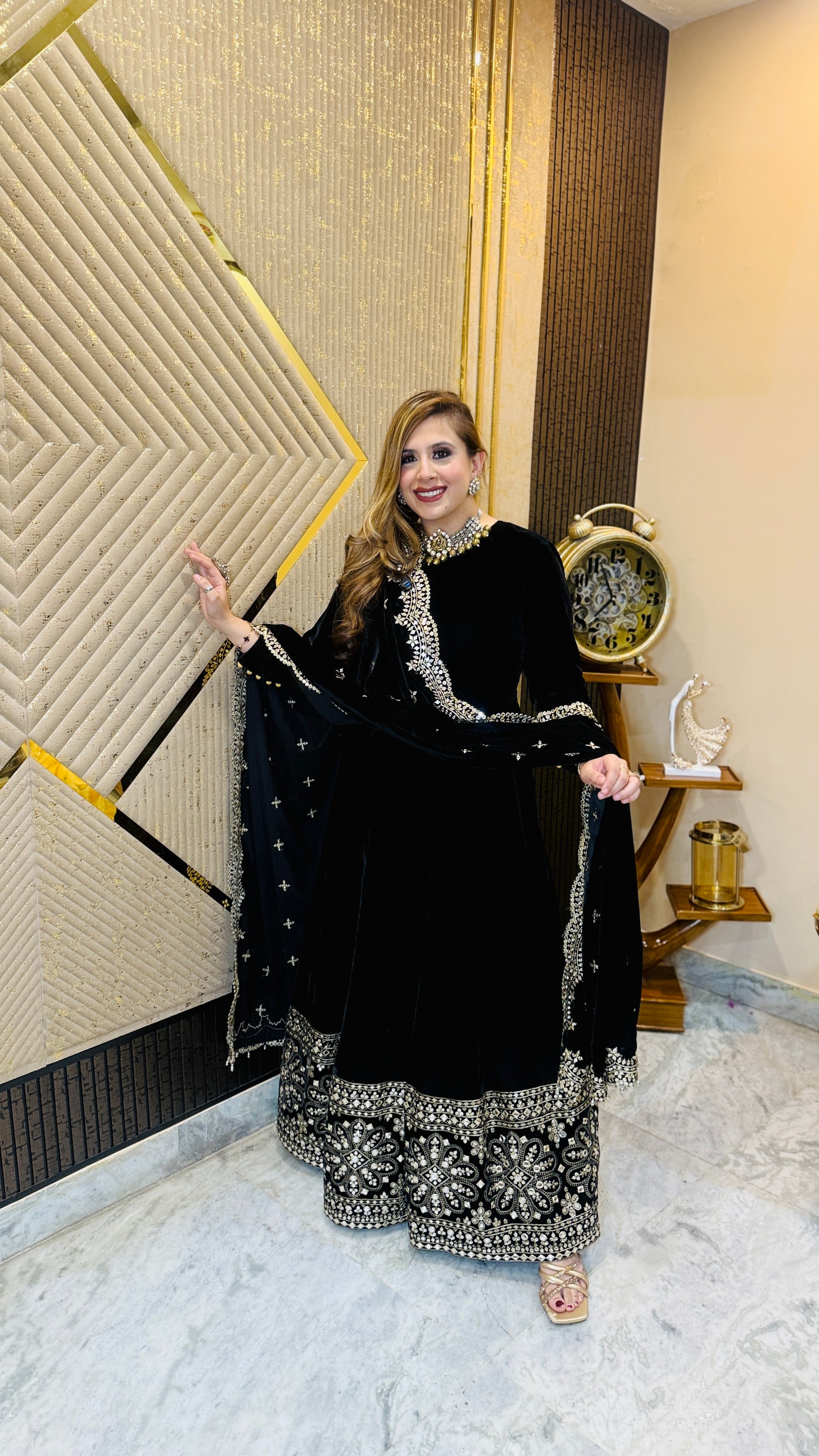 🌸 An elegant black velvet ensemble adorned with intricate golden embroidery, this outfit exudes timeless luxury. Featuring a flowing silhouette with a richly detailed border, delicate motifs throughout and a statement neckline, it offers effortless grace and movement. Perfect for weddings, festive evenings and formal celebrations, this piece blends classic craftsmanship with modern sophistication. |