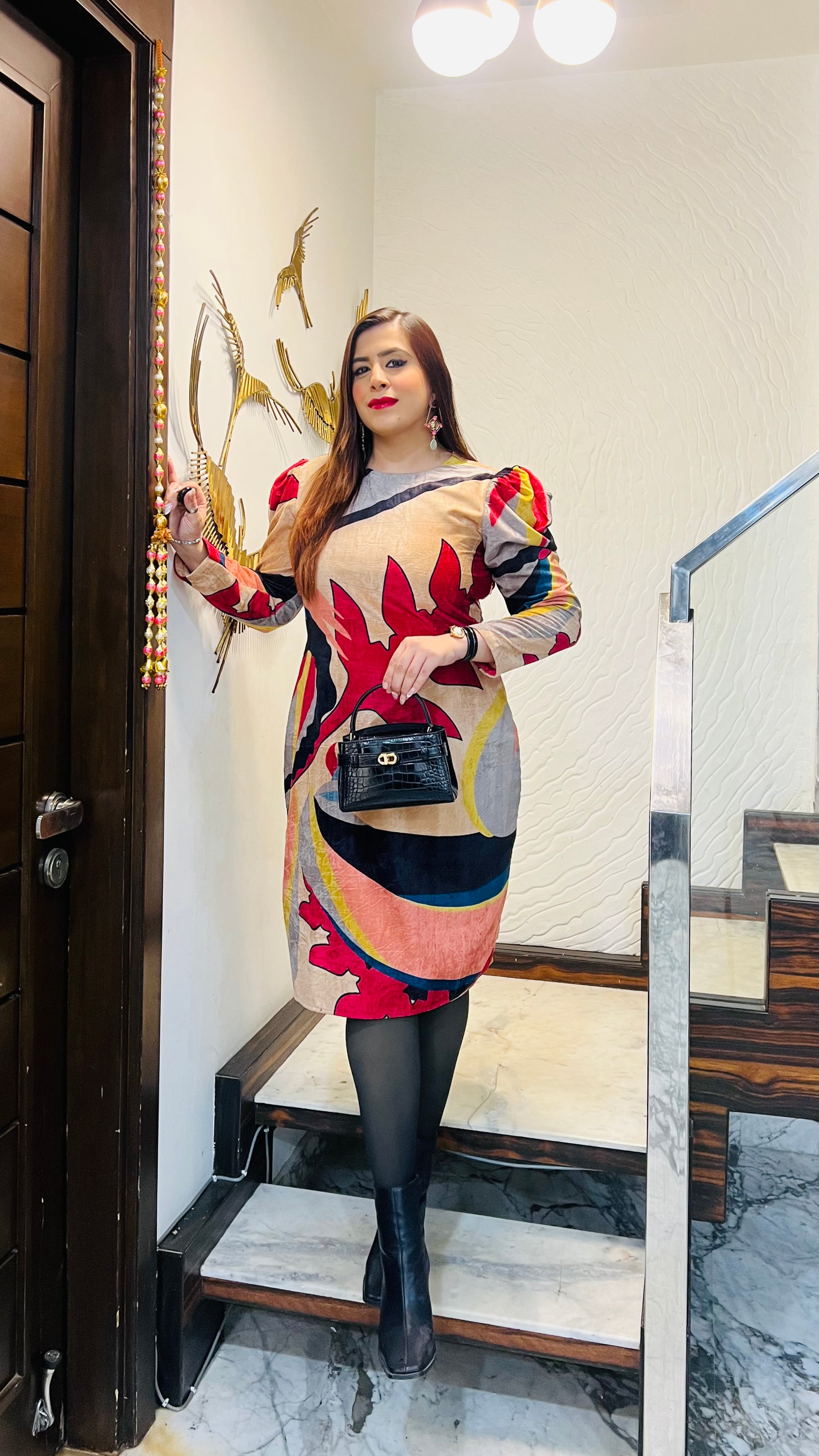 Radiant Versatile Velvet Midi Dress with full Puffy sleeves and a crew neckline. Paired with sheer black tights, ankle boots, and a chic mini bag for a dazzling evening look. ✨🖤