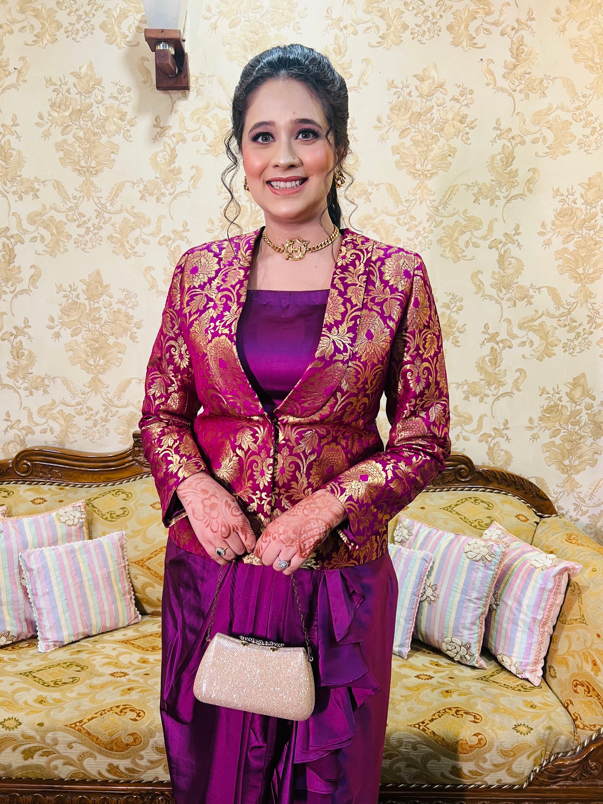 Stylish Violet Banarasi Set with a beautifully Banarasi Blazer š. The ruffled dhoti and statement jewelry add a touch of elegance, making it perfect for festive occasions šāØ. |