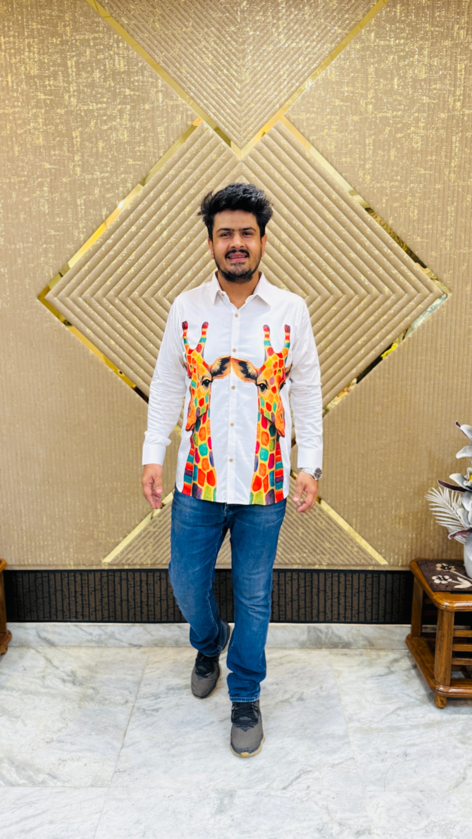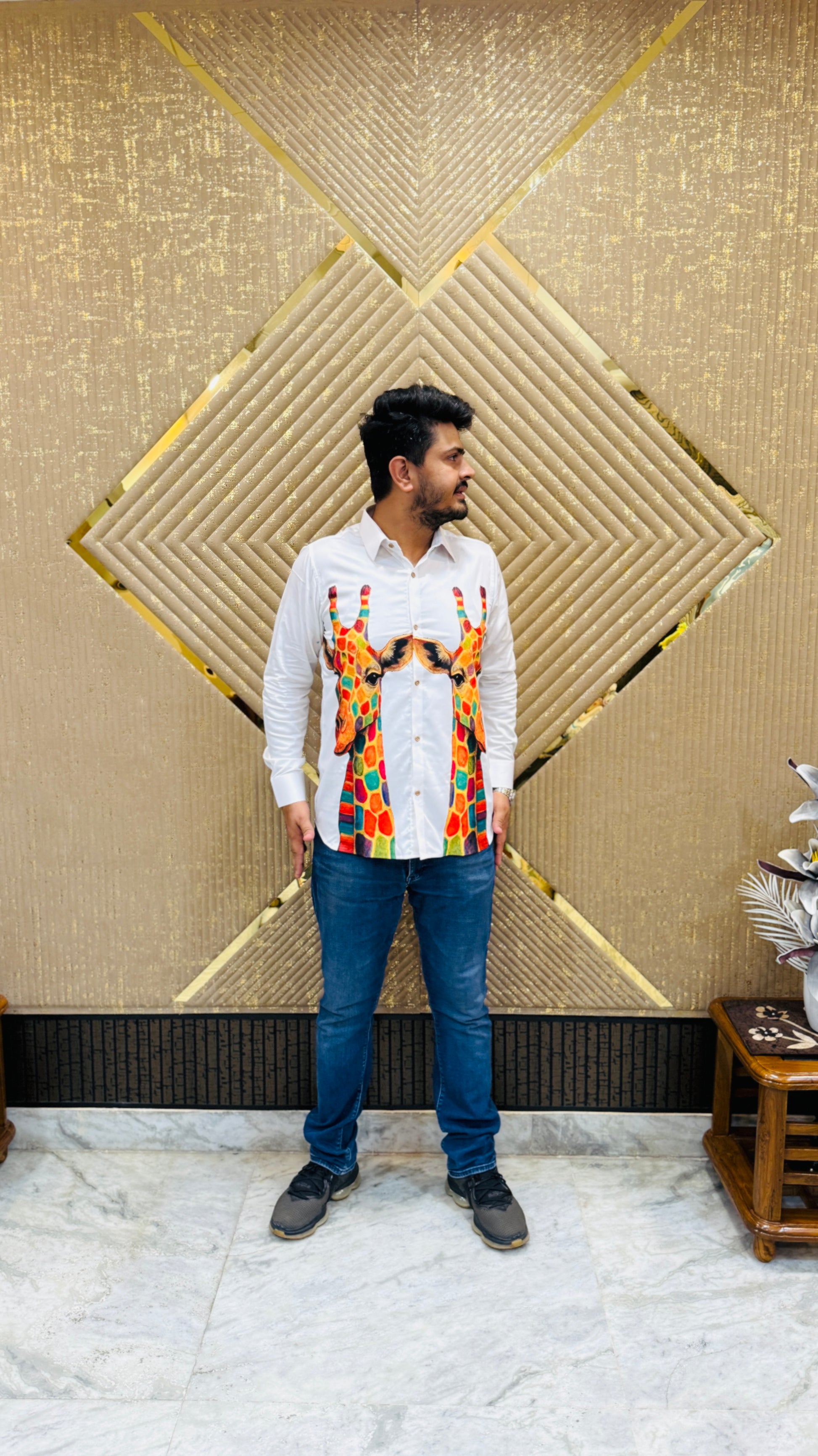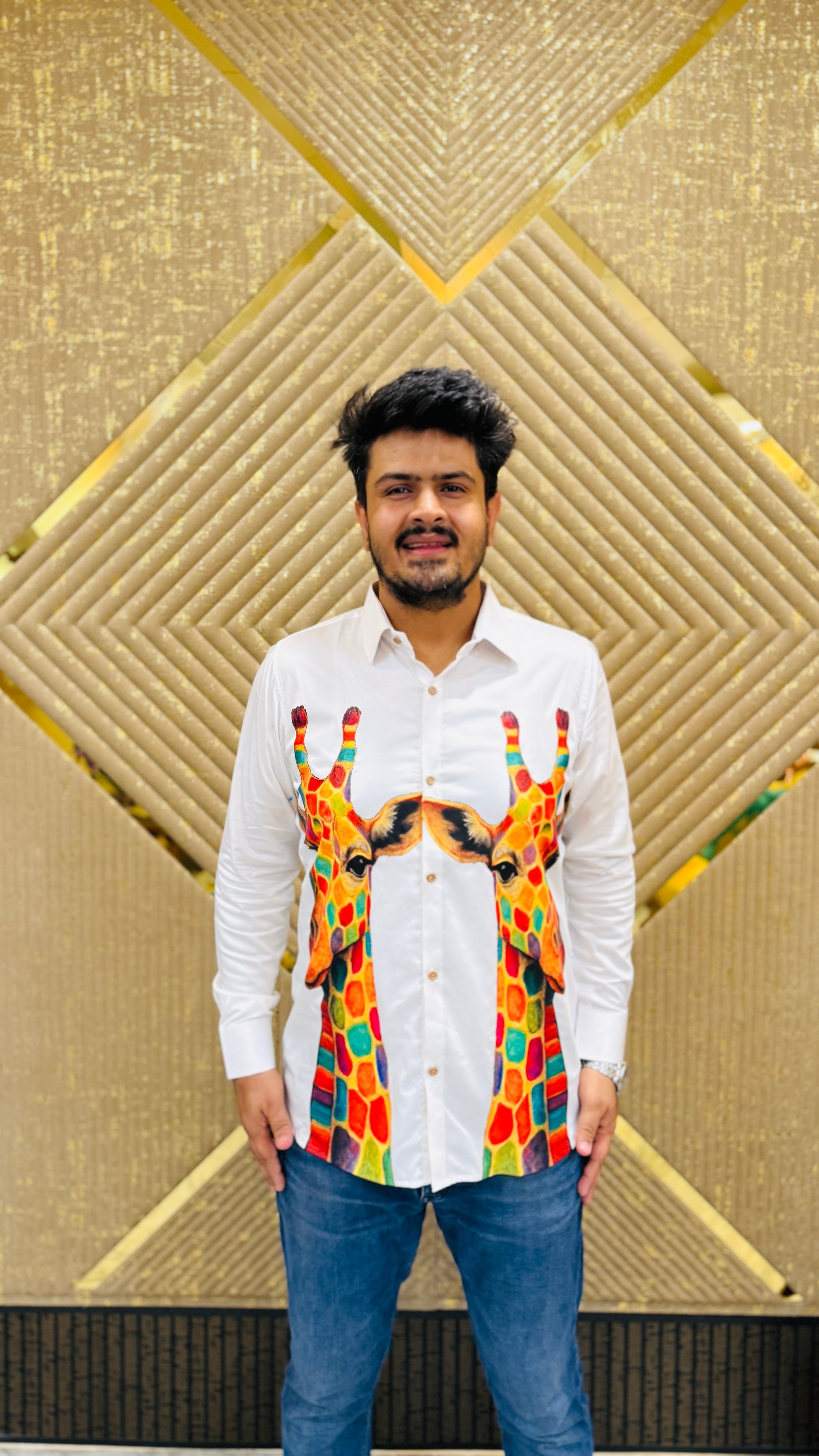 🤍 Bold White Giraffe Shirt featuring vibrant twin giraffe prints 🦒🌈 in multicolored geometric patterns, classic button-down style 👔, and crisp tailoring. A playful yet stylish choice for standout casual looks ✨👖. |