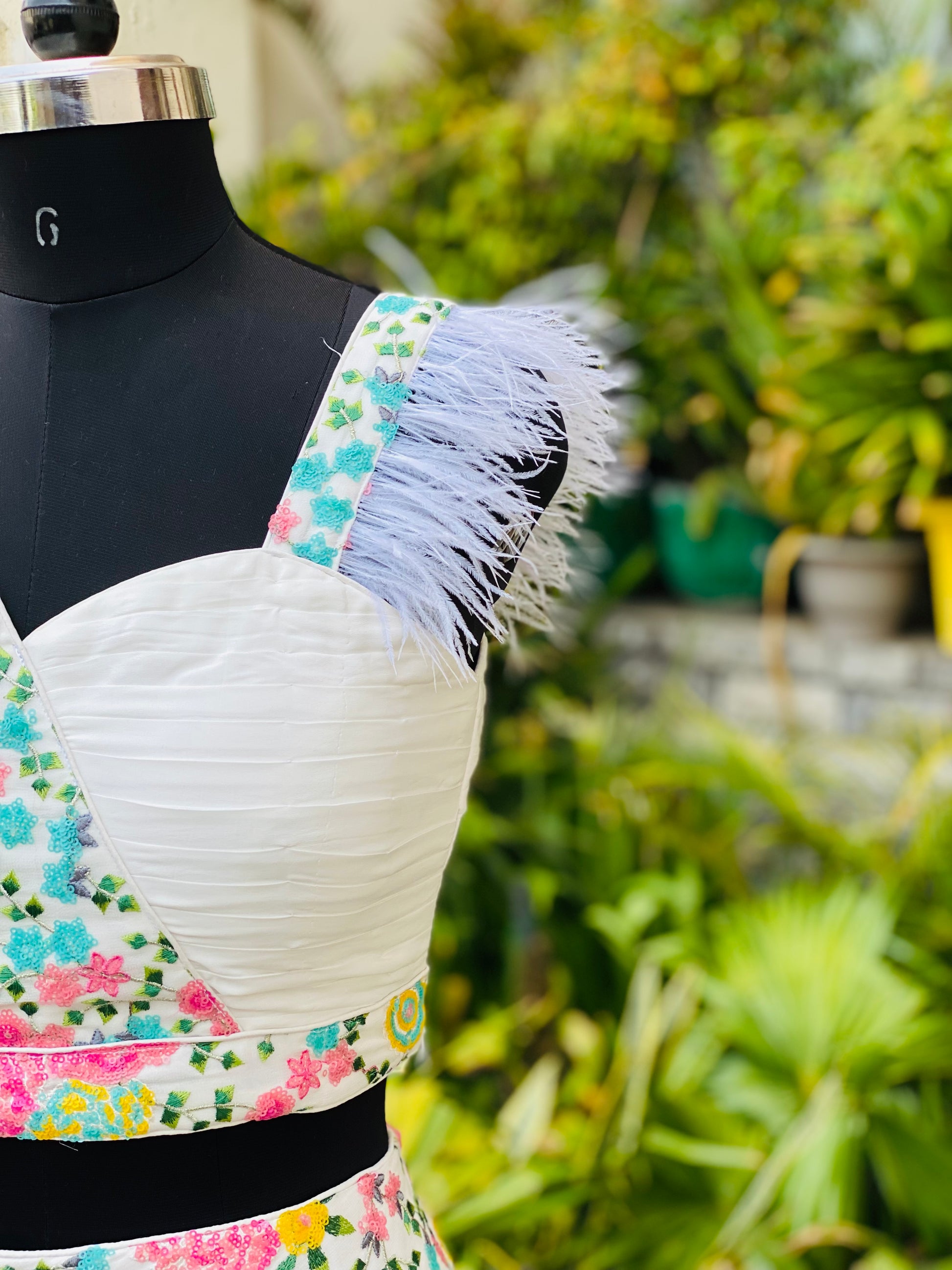 Bright and beautiful for you prettiest ladies’ out there! Blouse is Enhanced with fur on shoulder & Embroidery work.