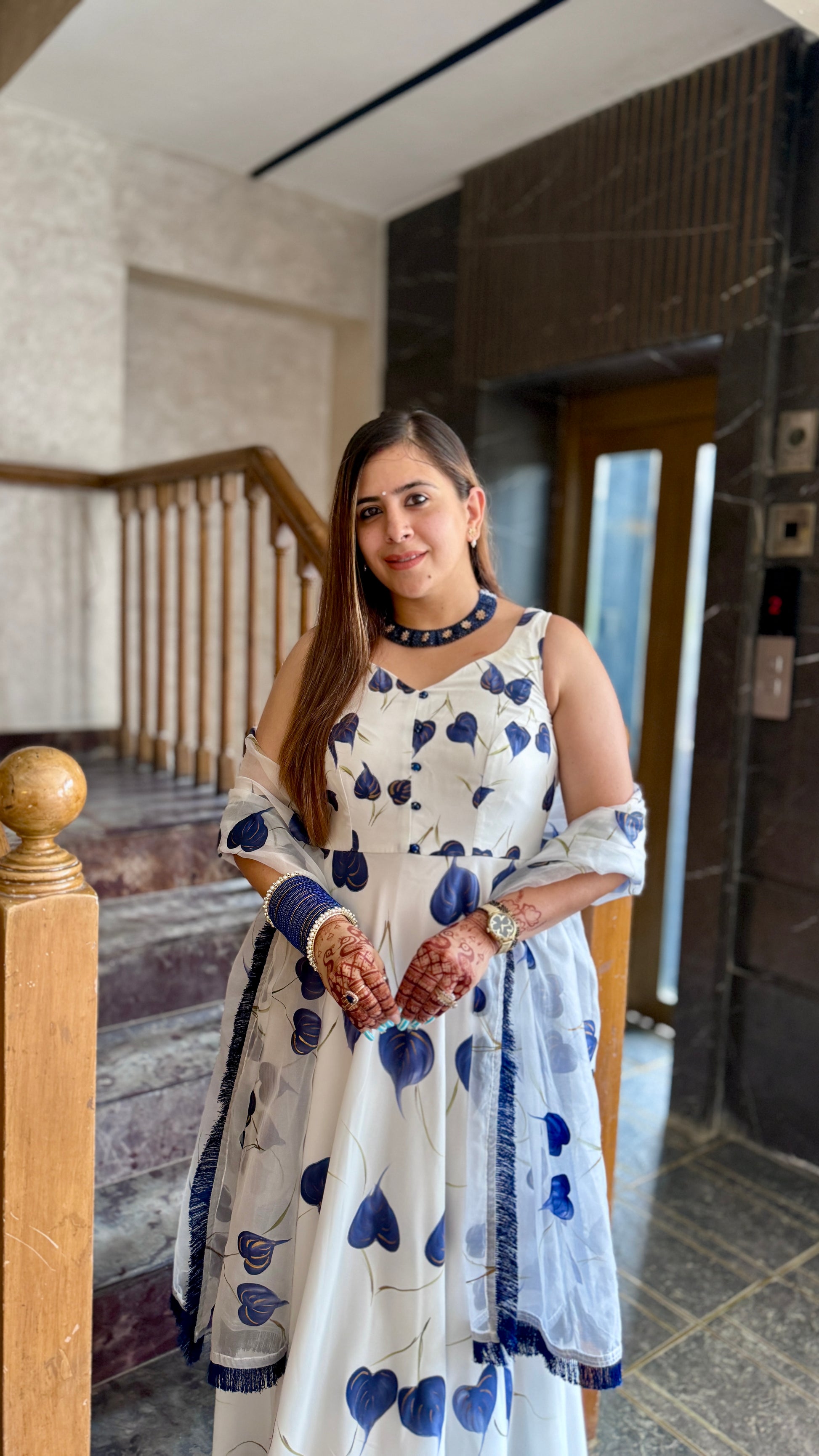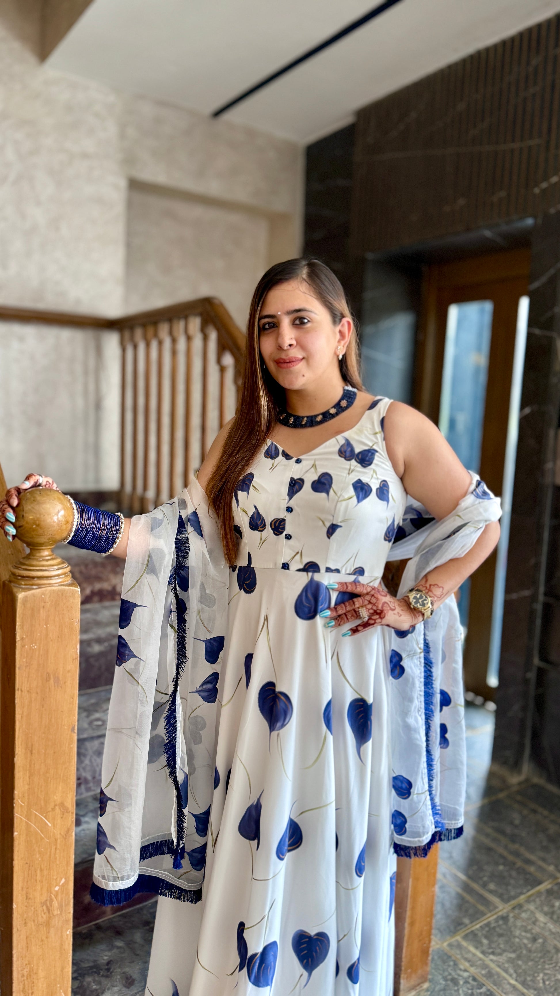 Step into a world of artistic charm with this captivating blue and white leaf hand-painted anarkali, a masterpiece of craftsmanship. 🎨💙 #ArtisticElegance |