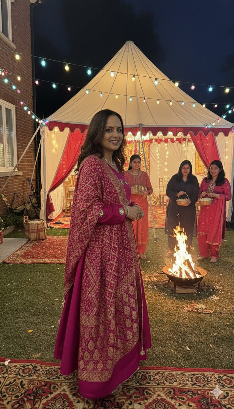 This ensemble creates a stunning visual statement in a vibrant shade of hot pink (magenta). The centerpiece is a floor-length, V-neck silk Anarkali featuring scattered mirror work details on the bodice and long sleeves, adding a playful yet traditional sparkle. The look is elevated by a luxurious Banarasi Bandhani dupatta, intricately woven with heavy gold zari motifs and a broad border that drapes elegantly over the shoulder, contrasting beautifully against the solid silk Anarkali. |