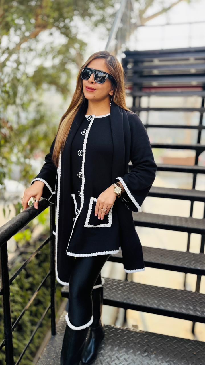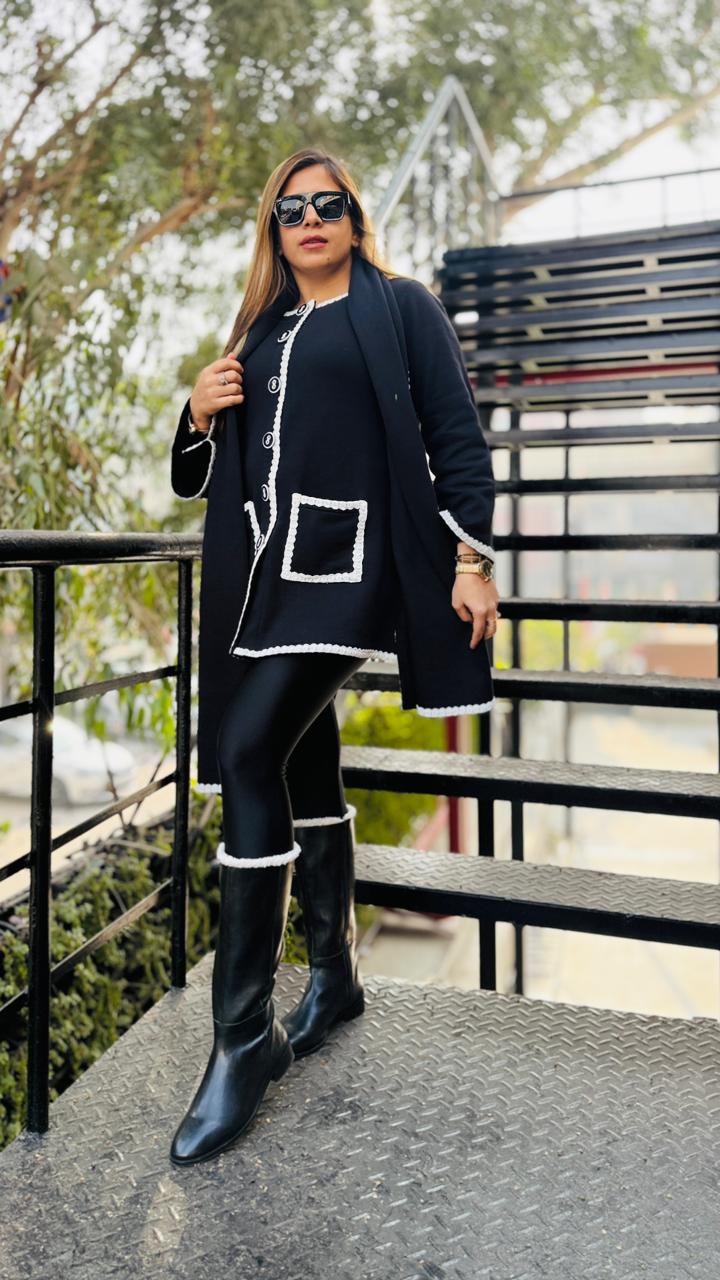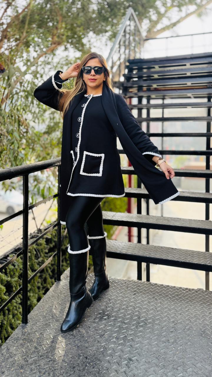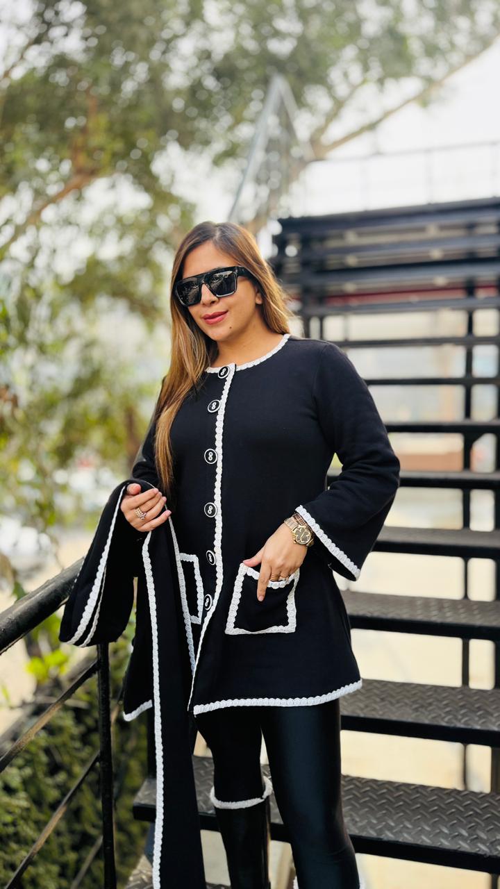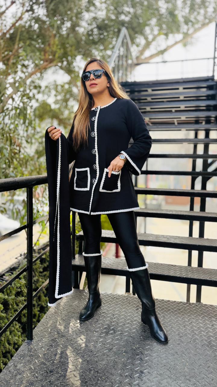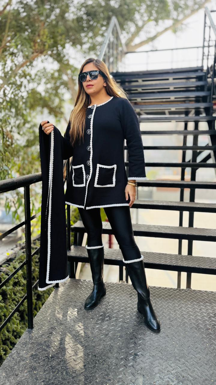 | Description | A timeless black two-piece set featuring a tailored Top paired with a coordinated Stole. Finished with elegant white contrast detailing and a flattering silhouette, this Lakhina Couture ensemble blends power dressing with effortless sophistication—perfect for winter brunches, workdays and elevated everyday wear |