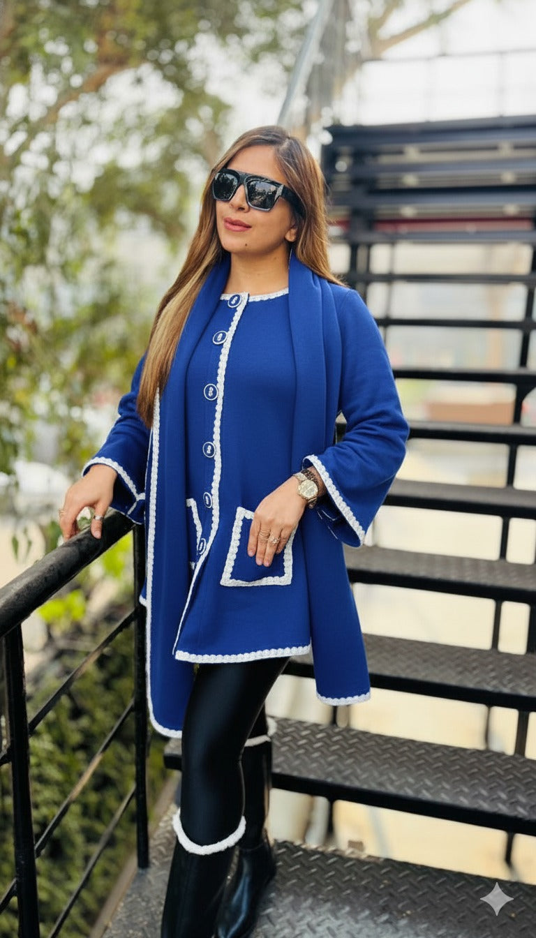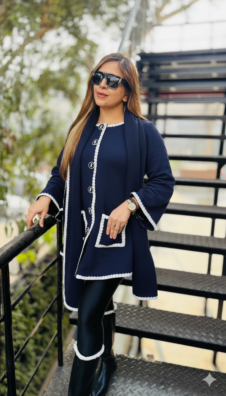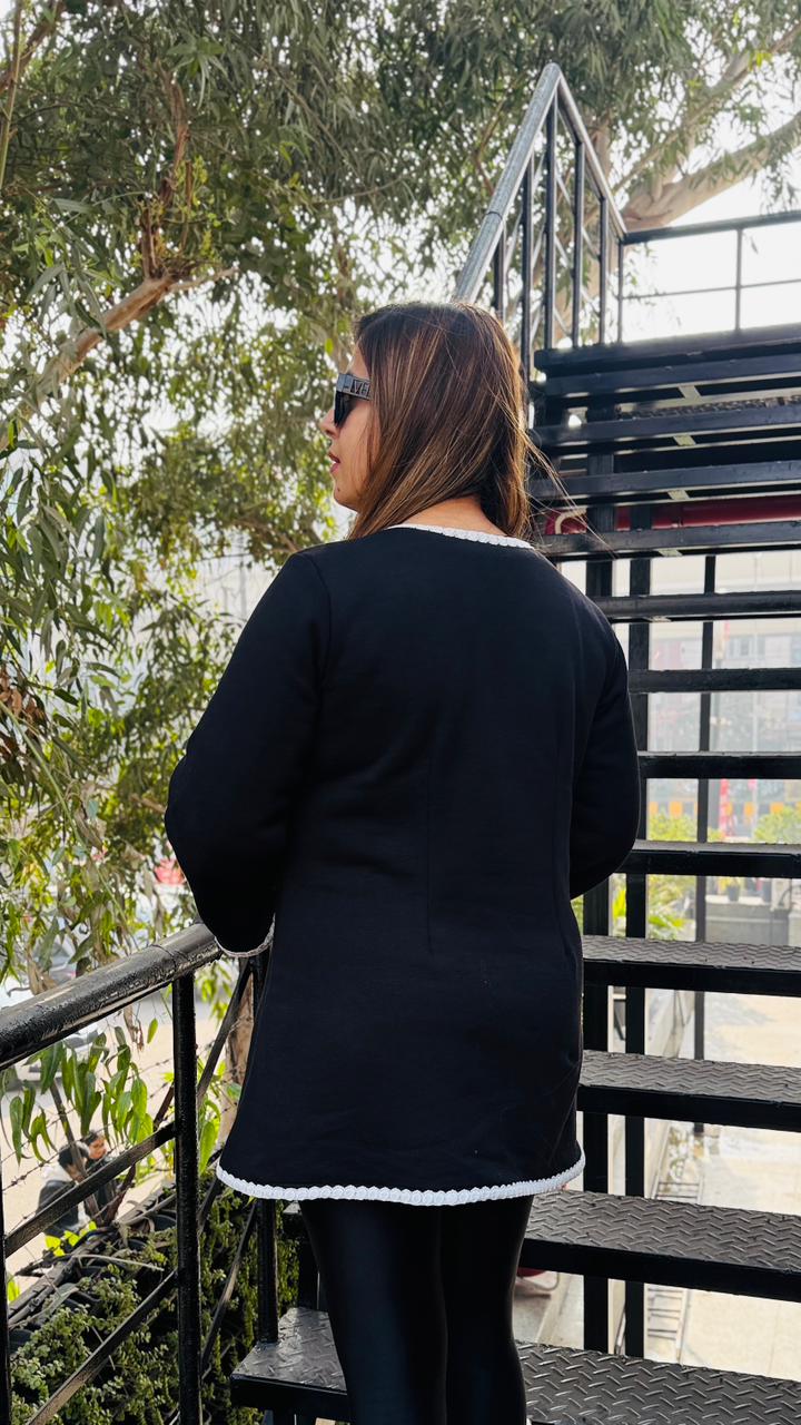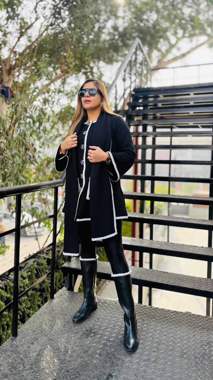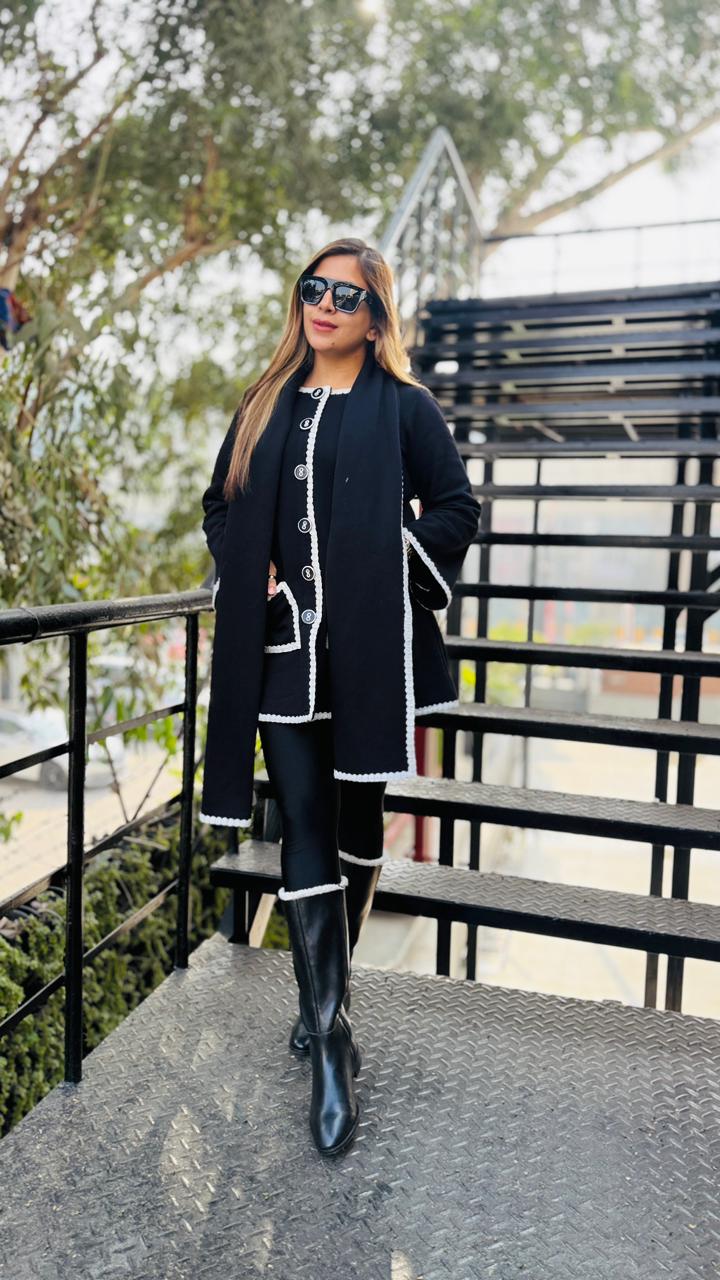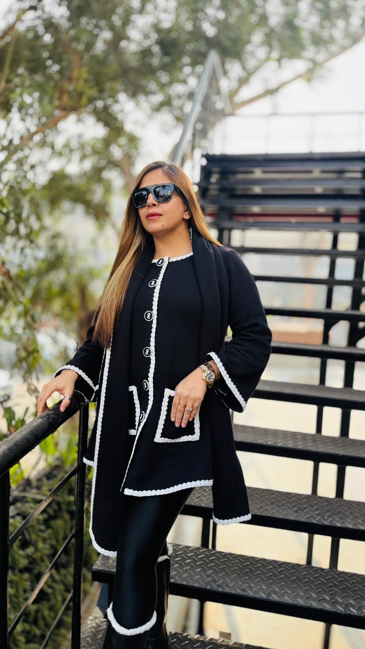 | Description | A timeless black two-piece set featuring a tailored Top paired with a coordinated Stole. Finished with elegant white contrast detailing and a flattering silhouette, this Lakhina Couture ensemble blends power dressing with effortless sophistication—perfect for winter brunches, workdays and elevated everyday wear |