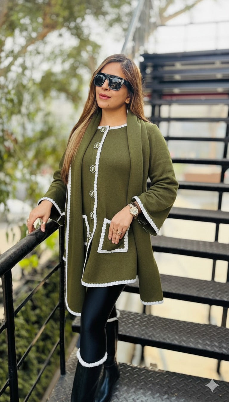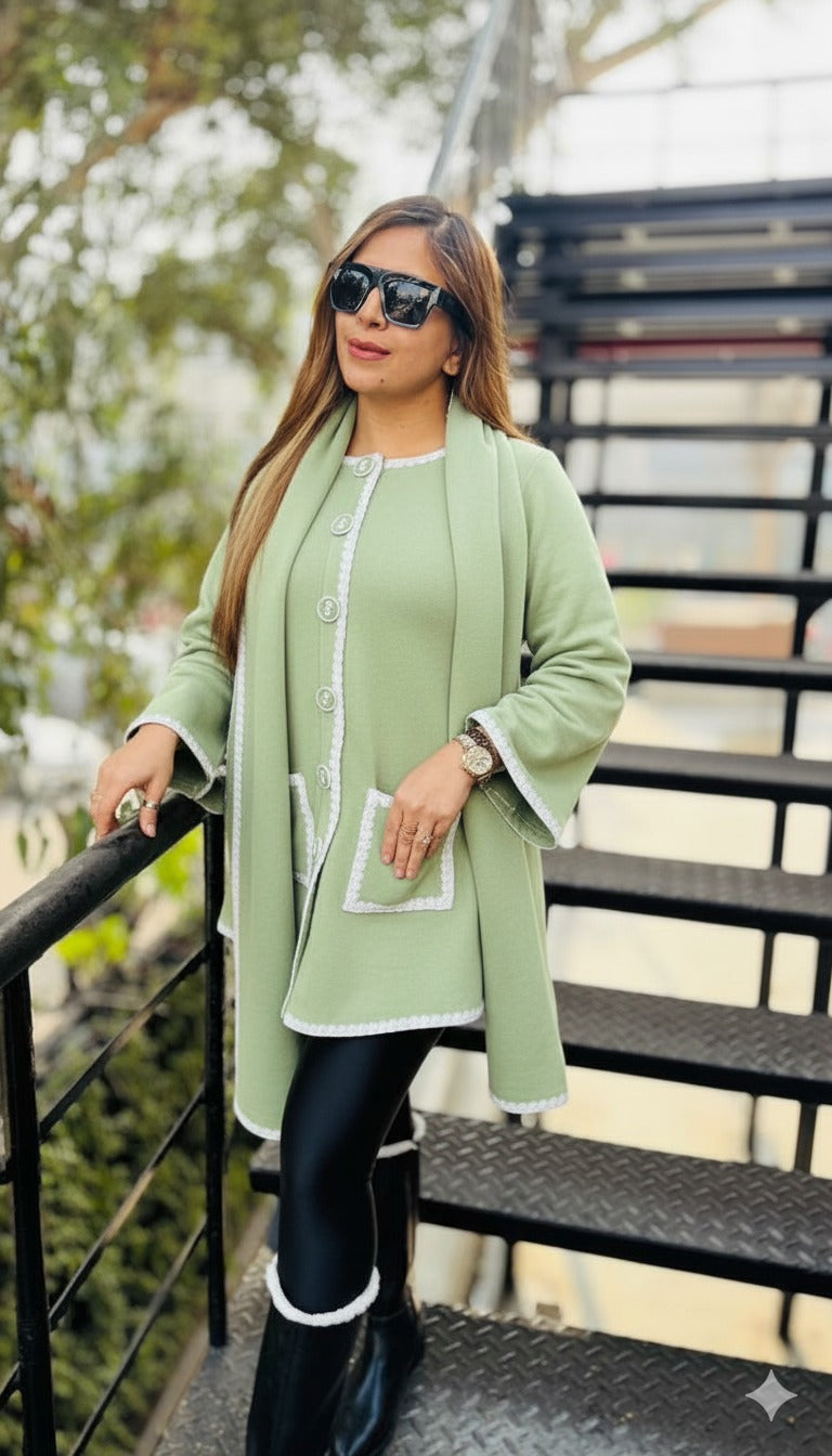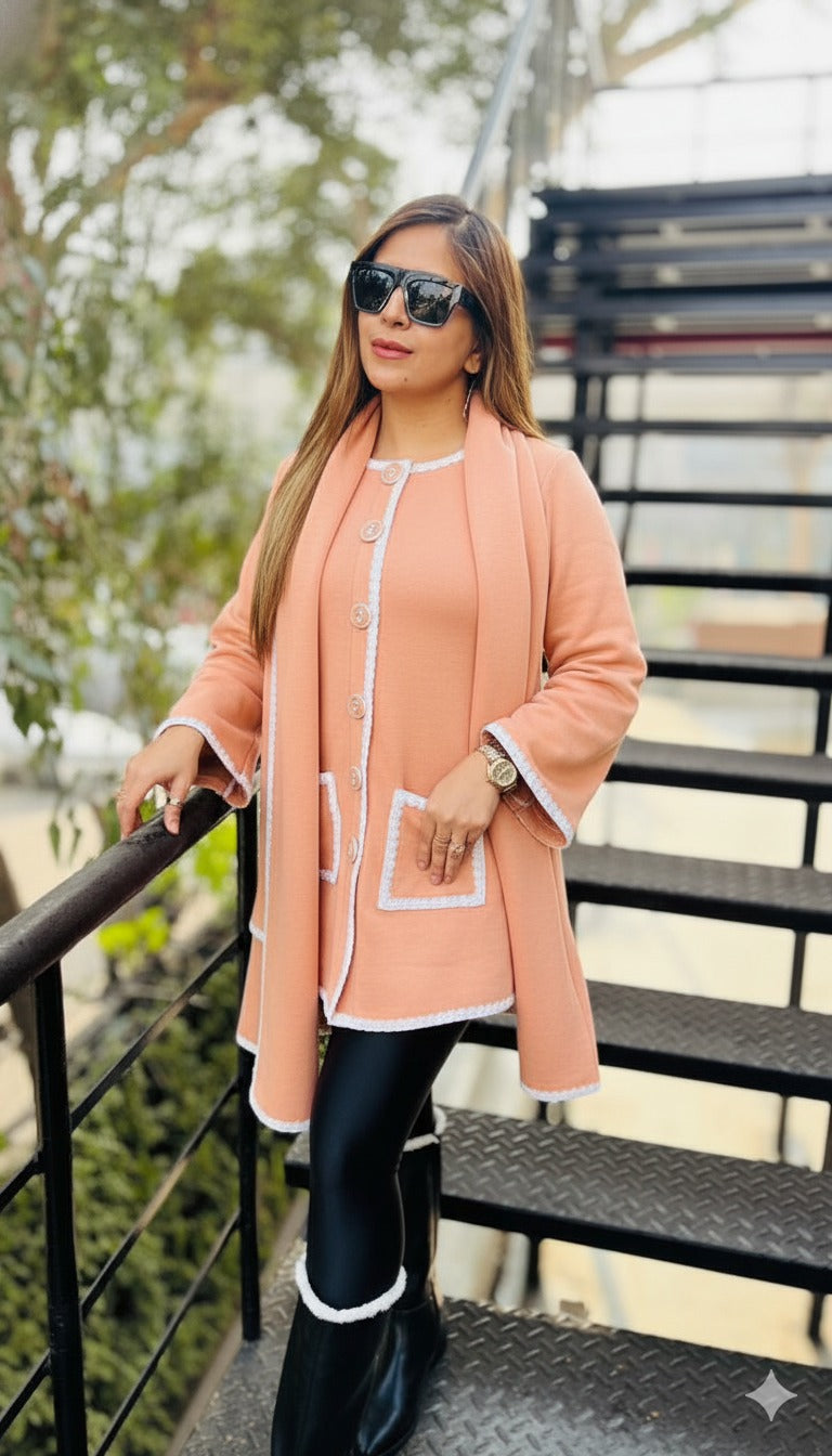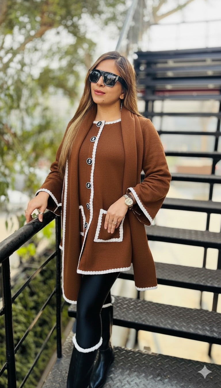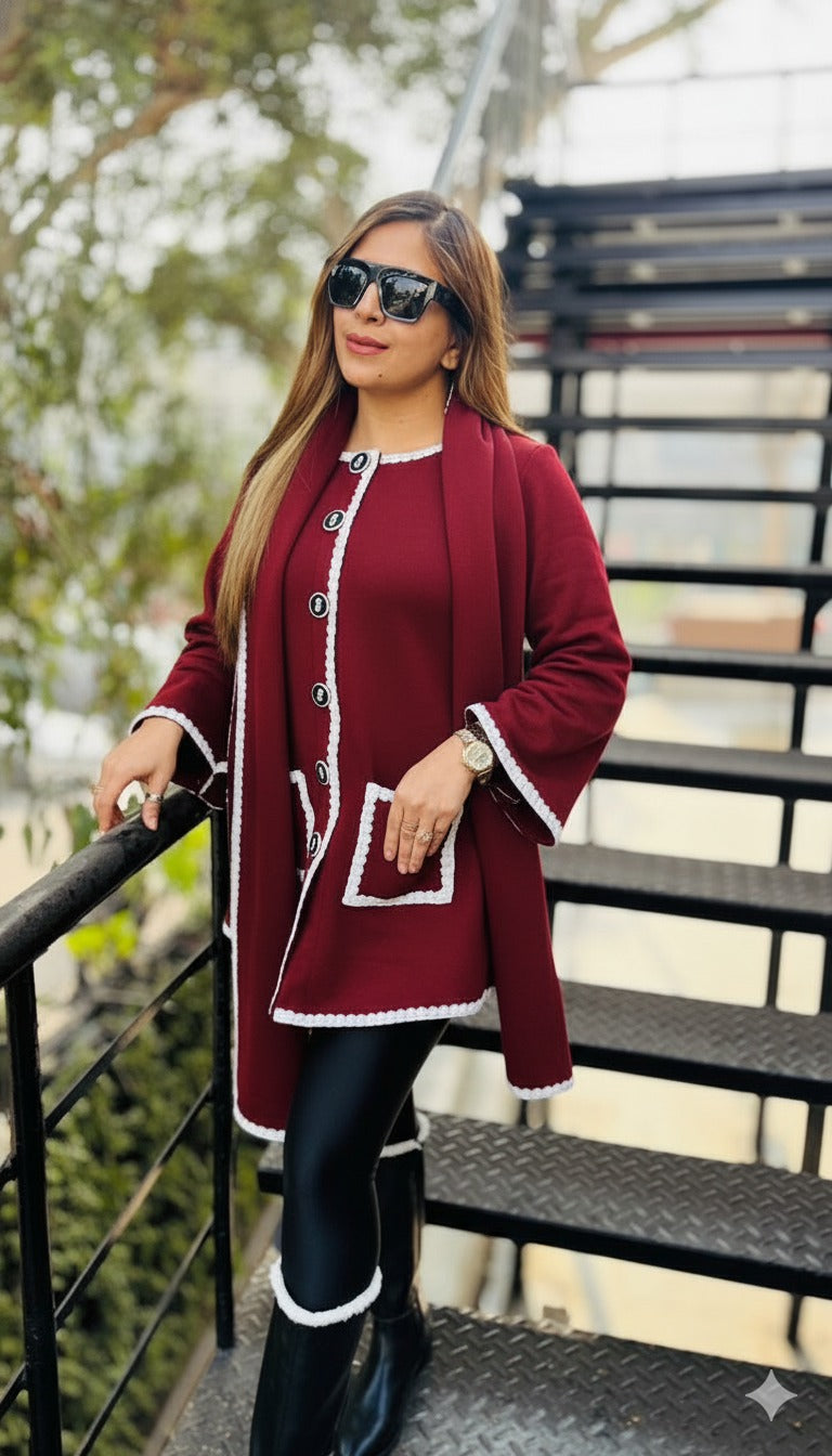| Description | A timeless black two-piece set featuring a tailored Top paired with a coordinated Stole. Finished with elegant white contrast detailing and a flattering silhouette, this Lakhina Couture ensemble blends power dressing with effortless sophistication—perfect for winter brunches, workdays and elevated everyday wear |