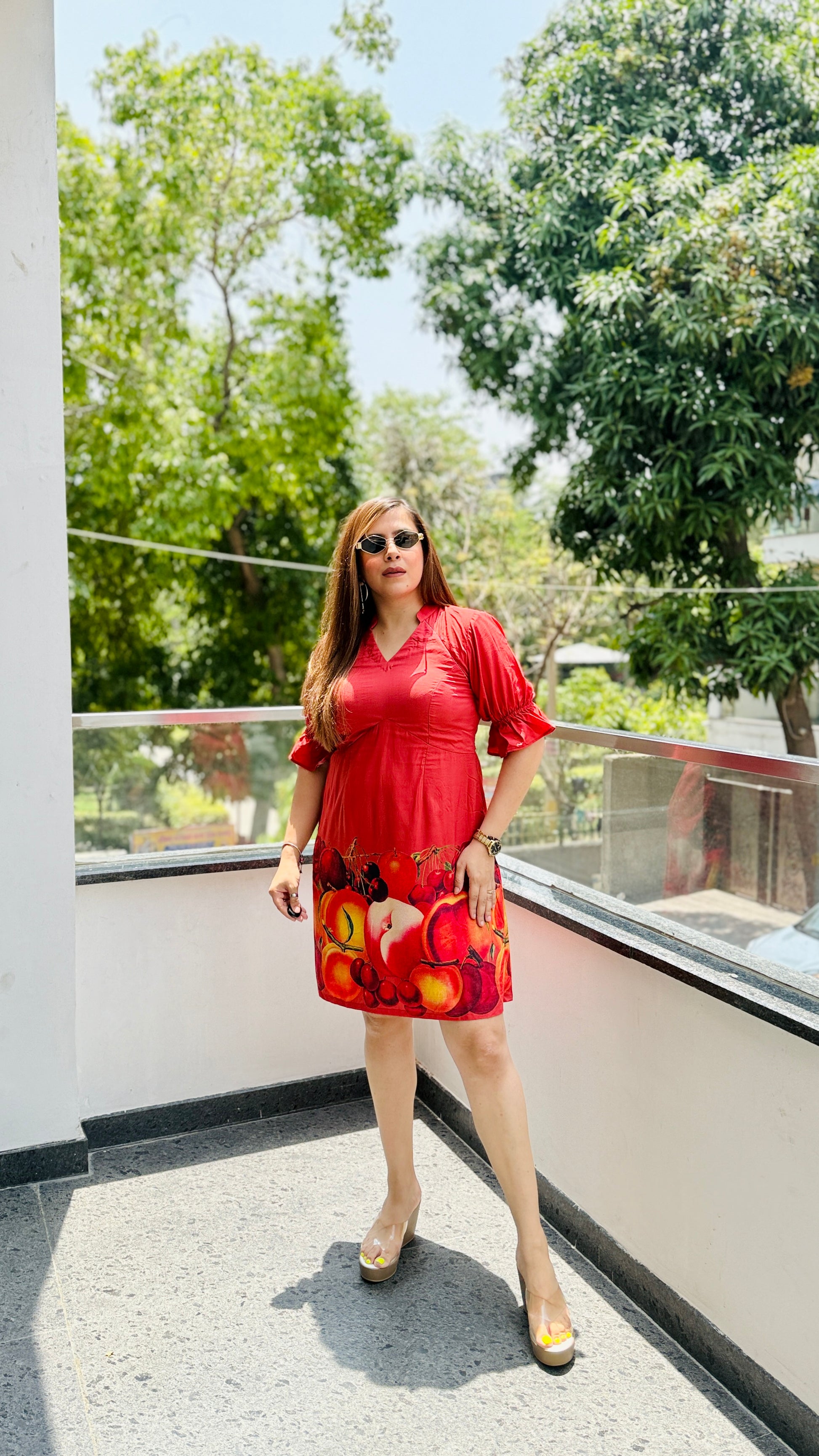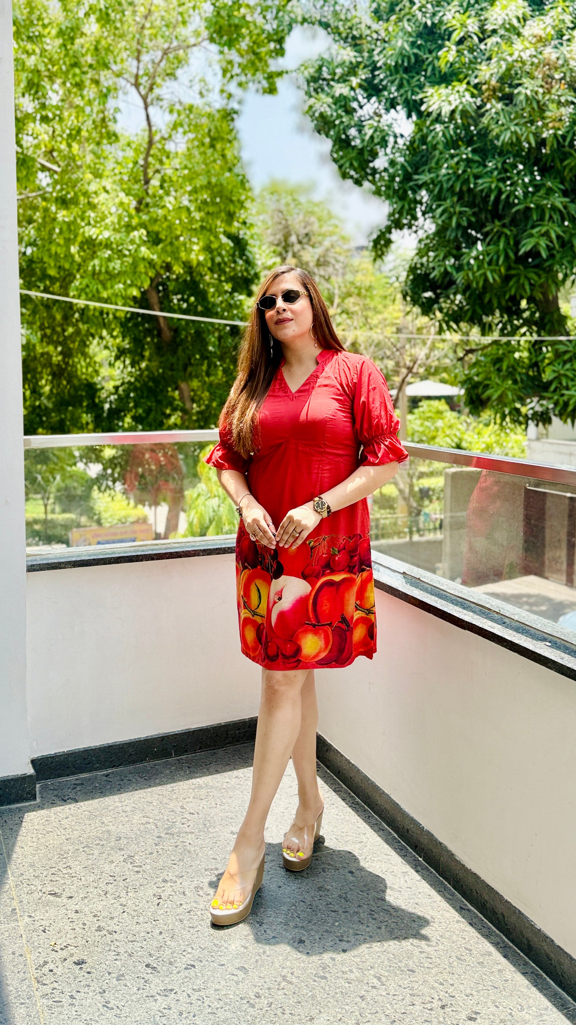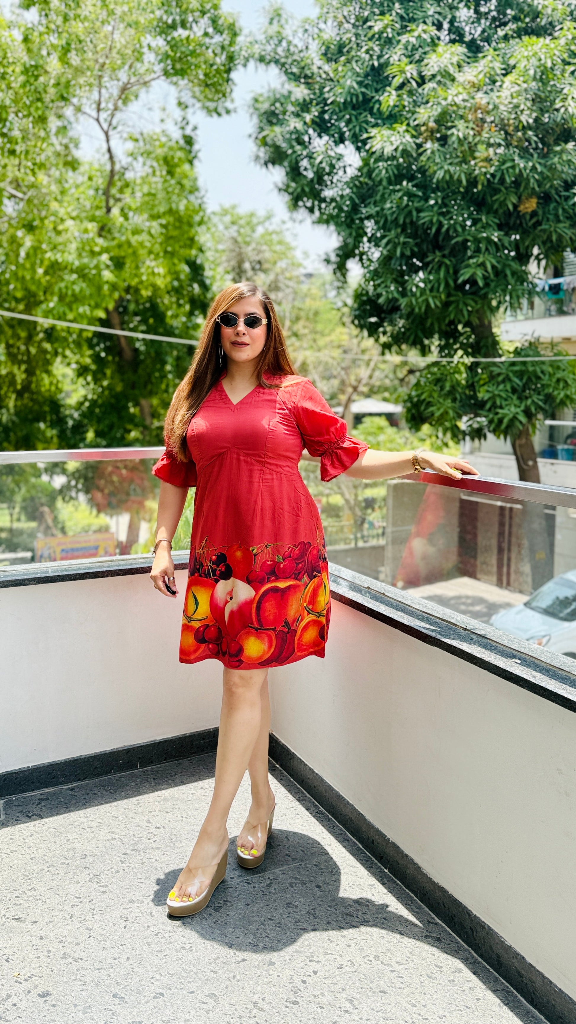 Say hello to the Apple of Mauritius Dress 🍎🌴—a vibrant red mini dress featuring ruched sleeves and a bold fruit print hem. Playful, tropical, and effortlessly chic for sunny days! ☀️🍒 |