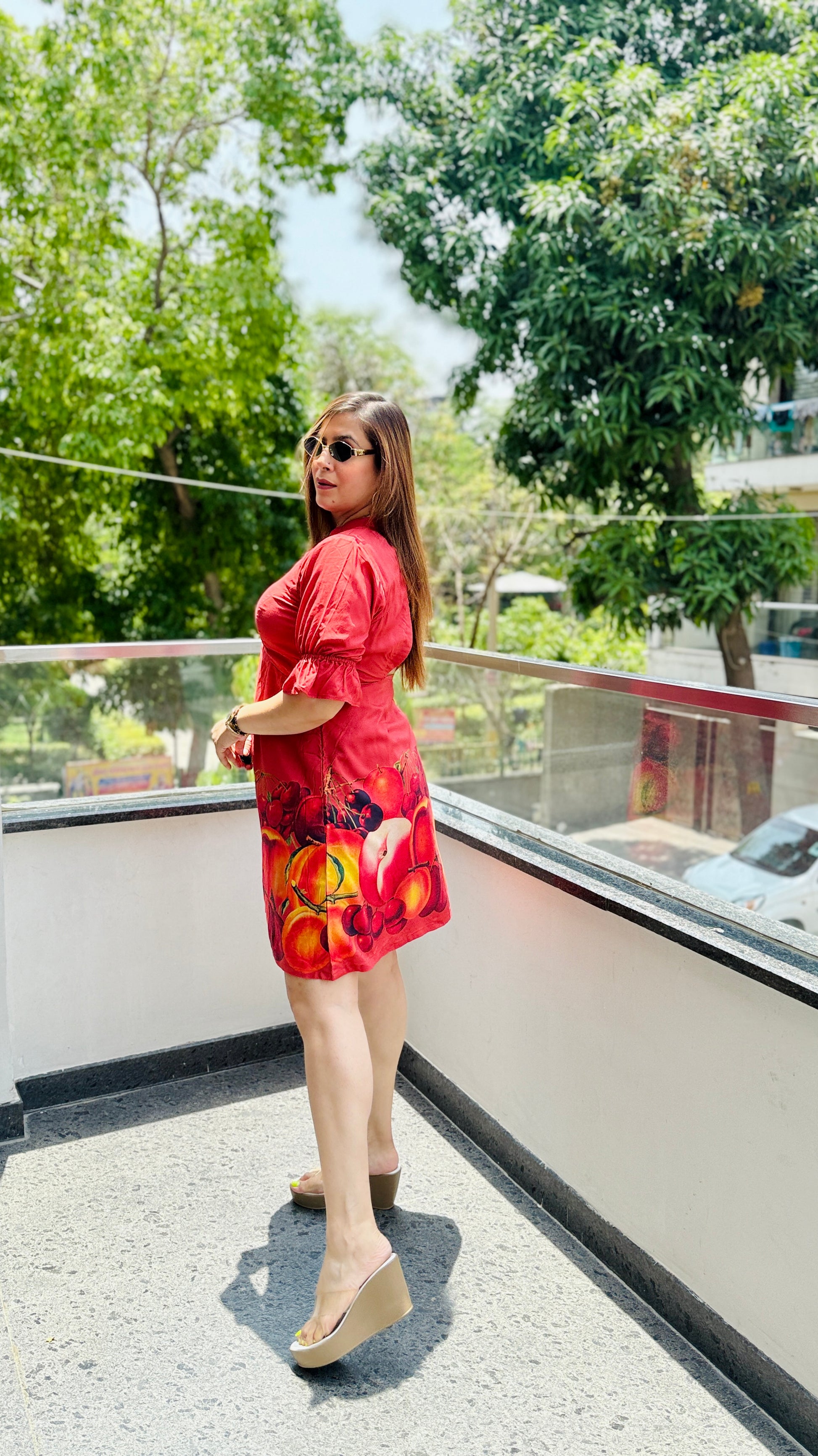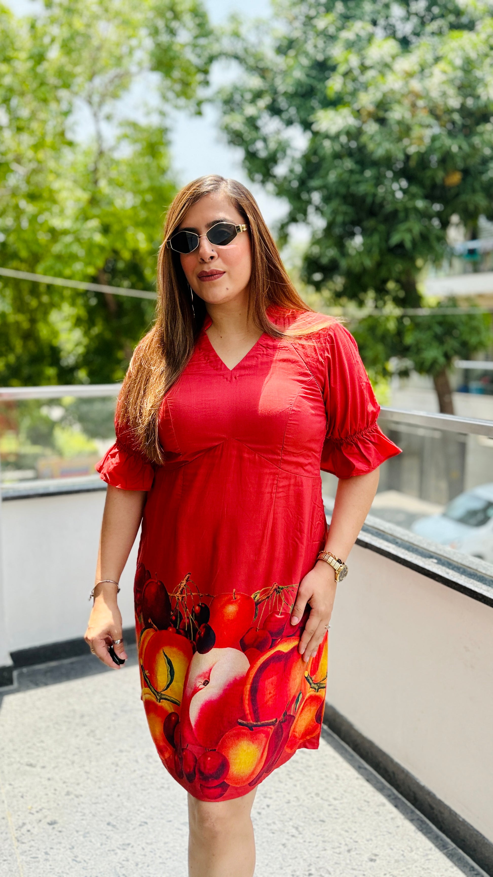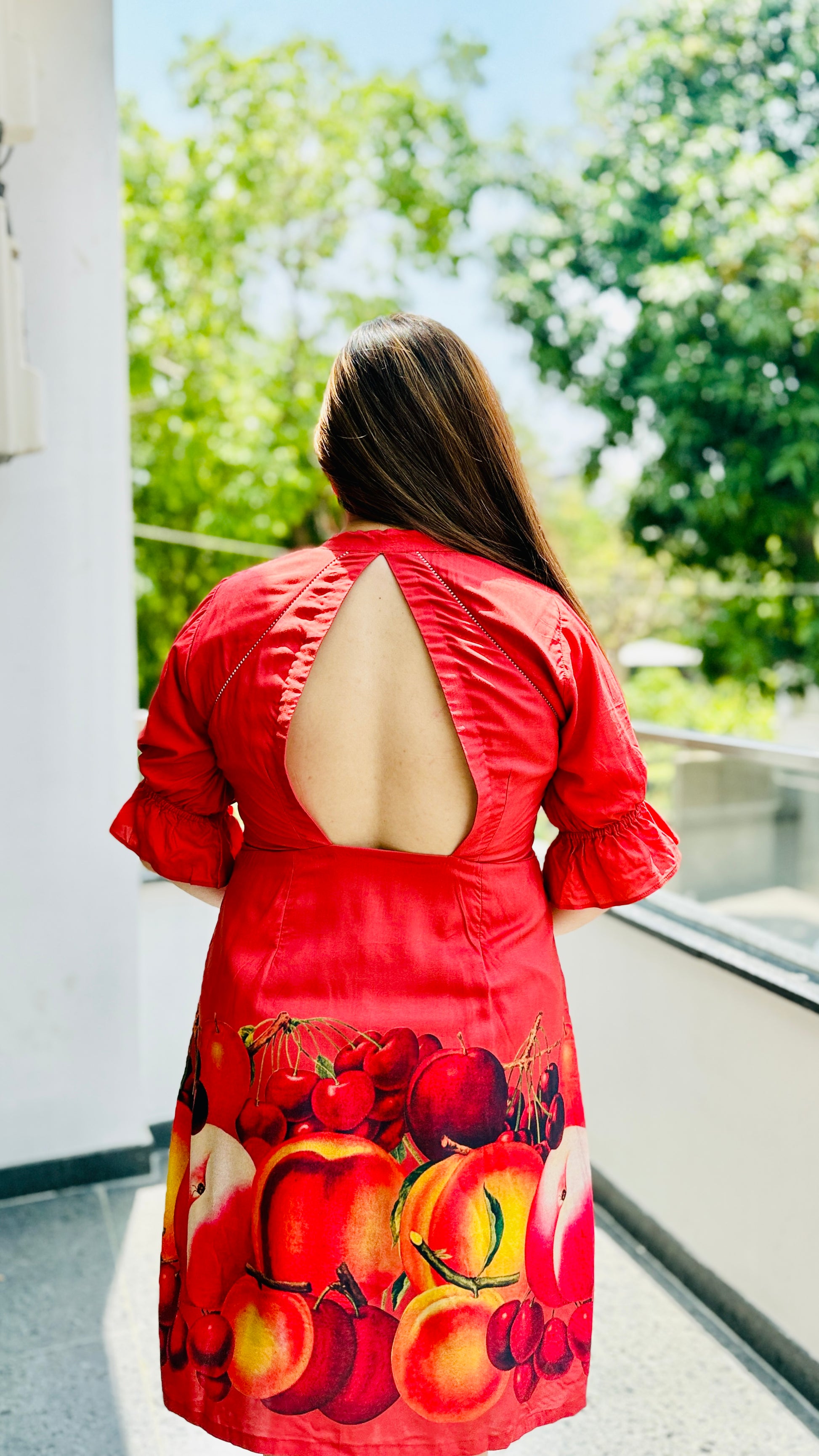 Say hello to the Apple of Mauritius Dress 🍎🌴—a vibrant red mini dress featuring ruched sleeves and a bold fruit print hem. Playful, tropical, and effortlessly chic for sunny days! ☀️🍒 |