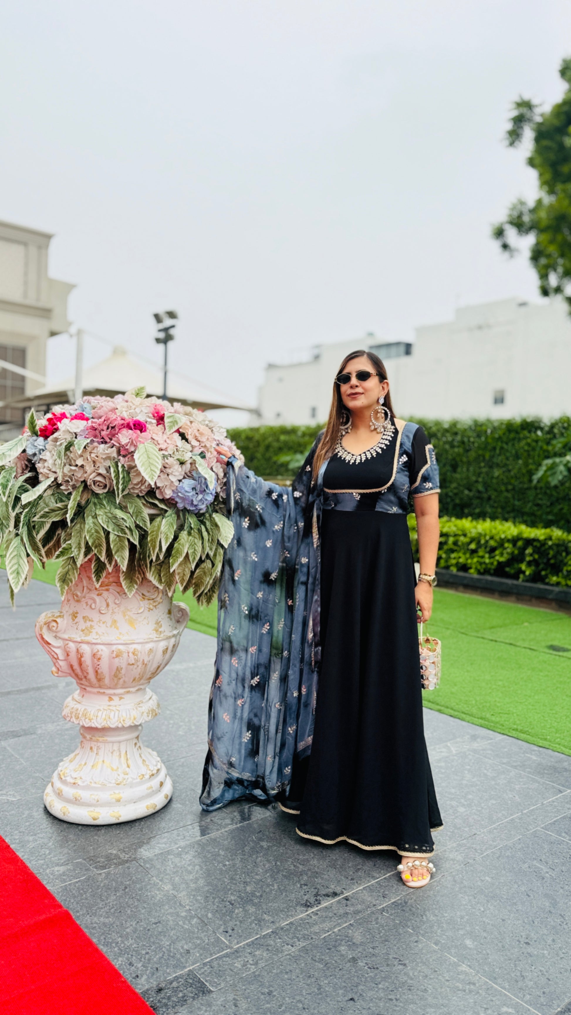 Own the spotlight in this Black Babe Anarkali🖤✨ Featuring mirror work neckline, printed shrug, and a flowy silhouette paired with a shimmery dupatta 🌙💫 Perfect for night weddings or festive glam! 👠👜 |