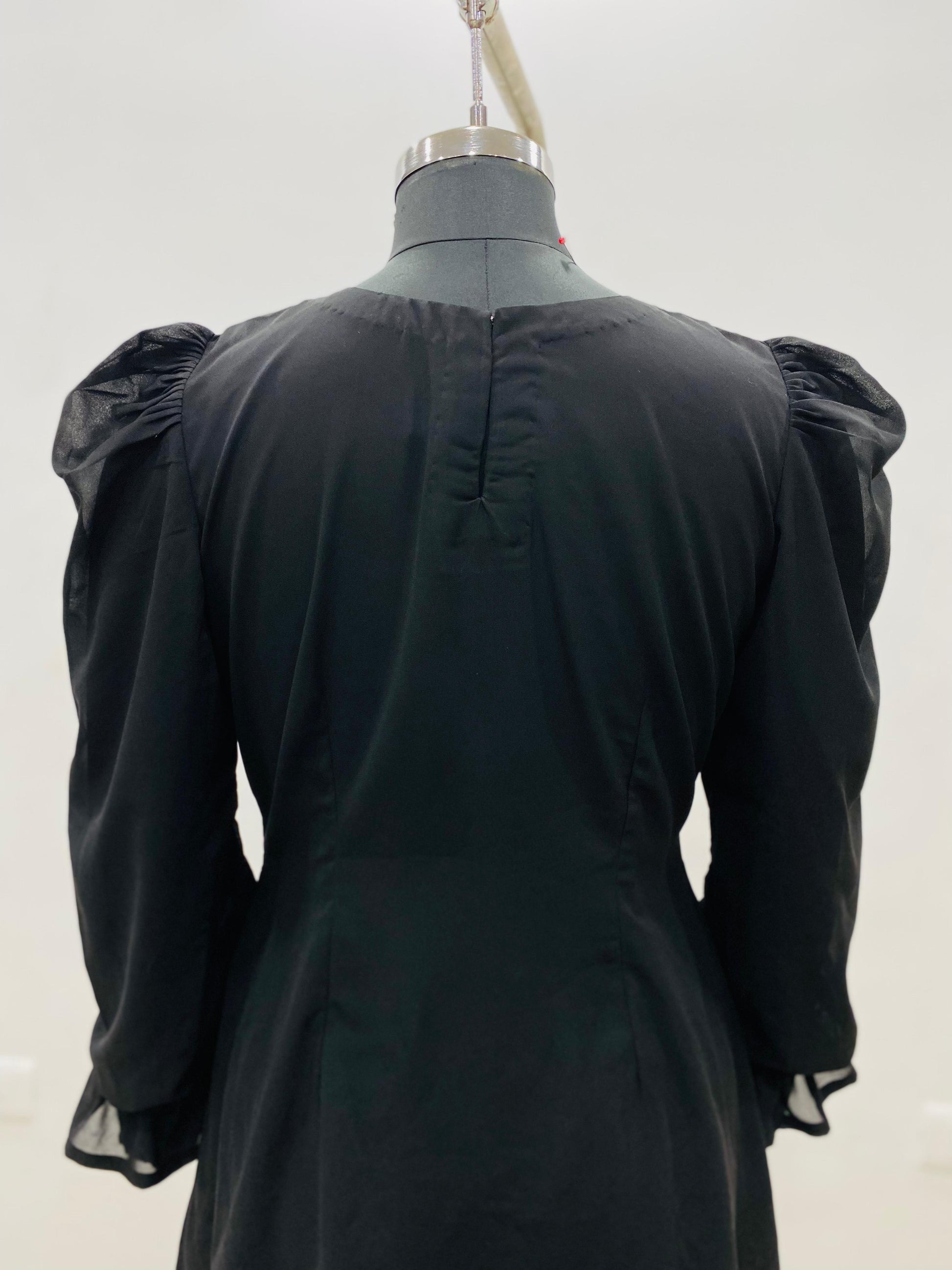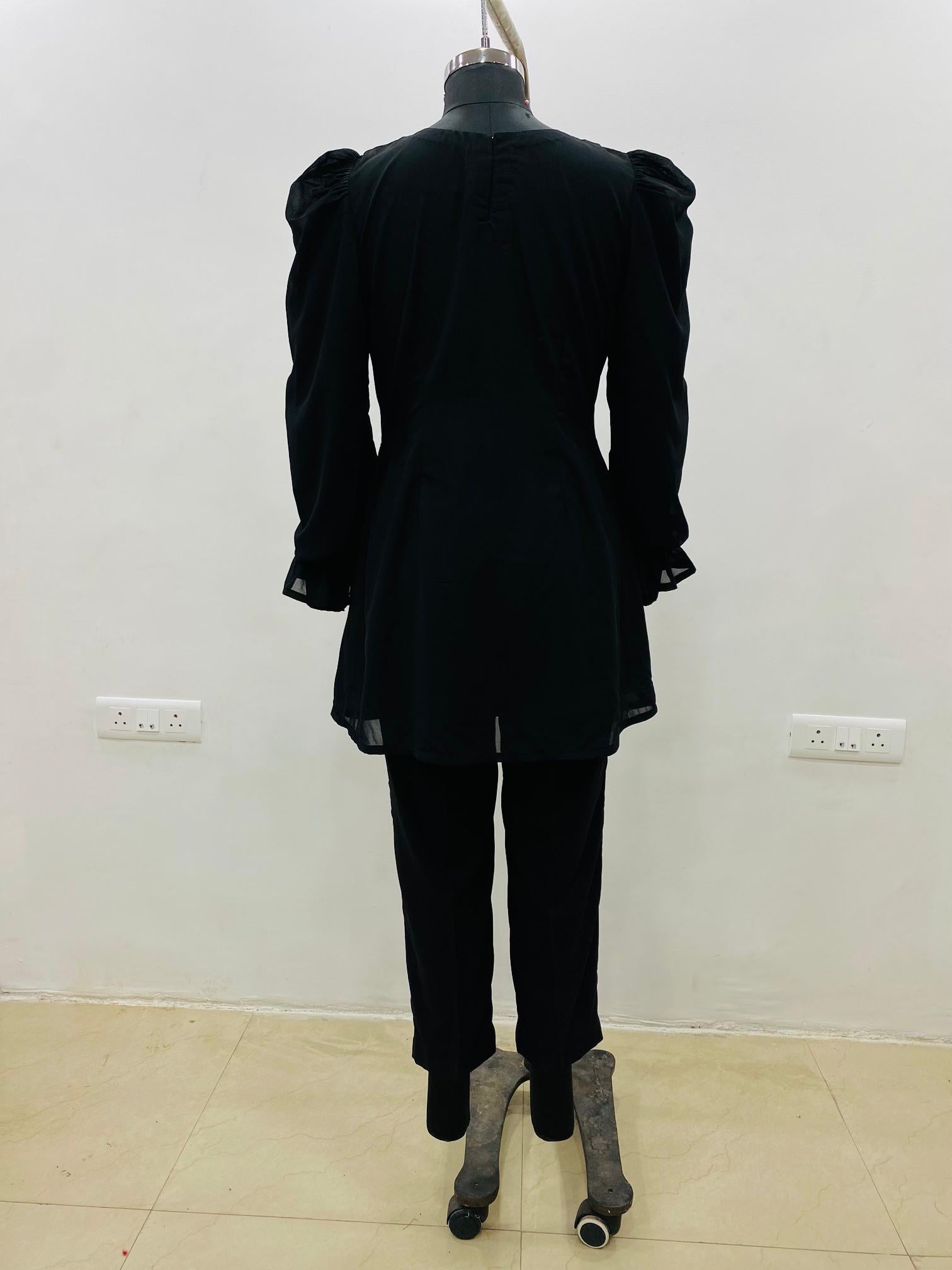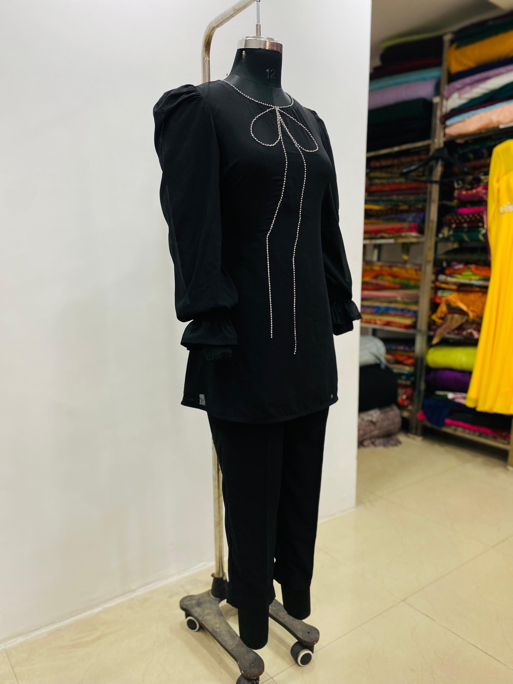 Black Bow Co-Ord 💙 featuring an elegant tunic adorned with a sparkling bow design ✨ and matching pants 👖. Styled with metallic silver heels 👠 and a dazzling clutch ✨. |