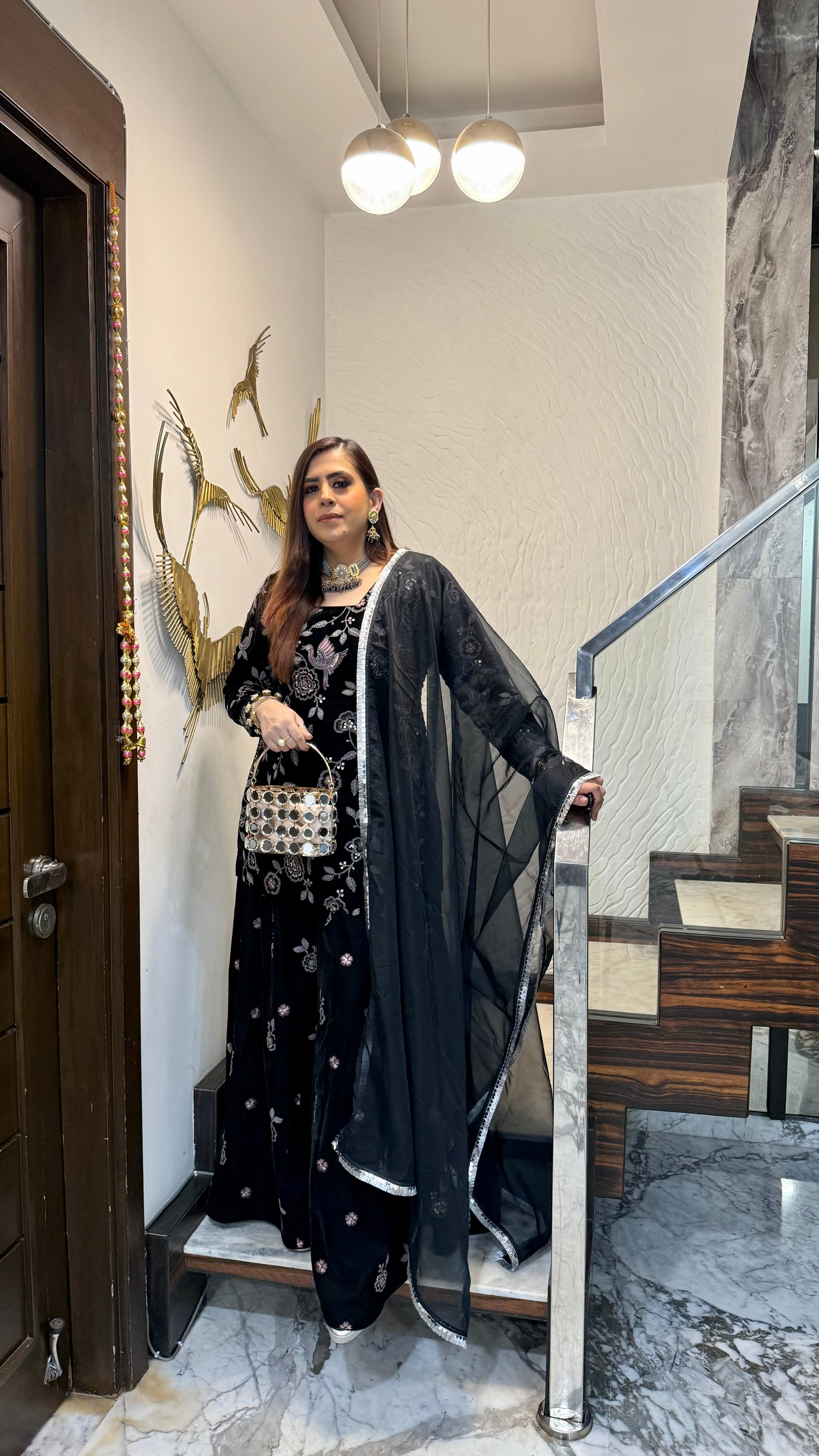 This black magic sharara suit features intricate floral embroidery, a flowy dupatta with silver edging, and a glamorous silhouette. Perfect for festive evenings, it radiates elegance and charm. 🖤✨🌸 |