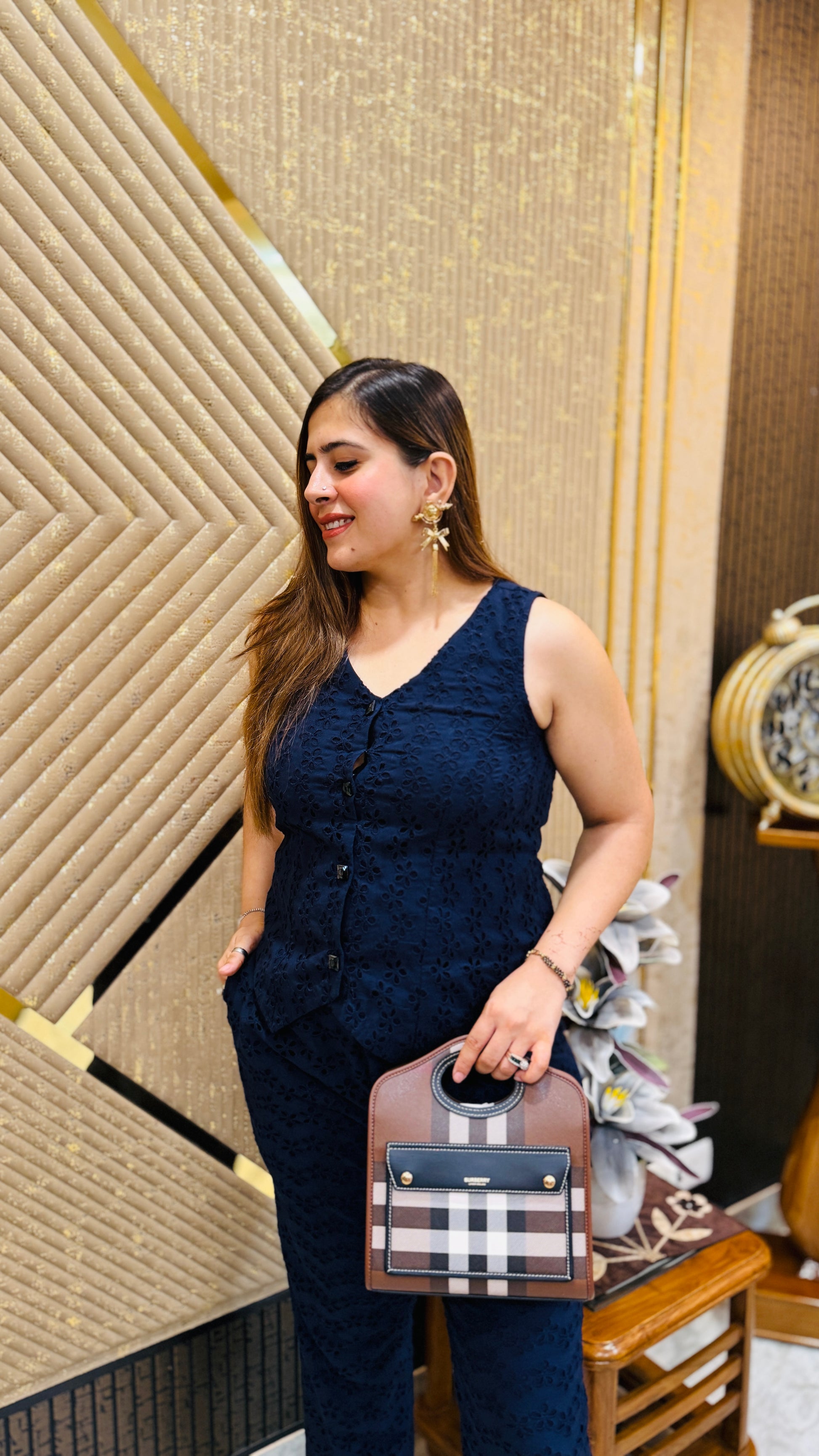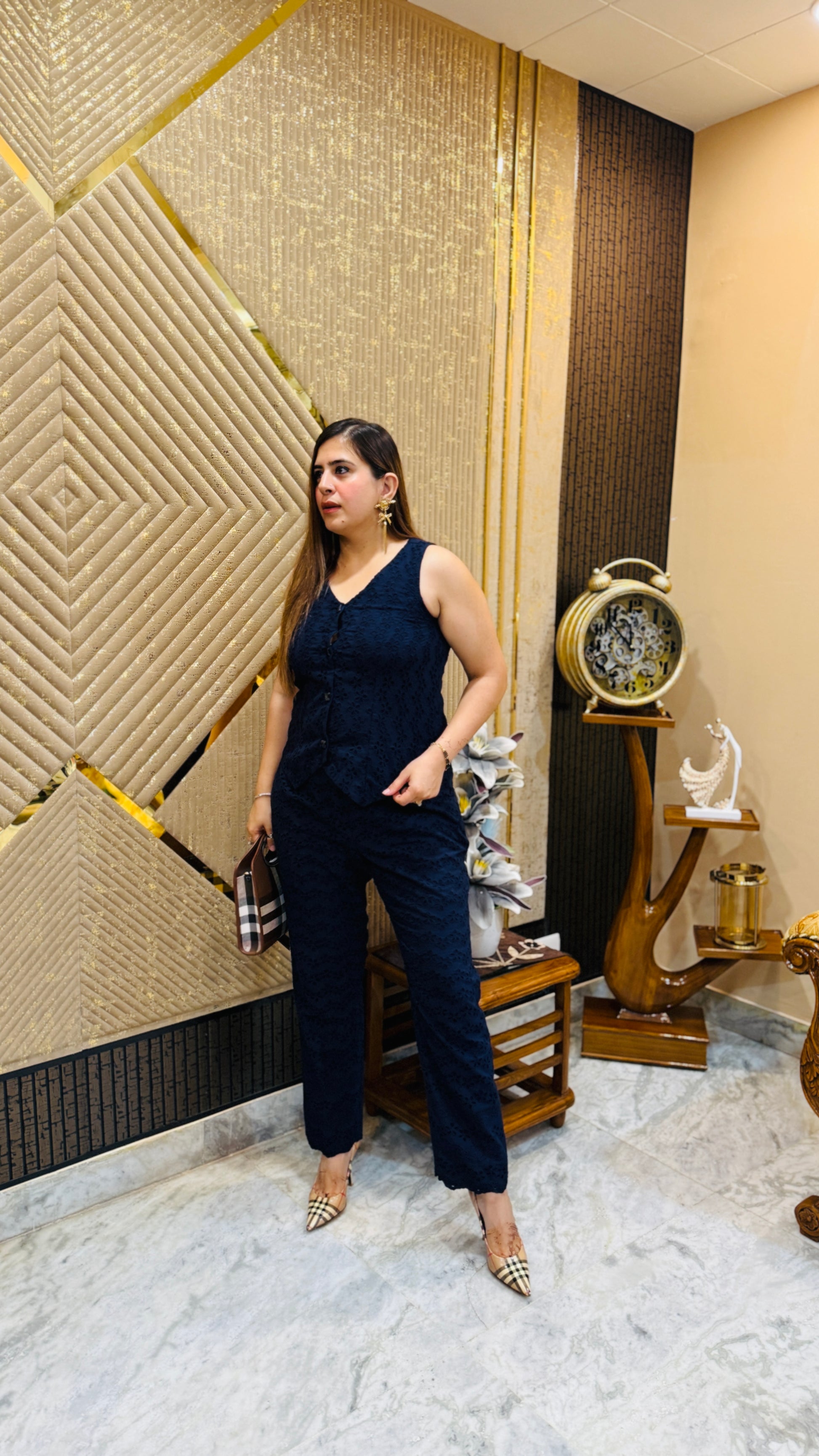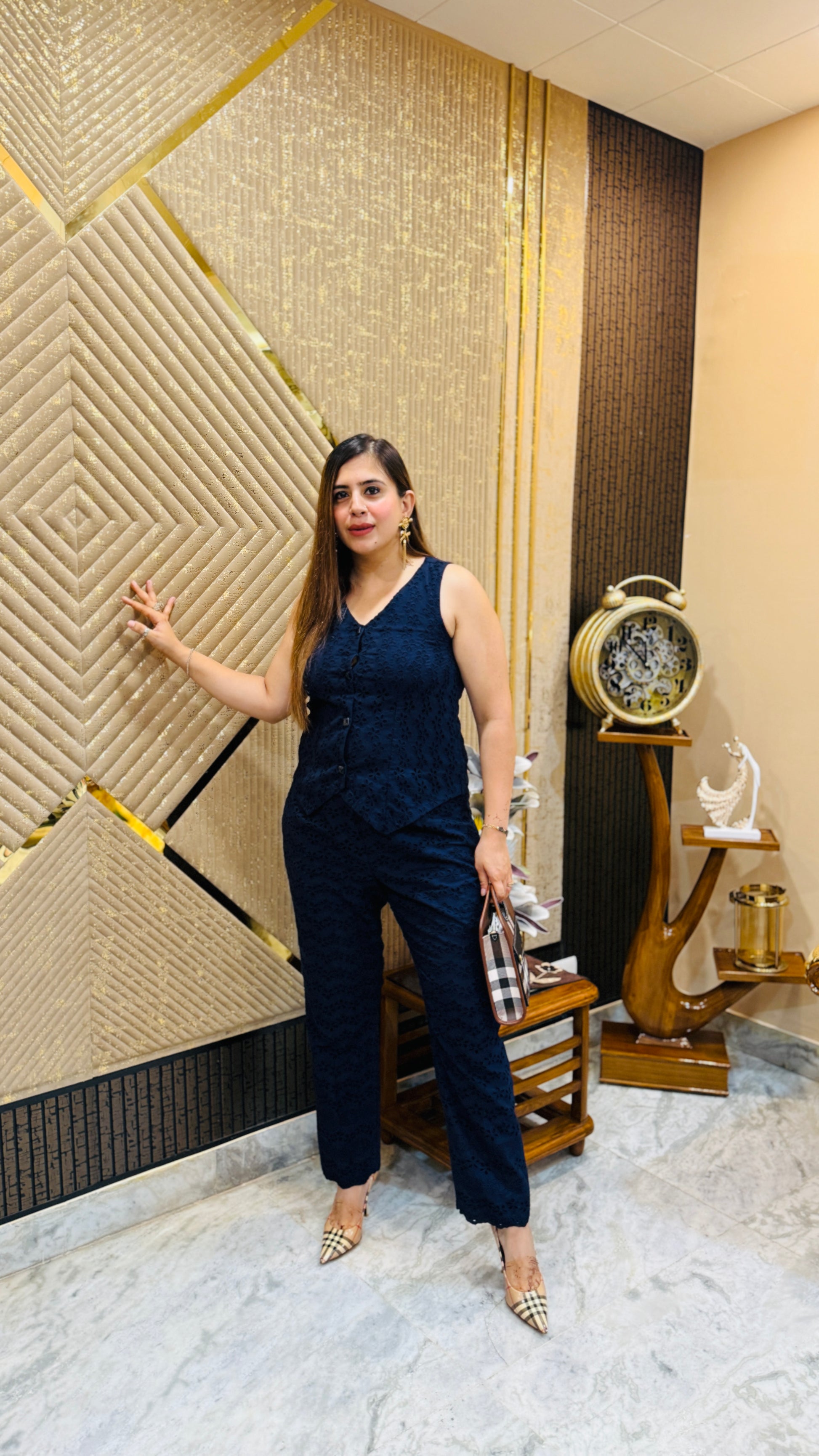 Chic navy blue Schiffli co-ord 💙 featuring a sleeveless waistcoat-style top with button-down front ✨ and matching straight pants 👖. Elegant and versatile, perfect for classy outings or semi-formal events 🌟👠. |