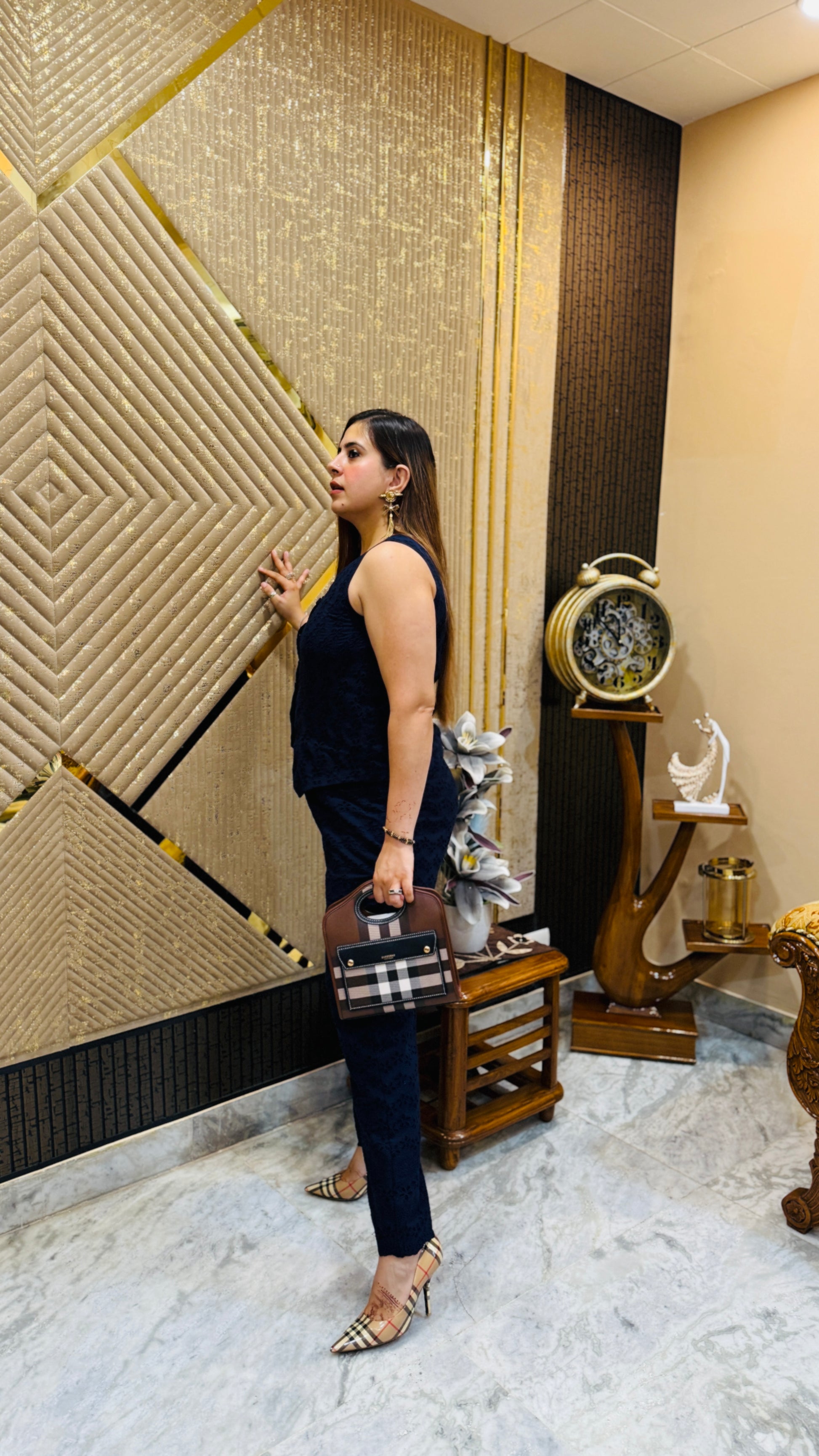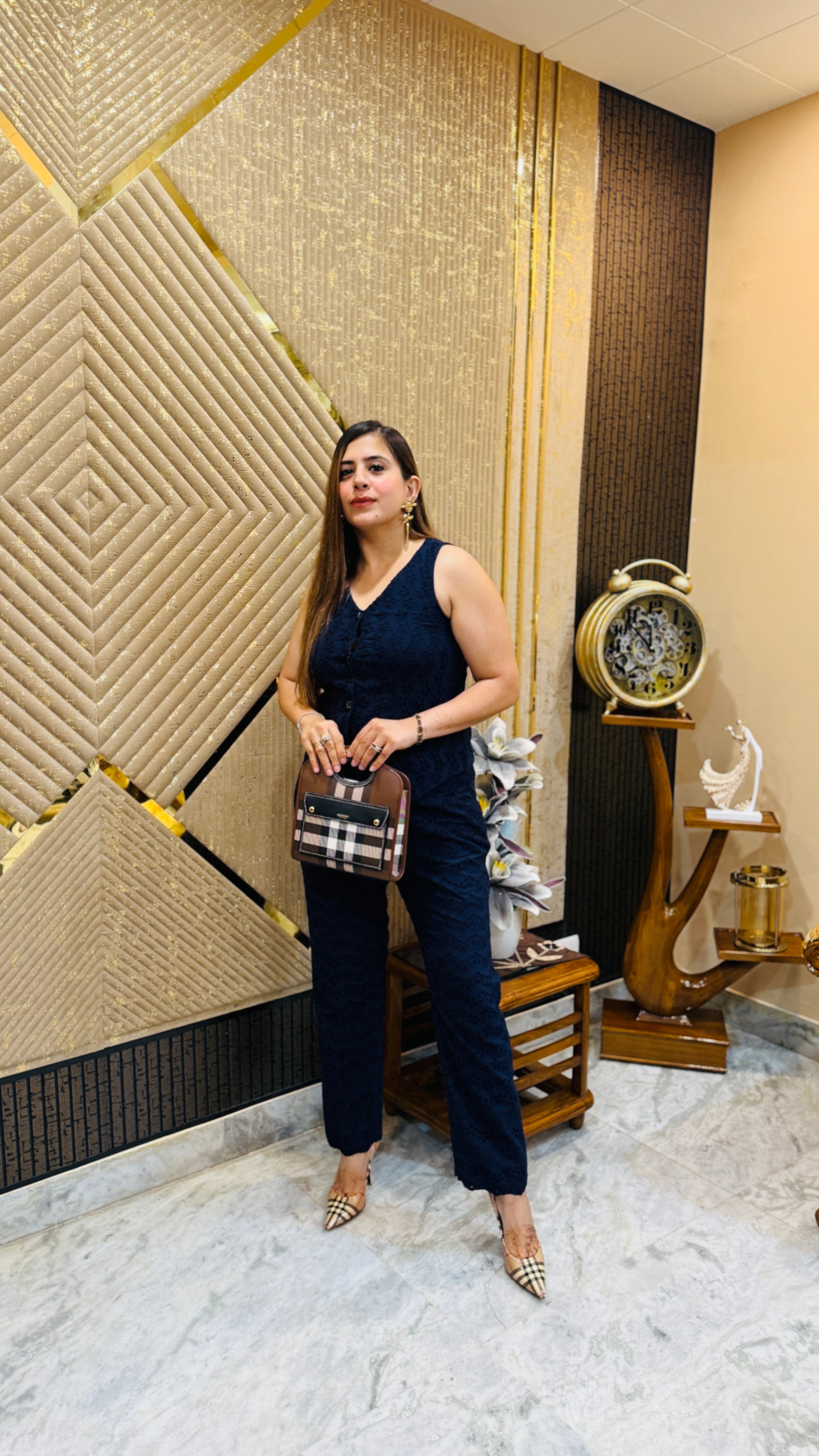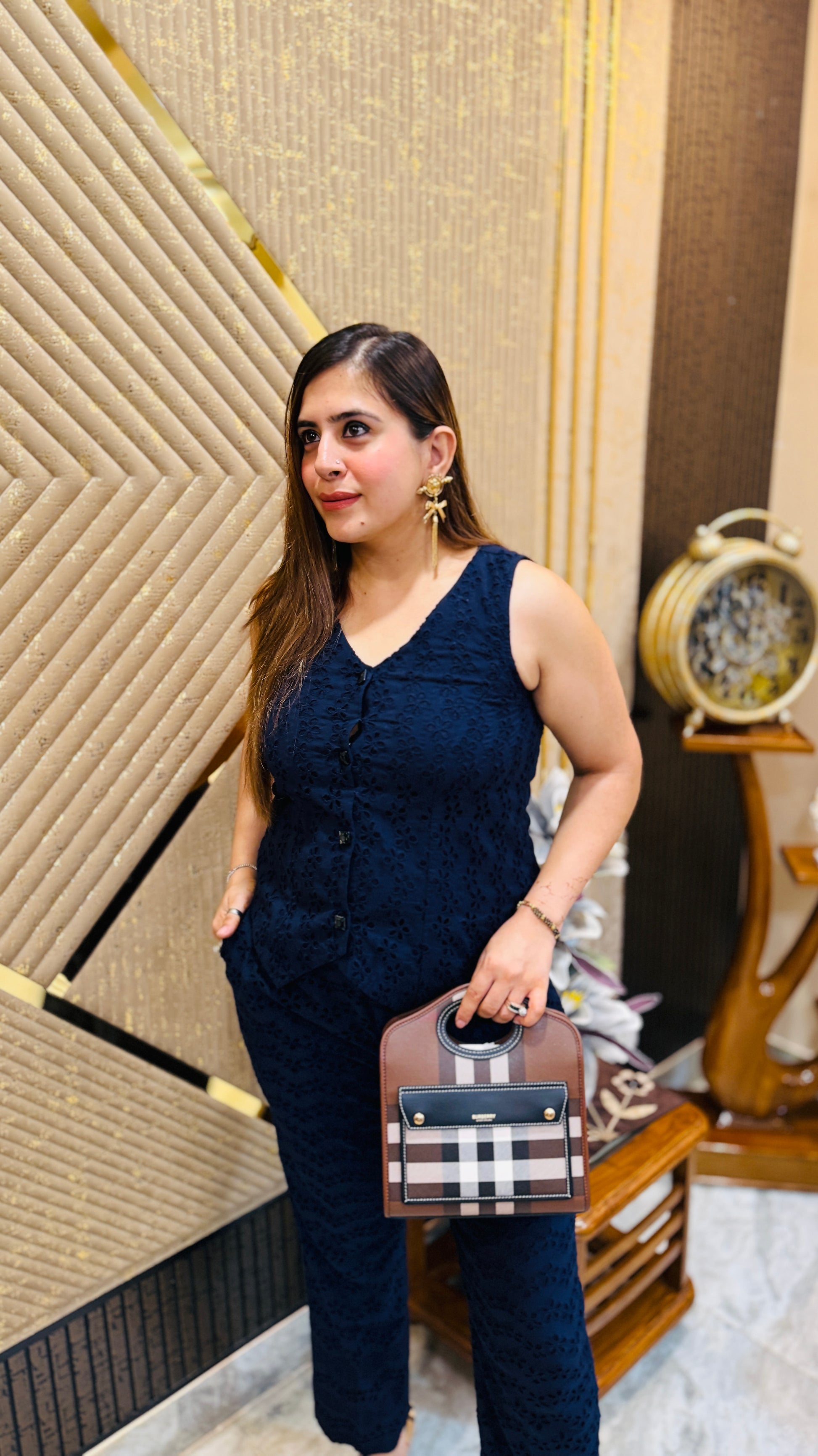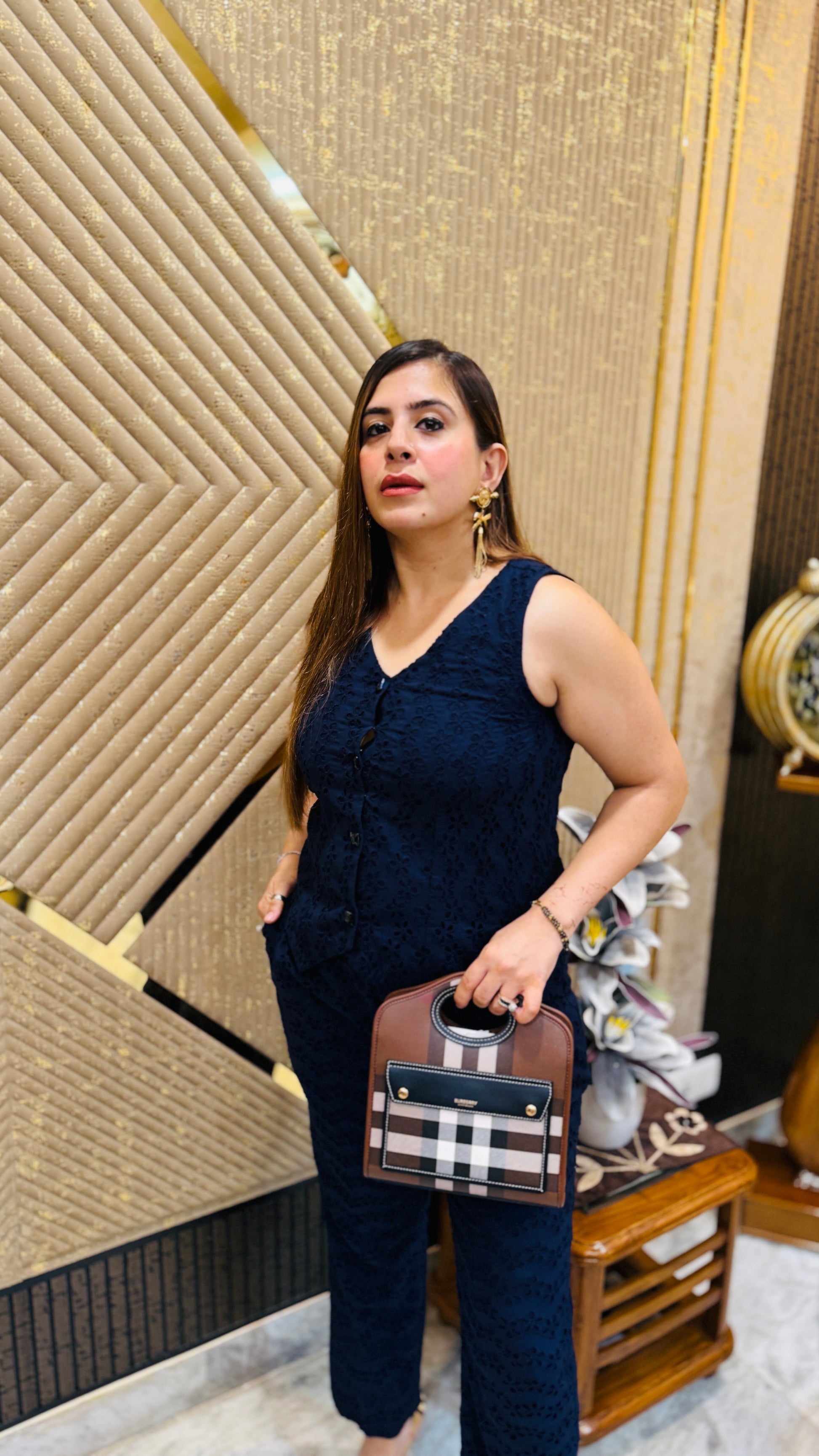 Chic navy blue Schiffli co-ord 💙 featuring a sleeveless waistcoat-style top with button-down front ✨ and matching straight pants 👖. Elegant and versatile, perfect for classy outings or semi-formal events 🌟👠. |