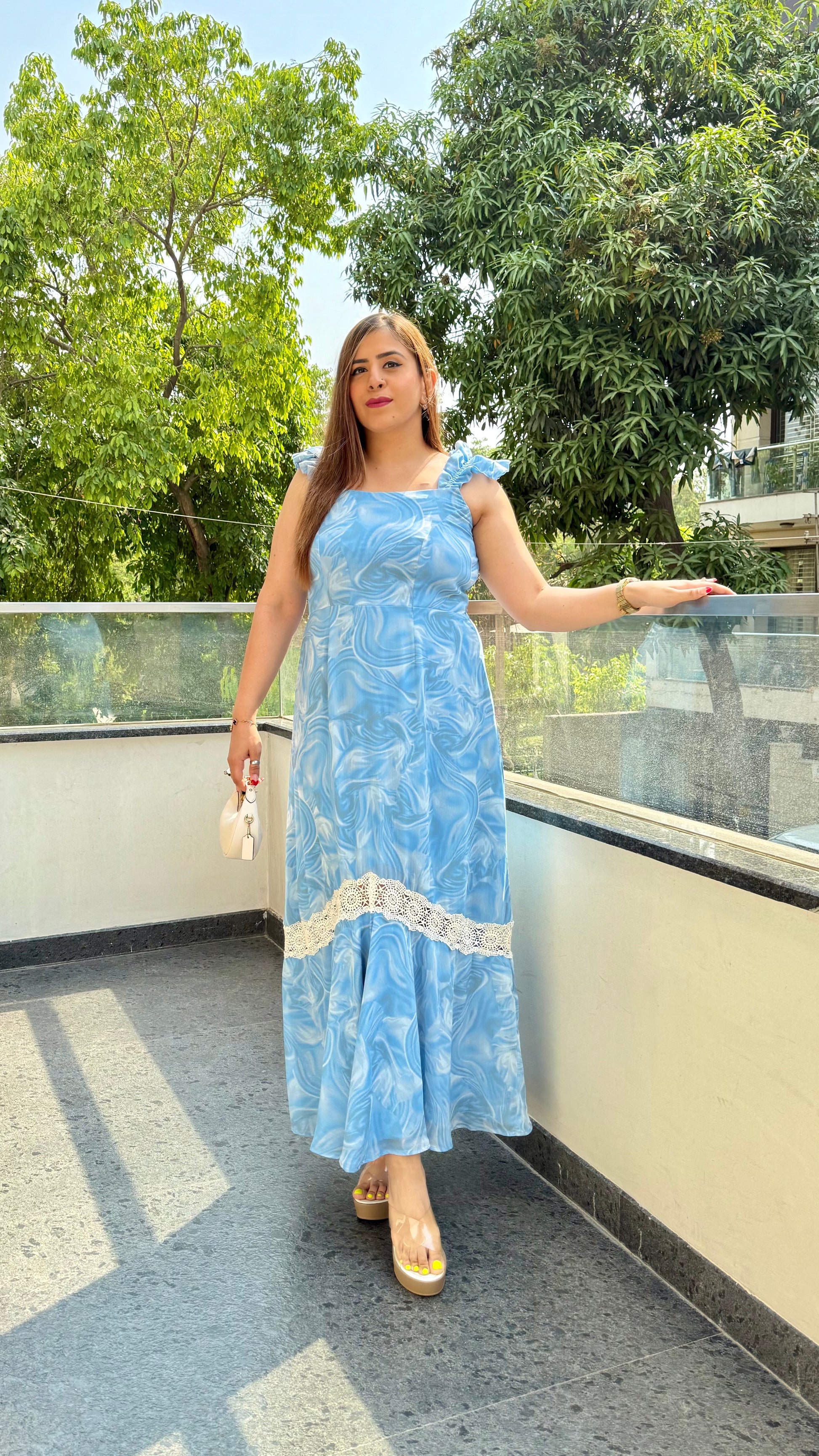 The Blue Waters Maxi Dress flows in dreamy ocean swirls ๐ with delicate frill sleeves ๐ and lace trim ๐ค. Paired with clear heels ๐ก and a mini white handbag ๐, it's summer serenity in motion โ๏ธ๐. |