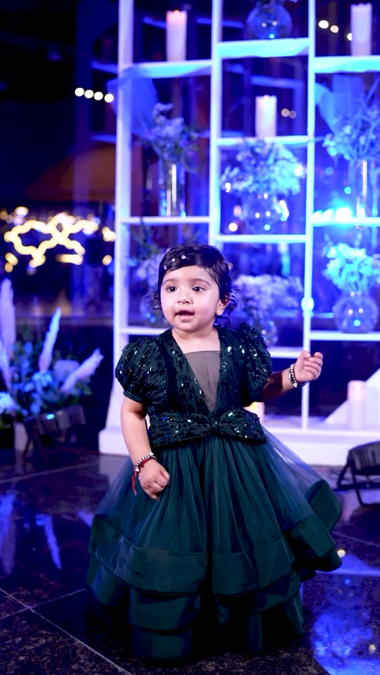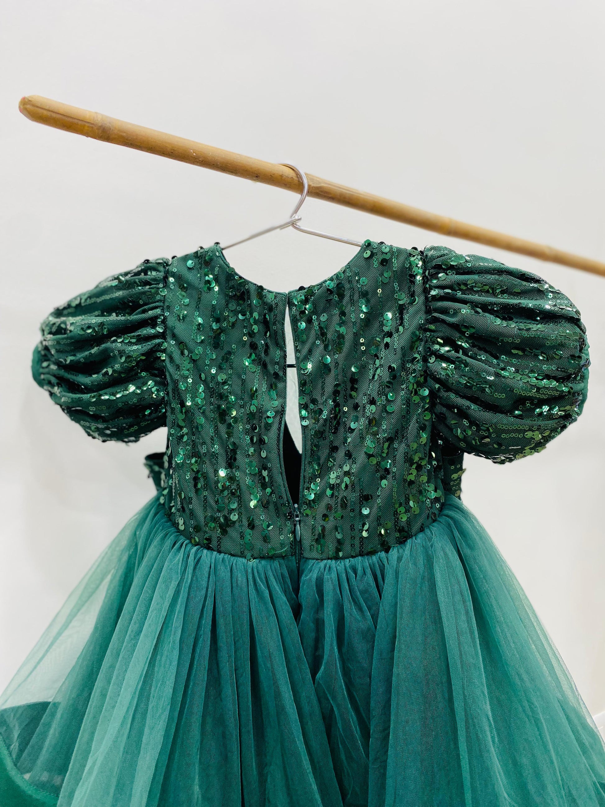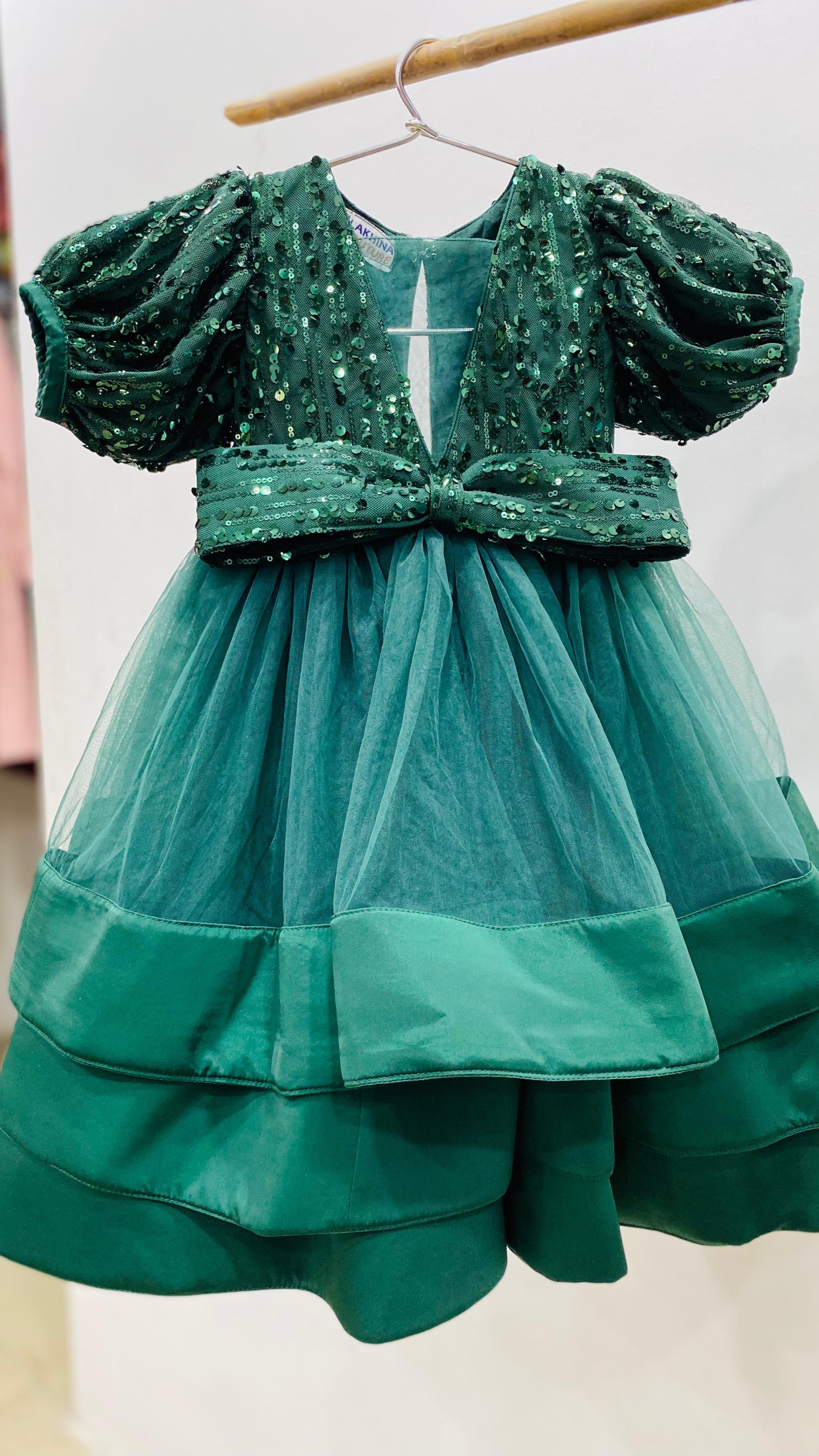 ✨ Bottle Green Baby Girl Gown ✨ This enchanting bottle green gown is a perfect blend of sparkle and elegance for your little princess. The bodice is beautifully adorned with shimmering sequins and features stylish puffed sleeves that add a royal touch. A deep V-neckline is balanced with a matching sequin waistband bow, adding charm and grace. The voluminous skirt is crafted from layers of soft tulle and finished with satin-finished tiered hems, creating a dramatic, flared silhouette. Ideal for birthdays, weddings, or festive occasions — this gown is all about making magical memories. 💚👑🎀 |