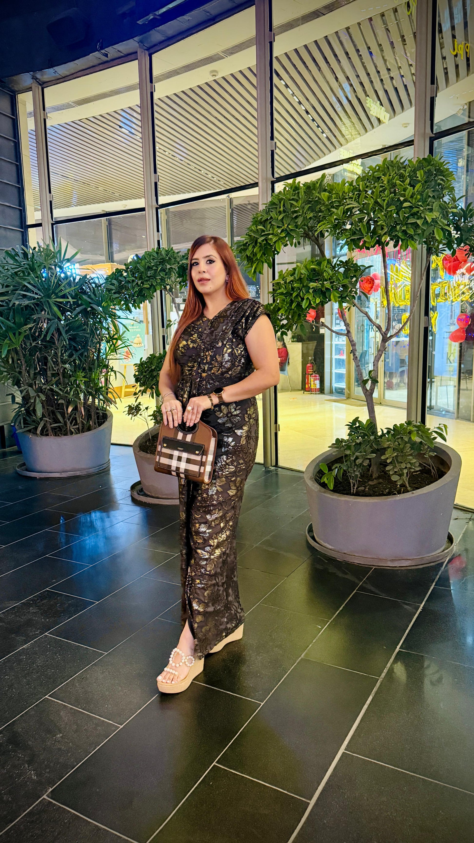 | Design | Premium Brasso Net with metallic golden floral shimmer overlay |