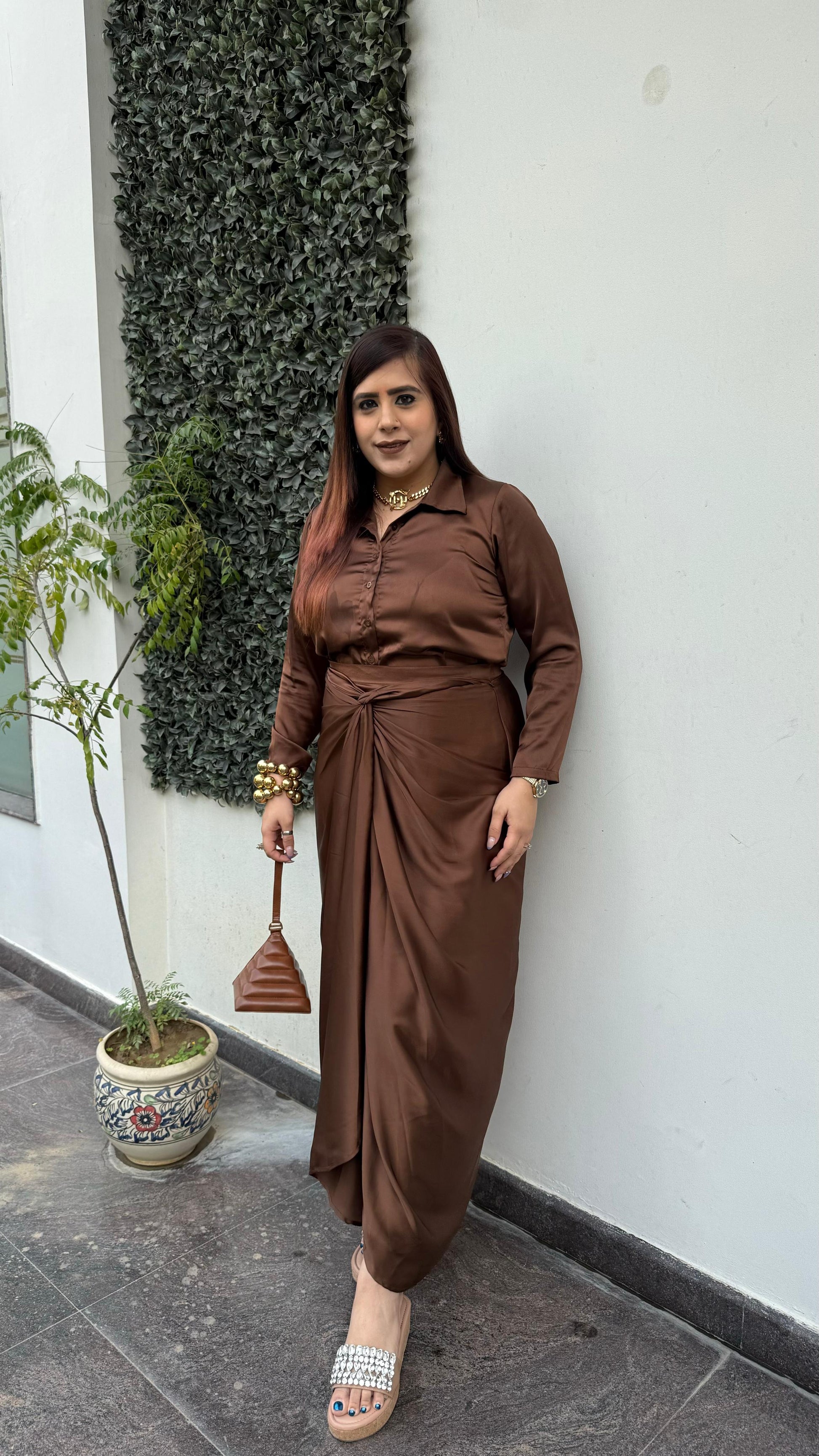 "Chic brown Dubai dhoti co-ord with a stylish knotted front design, blending elegance with comfort 🌟. Paired with statement jewelry and a unique triangular handbag, it’s perfect for sophisticated outings 👗👜. |