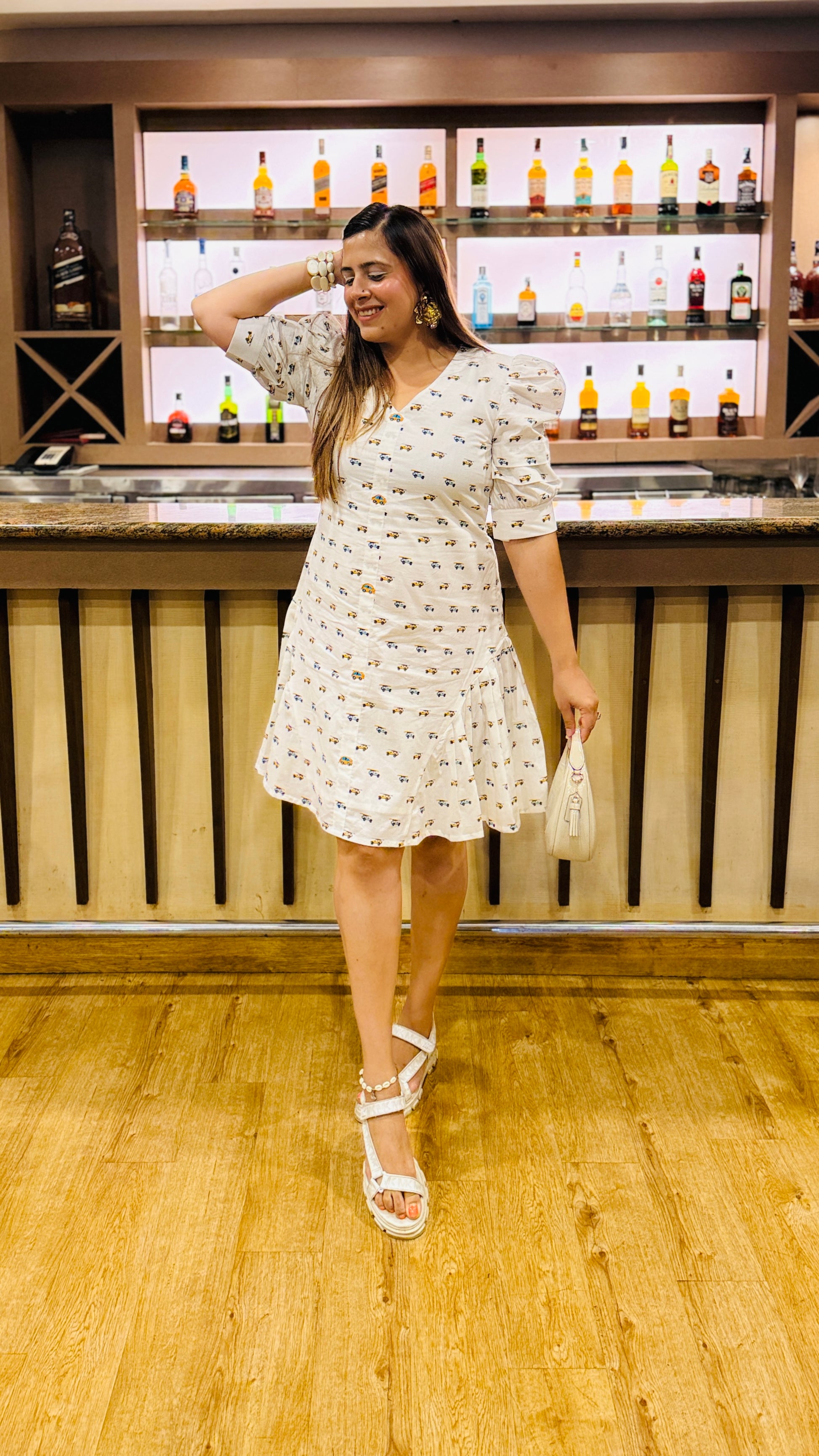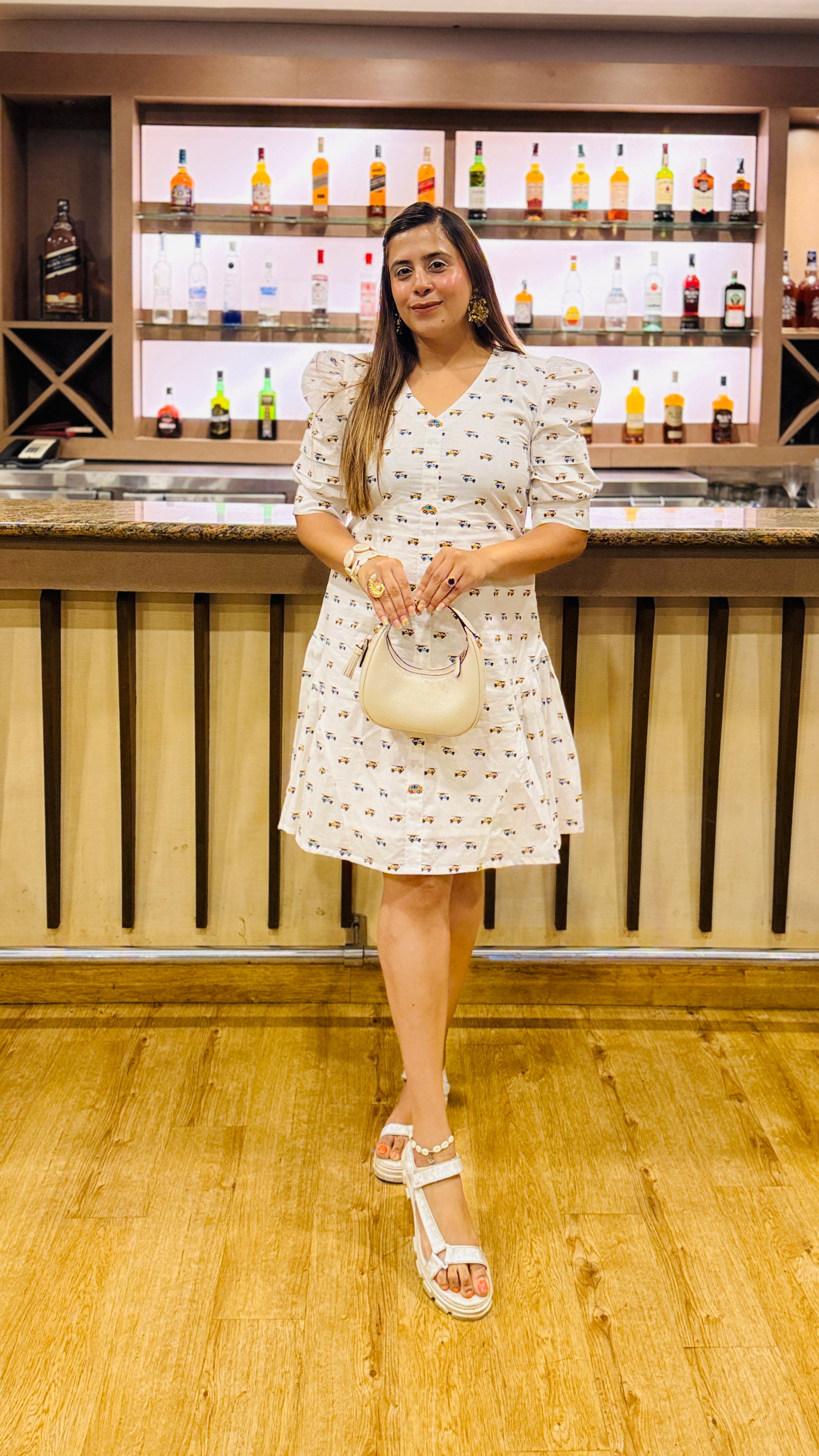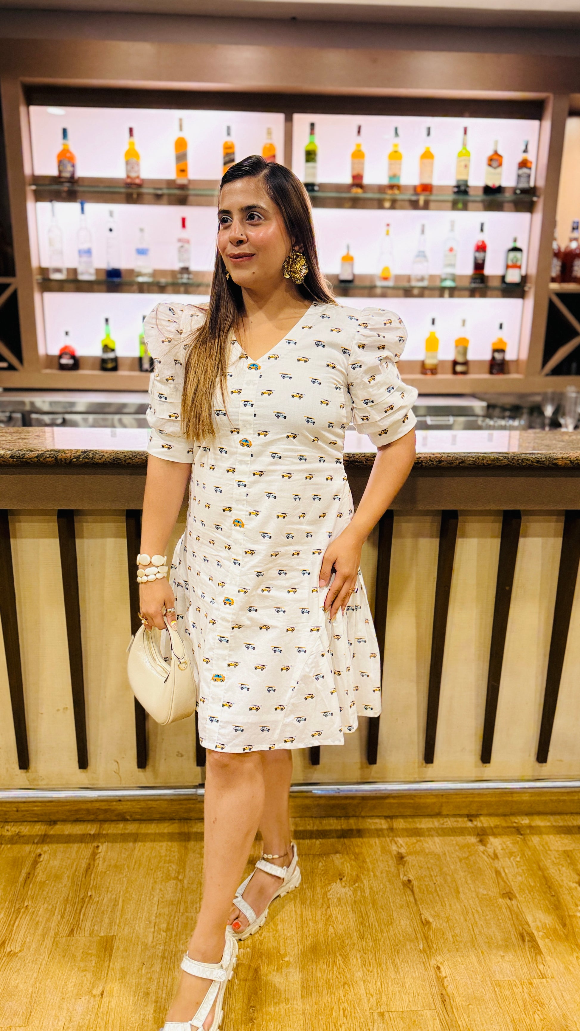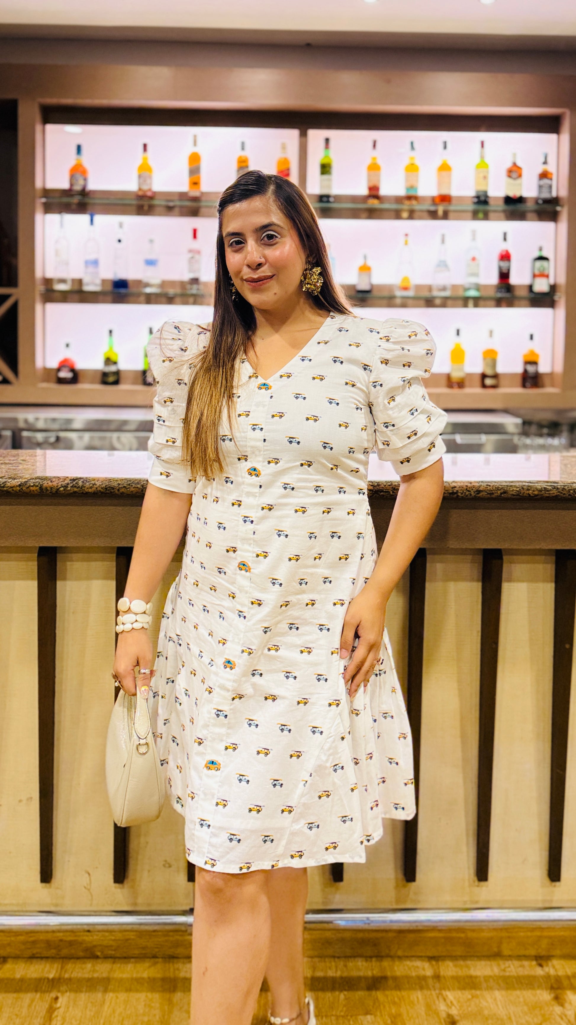 This playful white dress flaunts quirky mini car prints, puffed half sleeves, a V-neckline, and button-down front. Fun, flirty, and fabulous — ideal for playful evenings or brunches! ✨👗🌟
