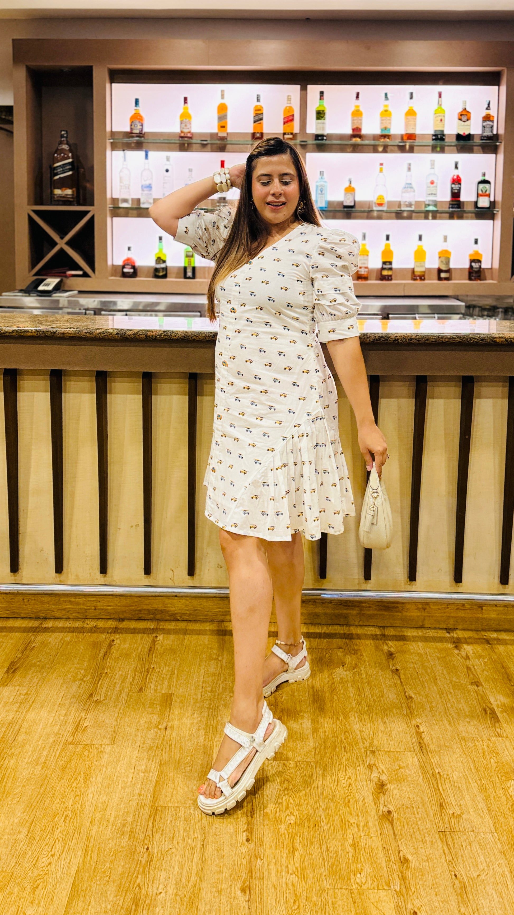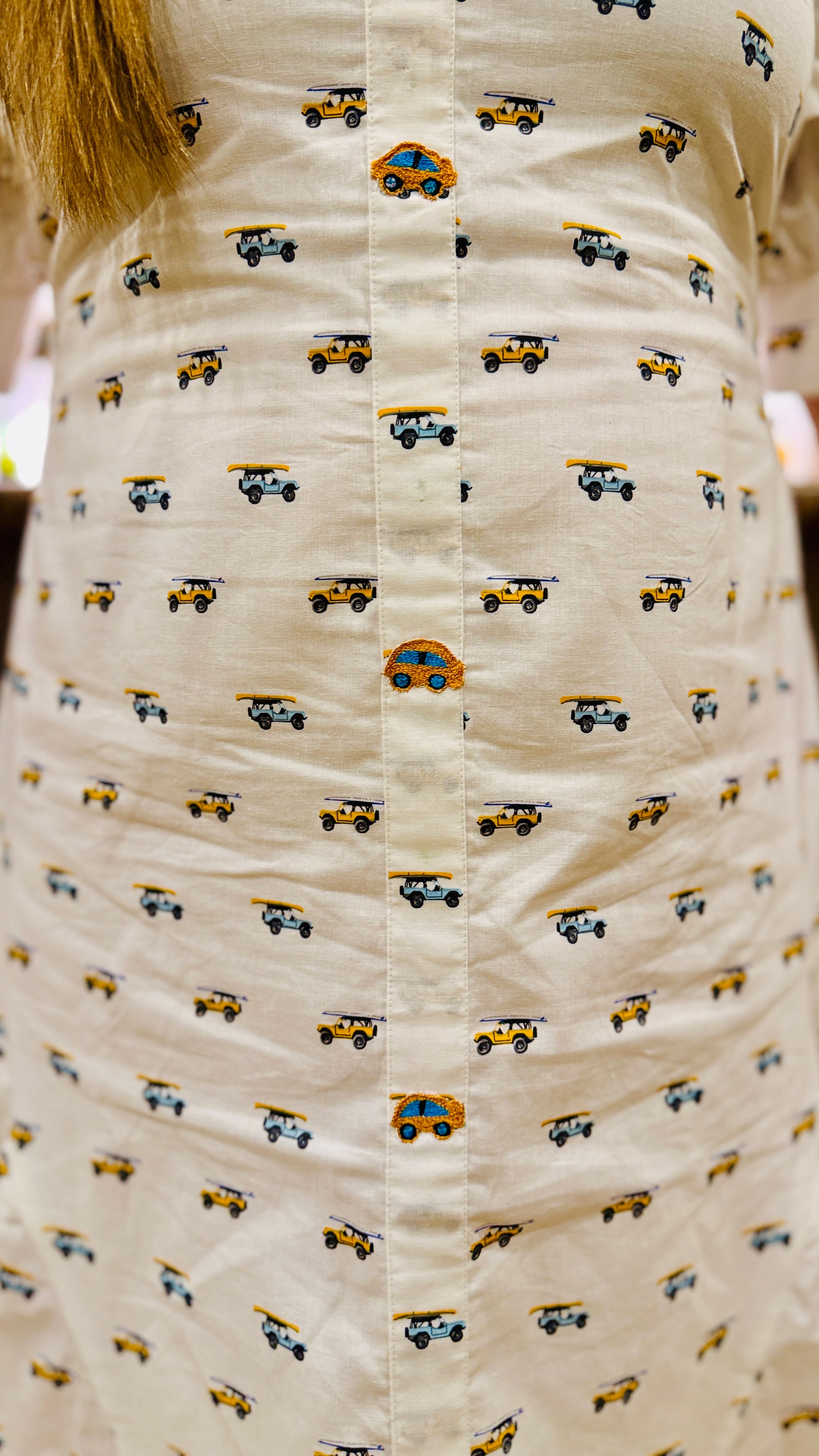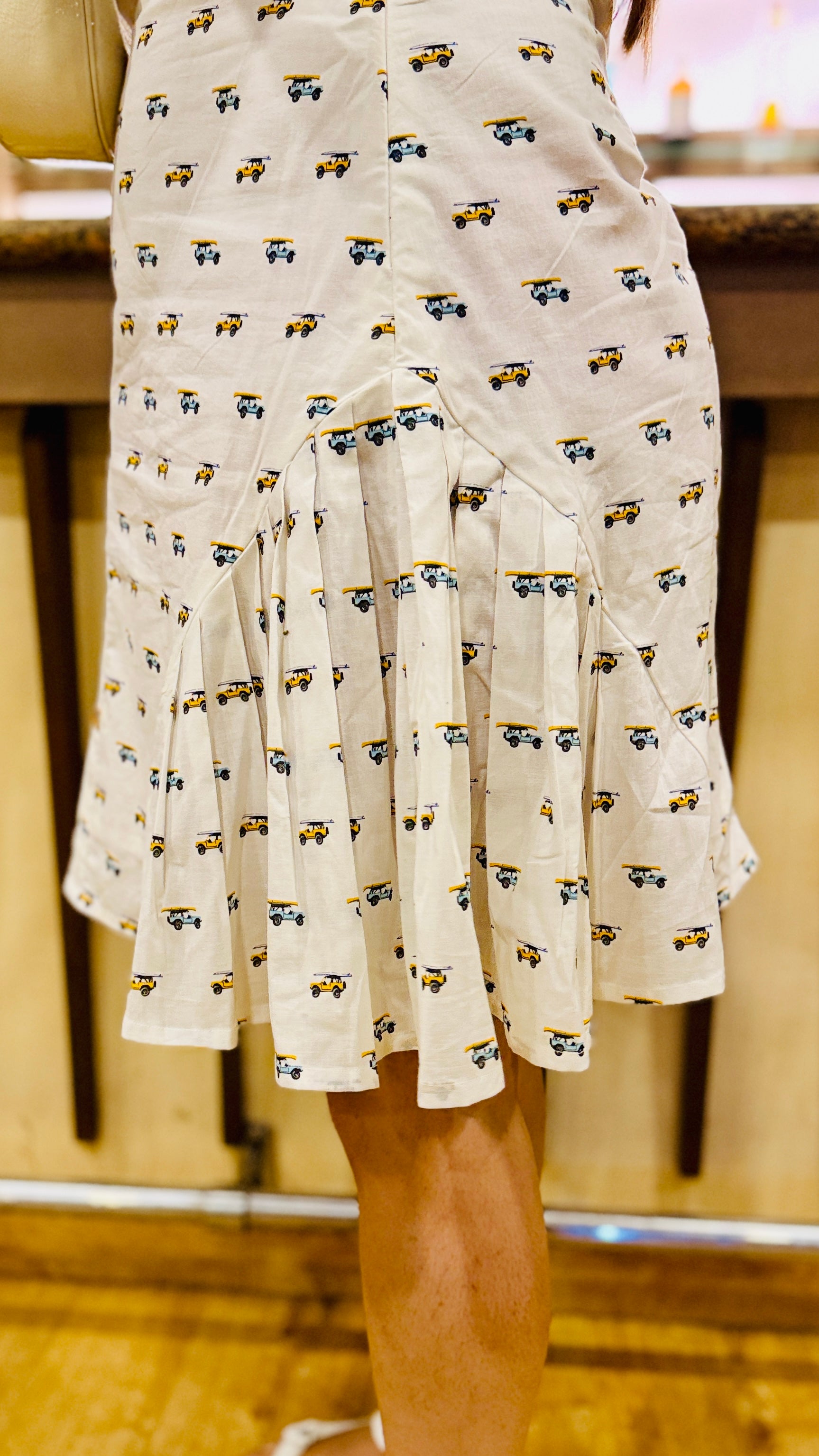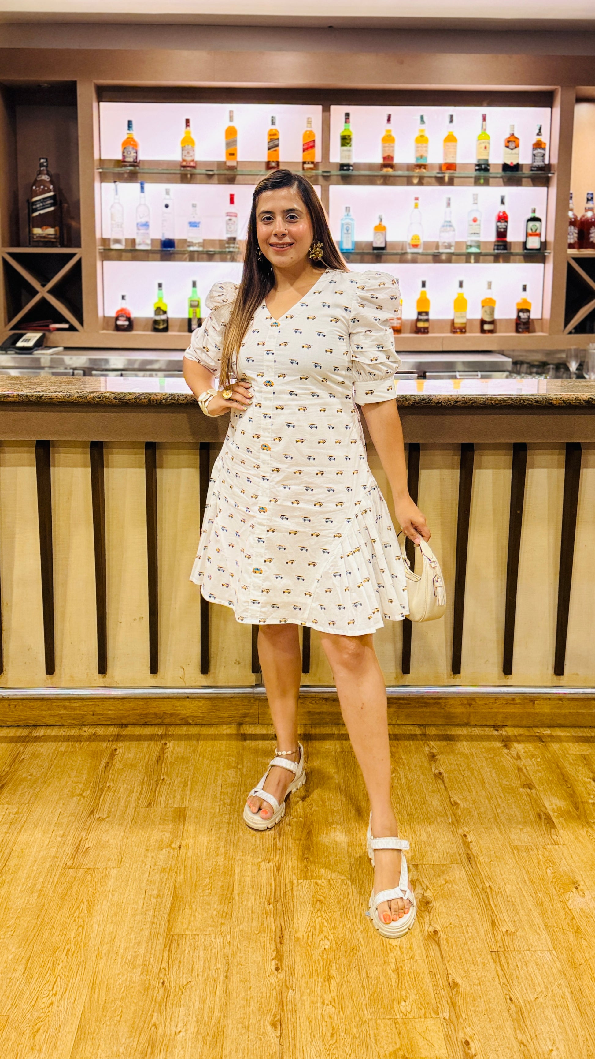 This playful white dress flaunts quirky mini car prints, puffed half sleeves, a V-neckline, and button-down front. Fun, flirty, and fabulous — ideal for playful evenings or brunches! ✨👗🌟