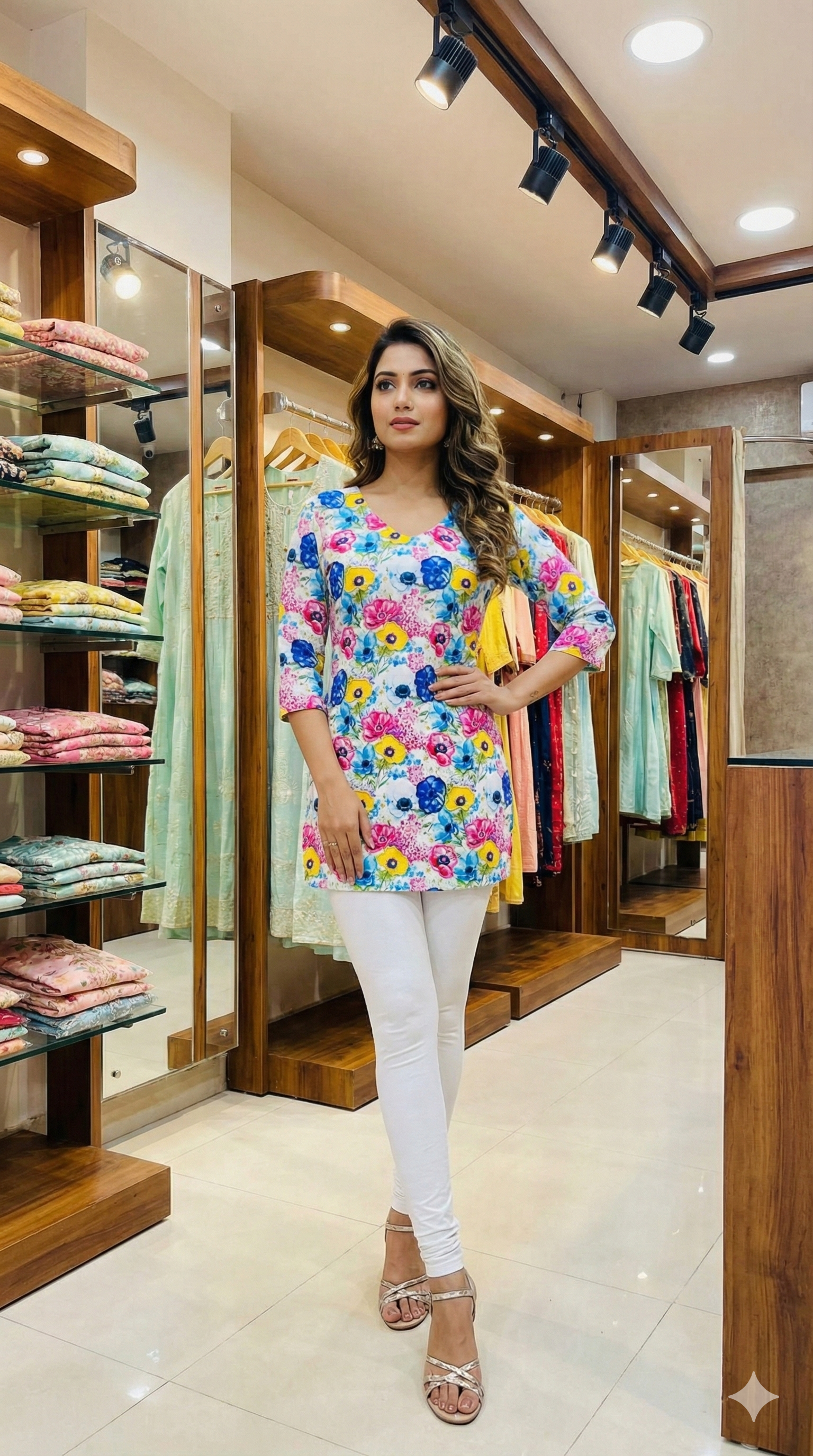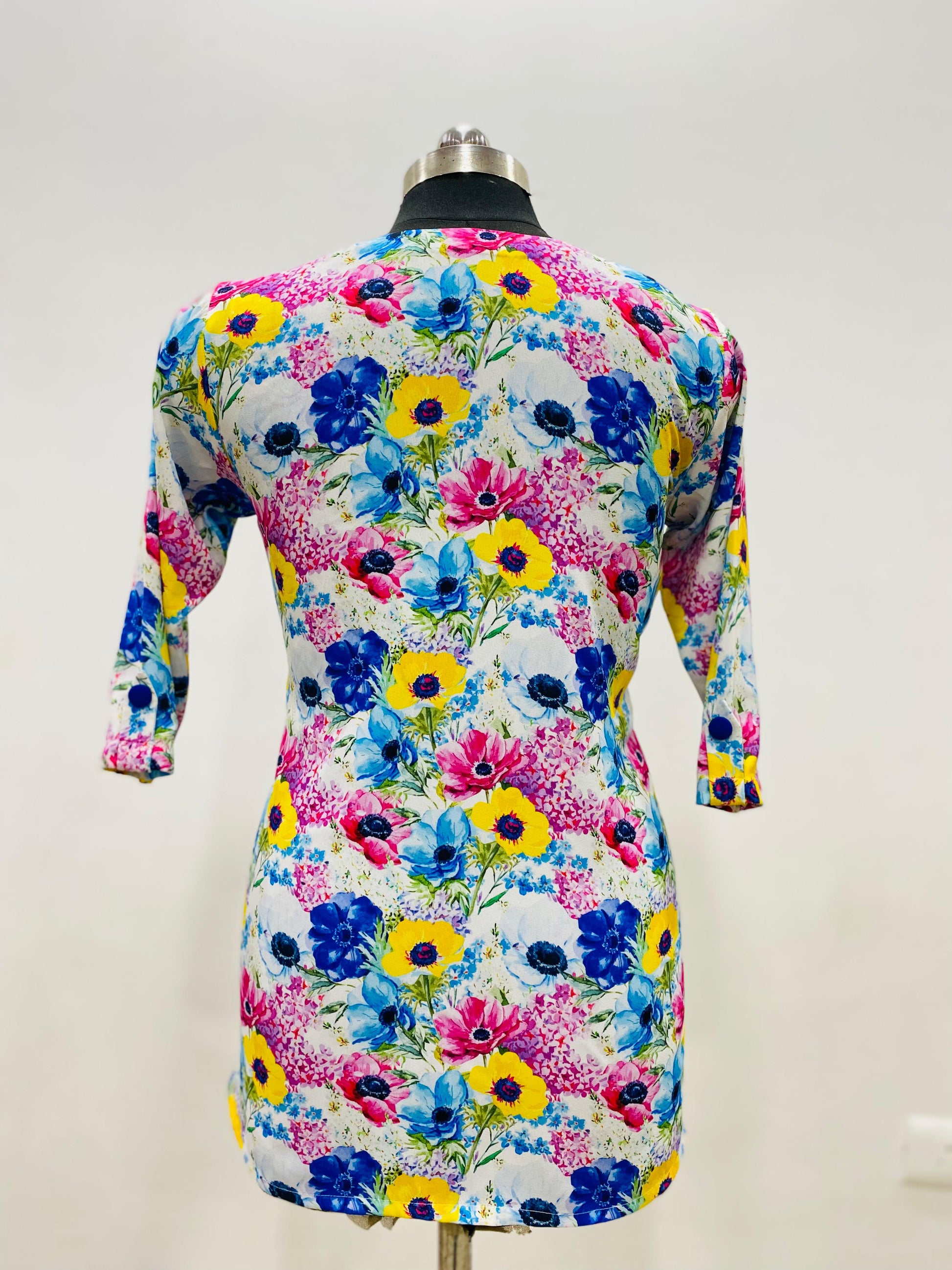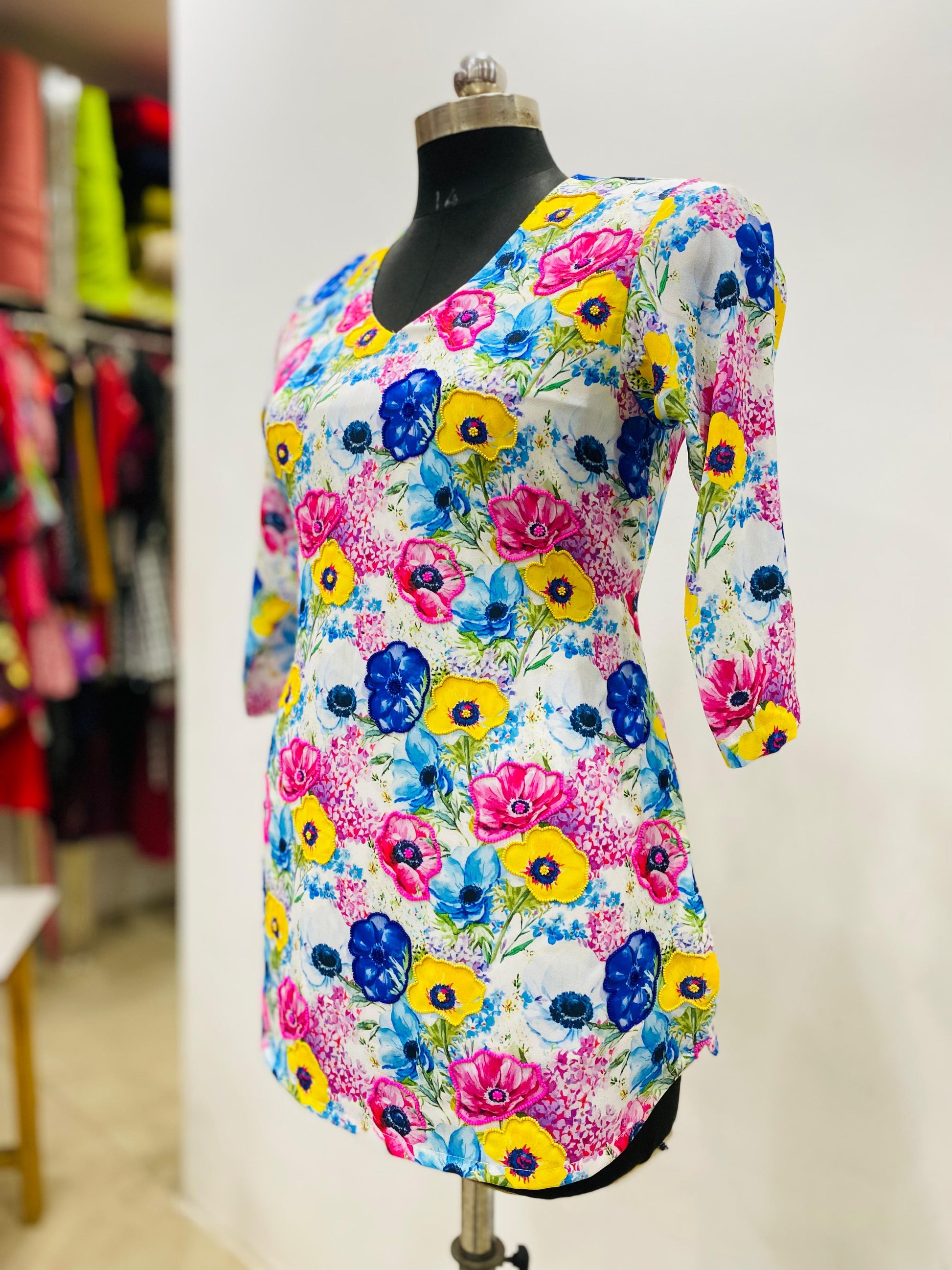 Brighten your day with this vibrant floral top featuring multicolor blooms 🌸💙💛, a flattering V-neckline ✨, and 3/4th sleeves 🌿. Perfect for summer vibes and everyday elegance! 🌞👚