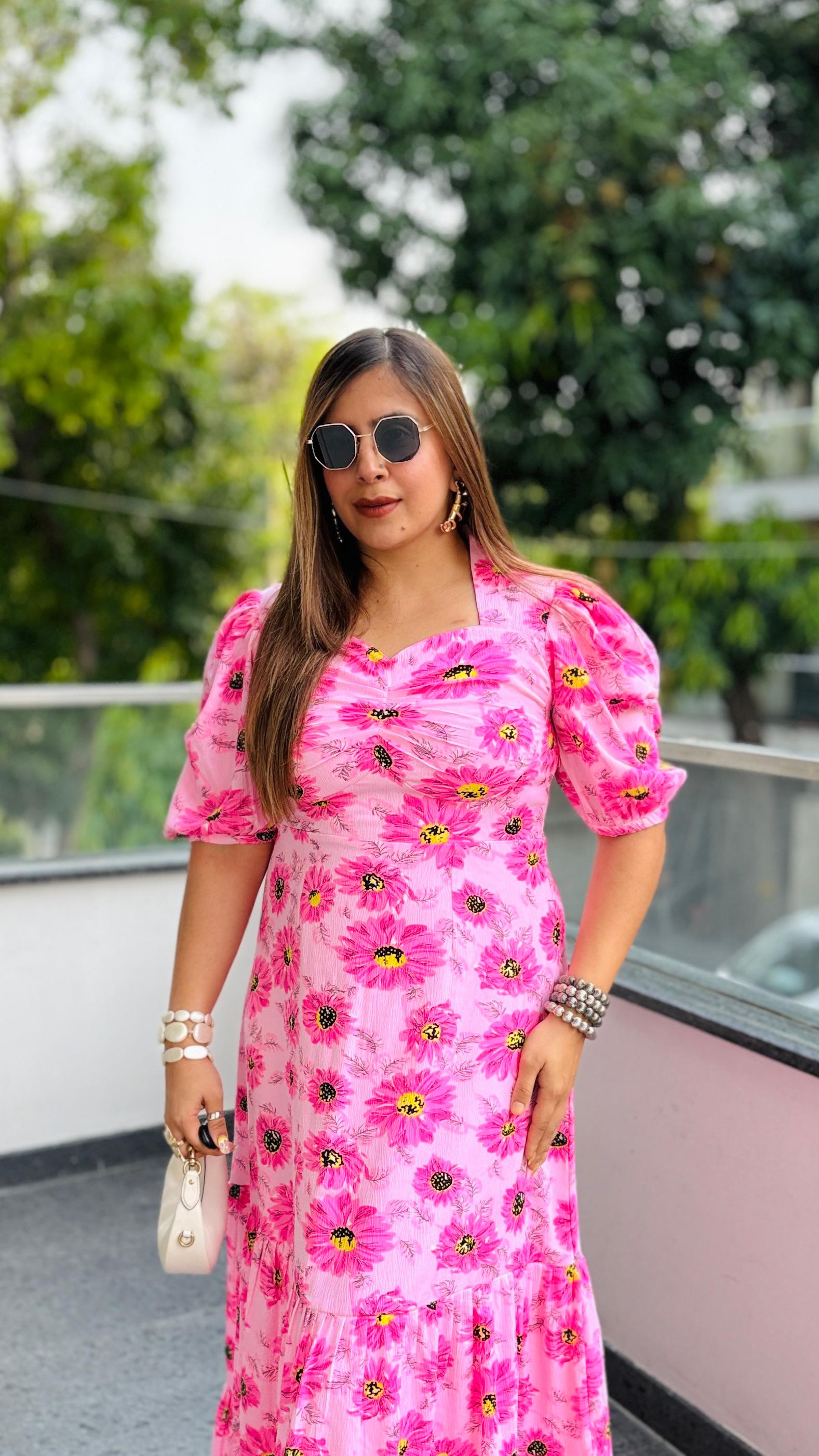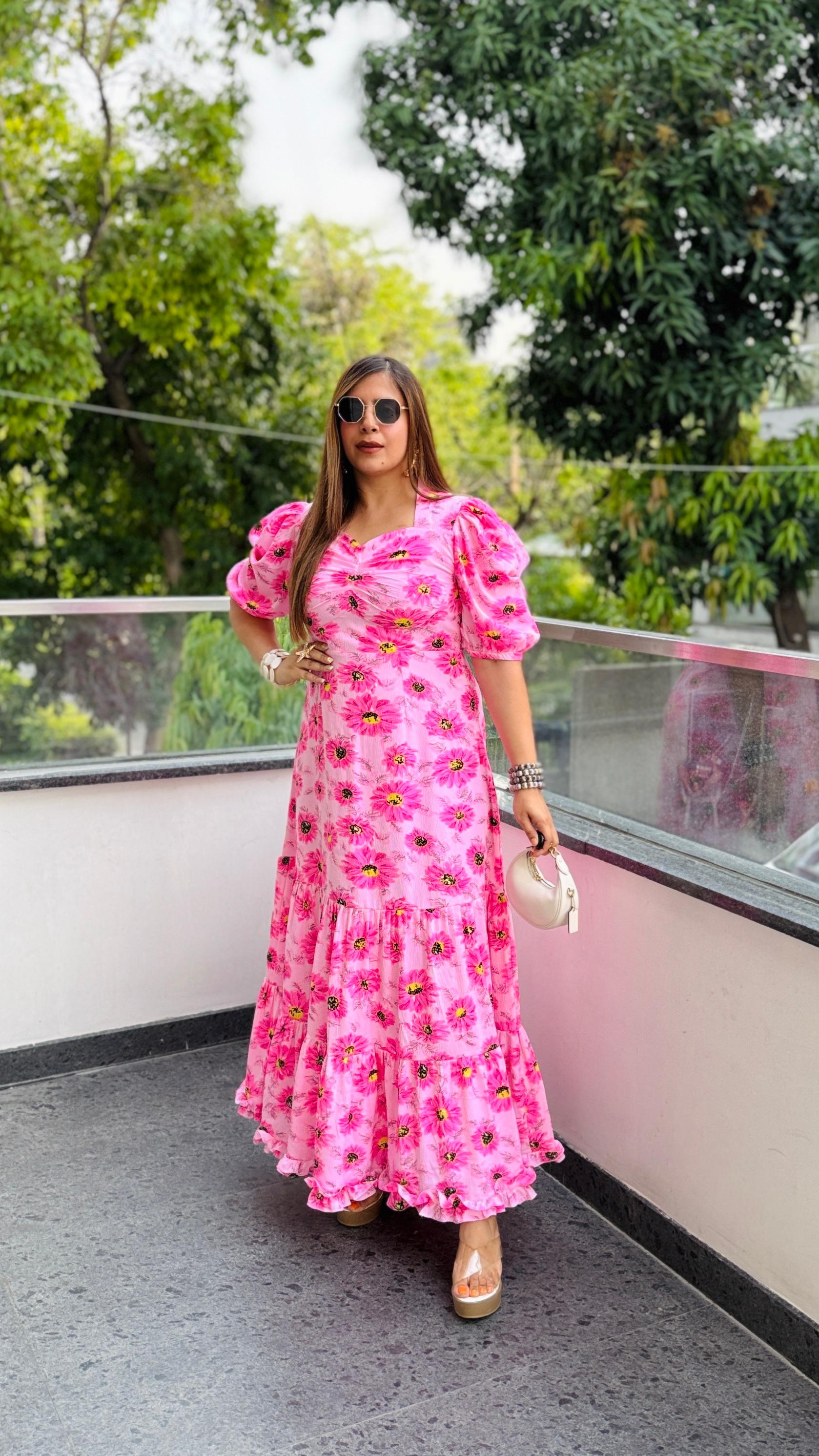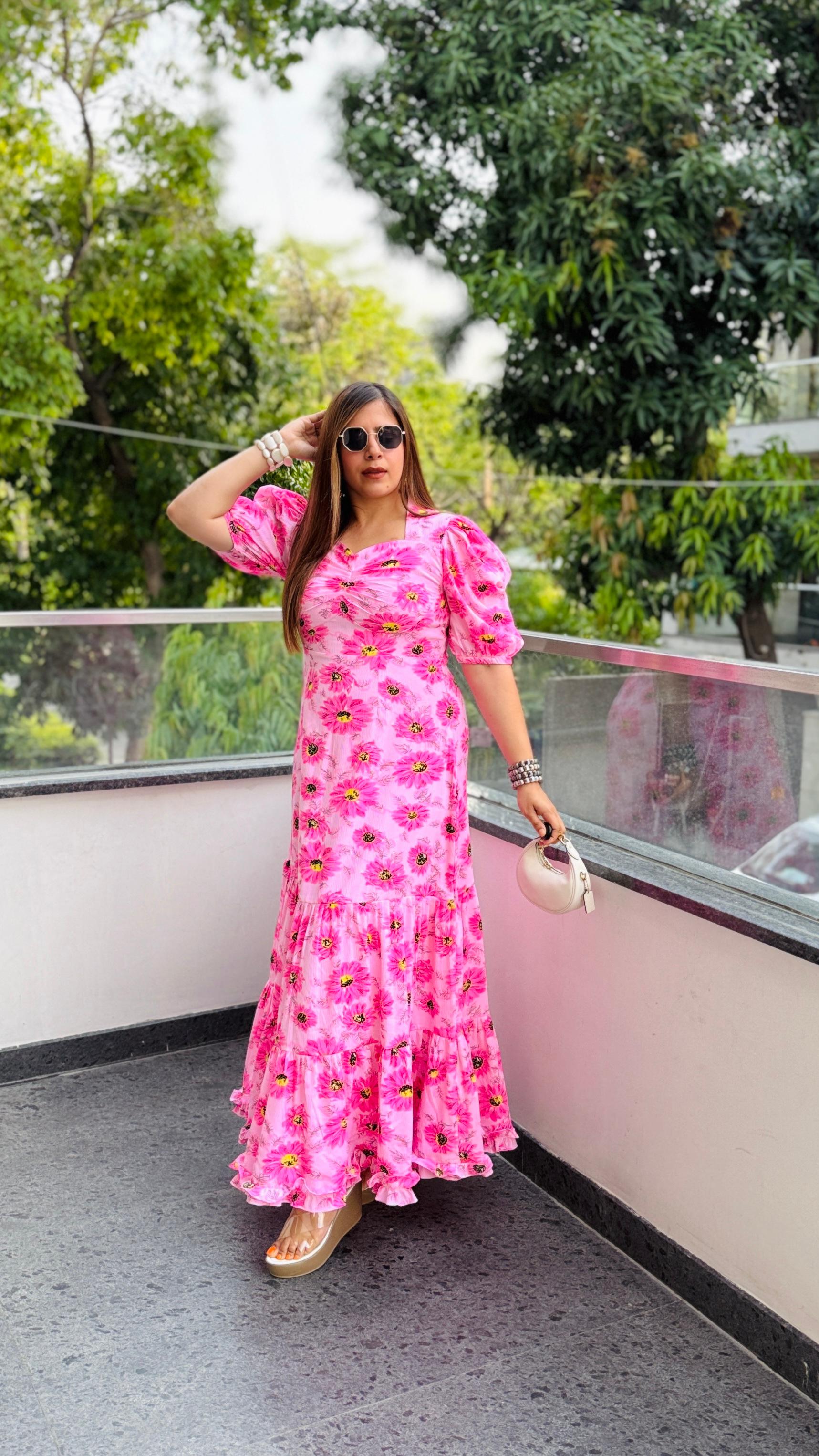 The Carnation Pink Maxi Dress is a vibrant, floor-length gown featuring a bold floral print with large pink flowers accented by yellow centers and green leaves. It has a fitted bodice with a square neckline and puffed elbow-length sleeves, creating a romantic silhouette. The dress flows into a tiered, ruffled skirt that adds volume and movement, perfect for a breezy summer day. Crafted from a lightweight fabric, this maxi dress exudes a playful yet elegant charm, ideal for casual outings or garden events.