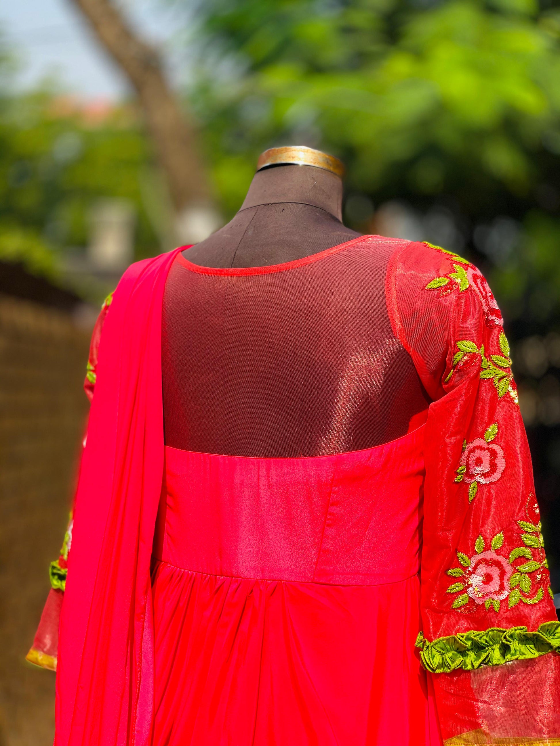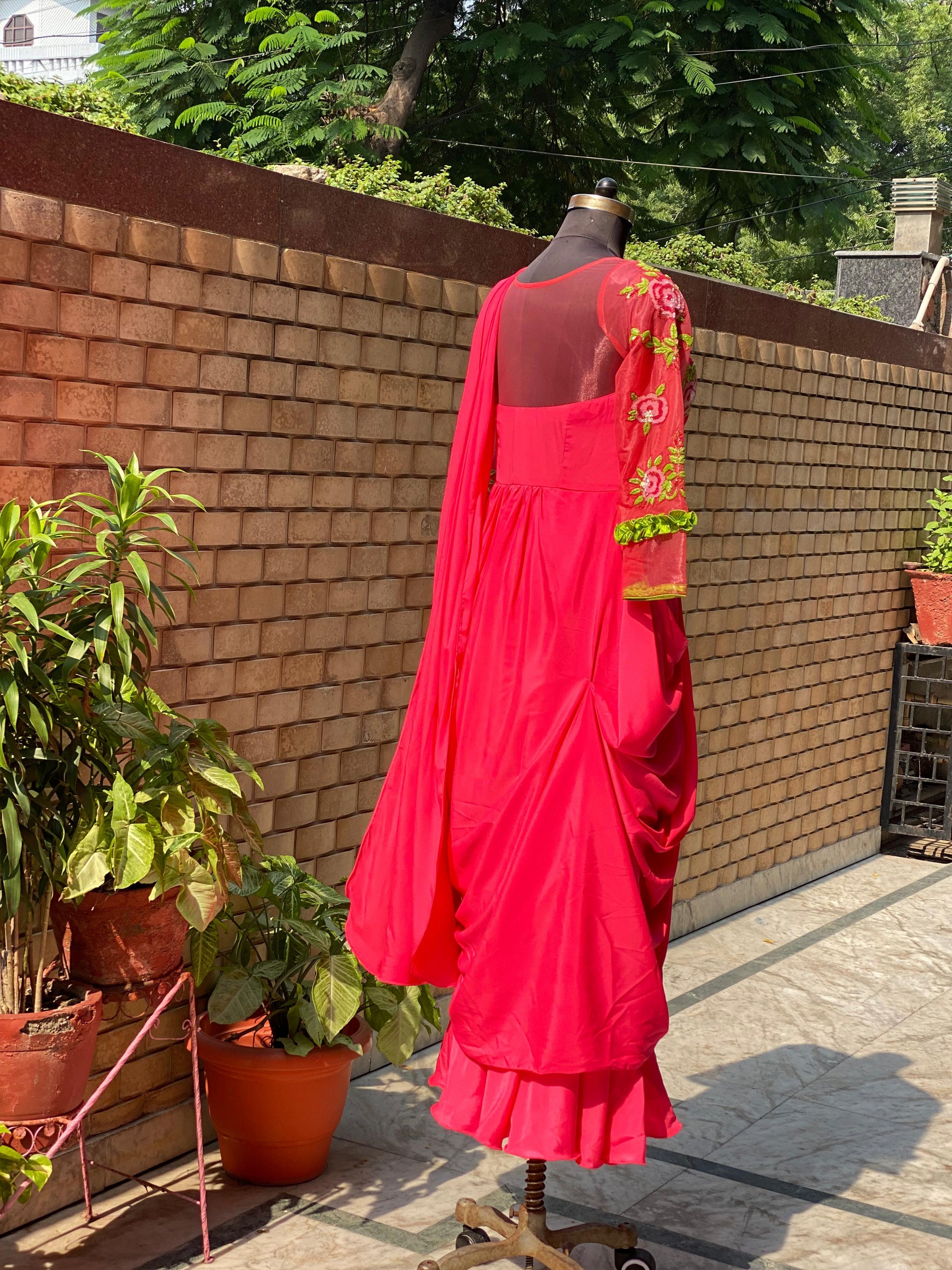 Carrot Pink Teej Saree 🌺✨ Radiate festive charm in this vibrant carrot pink saree with pleated drapes and sheer floral-embroidered sleeves 🌸. Perfect for Teej celebrations with its graceful silhouette and elegant flair 💃💕 |