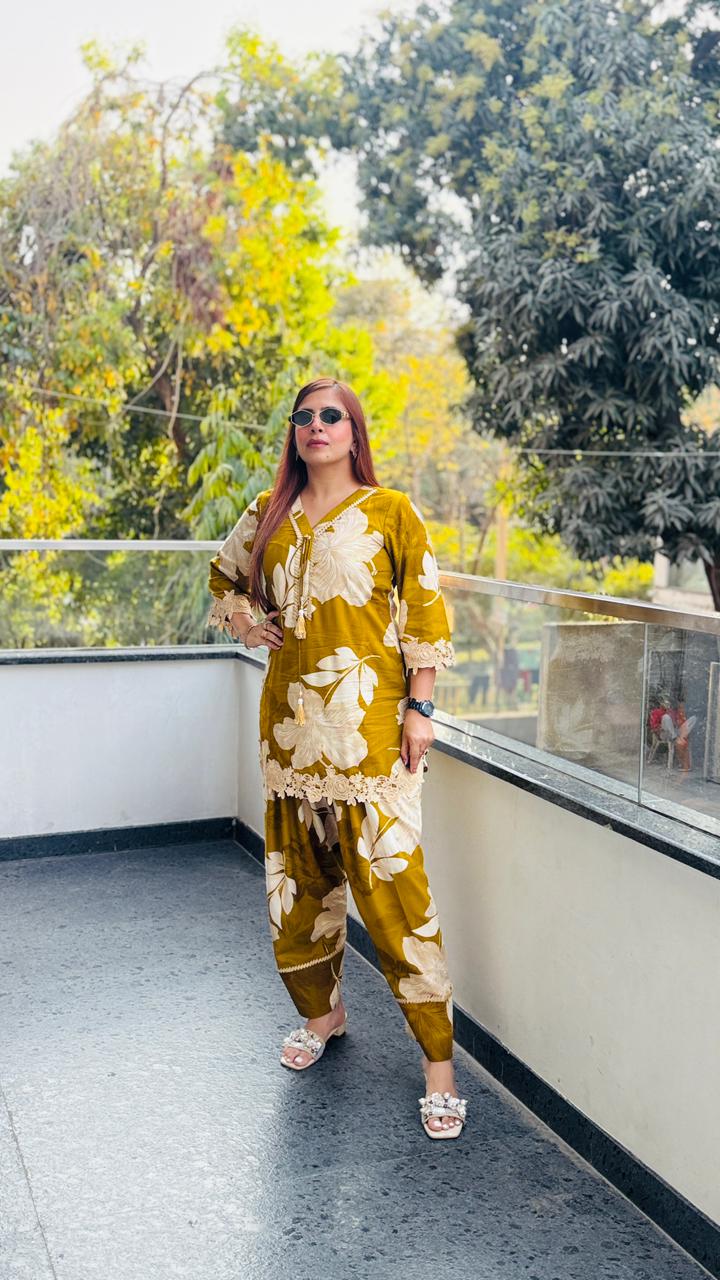 Premium cotton-rayon, soft yet structured, this mustard Farshi Salwar Co-ord set flows beautifully with every step. The bold floral print and wide Farshi silhouette create a graceful statement you won’t find in regular readymades. Comfortable for long hours yet striking enough for festive lunches, family gatherings and special day events. Crafted for women who value quality, fall and refined presence.