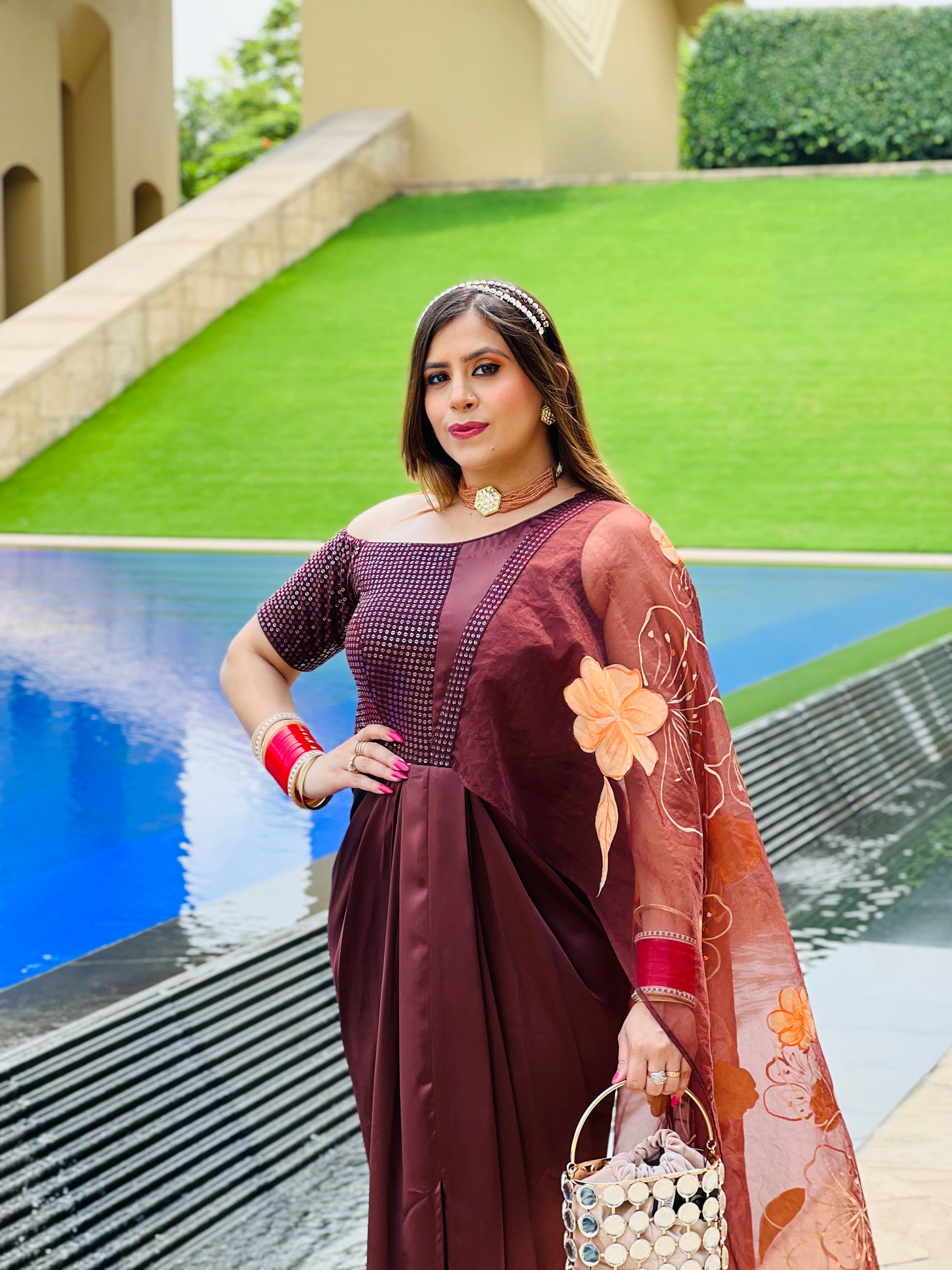 Handpainted Organza Palloo. Sequin work Yoke with fancy Sleeves.