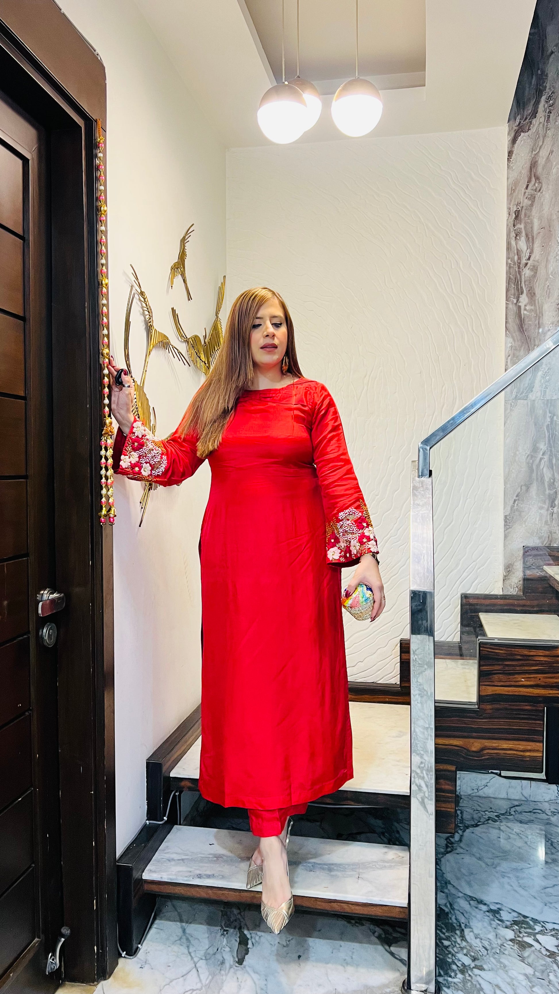 This stunning coral embroidered suit ✨ features a sleek, long silhouette with intricate floral embroidery on the flared sleeves 🌸. Paired with matching trousers and chic heels 👠, it exudes elegance and grace. ❤️ |
