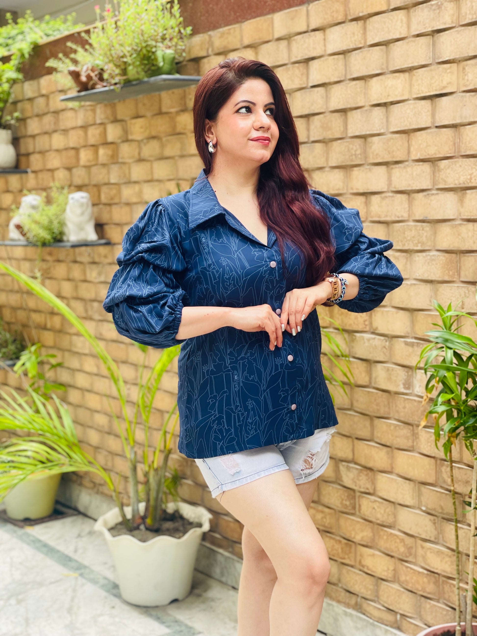 "Embrace elegance with the 'Dare to Blue' top! 🌊✨ This chic navy blouse features delicate line patterns and voluminous sleeves, perfect for adding a touch of sophistication to your look. 💙" |