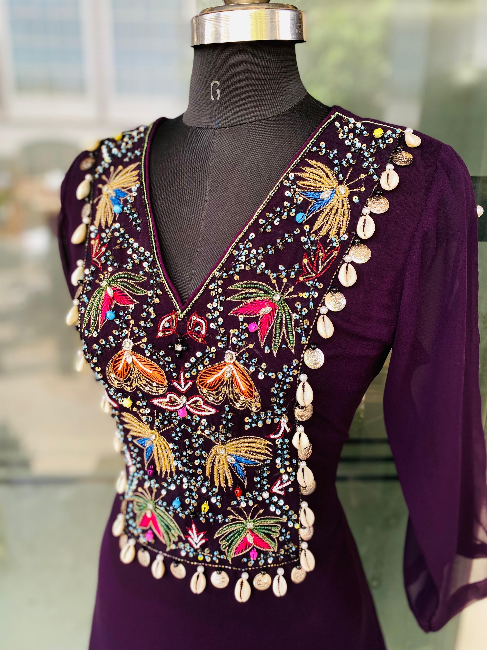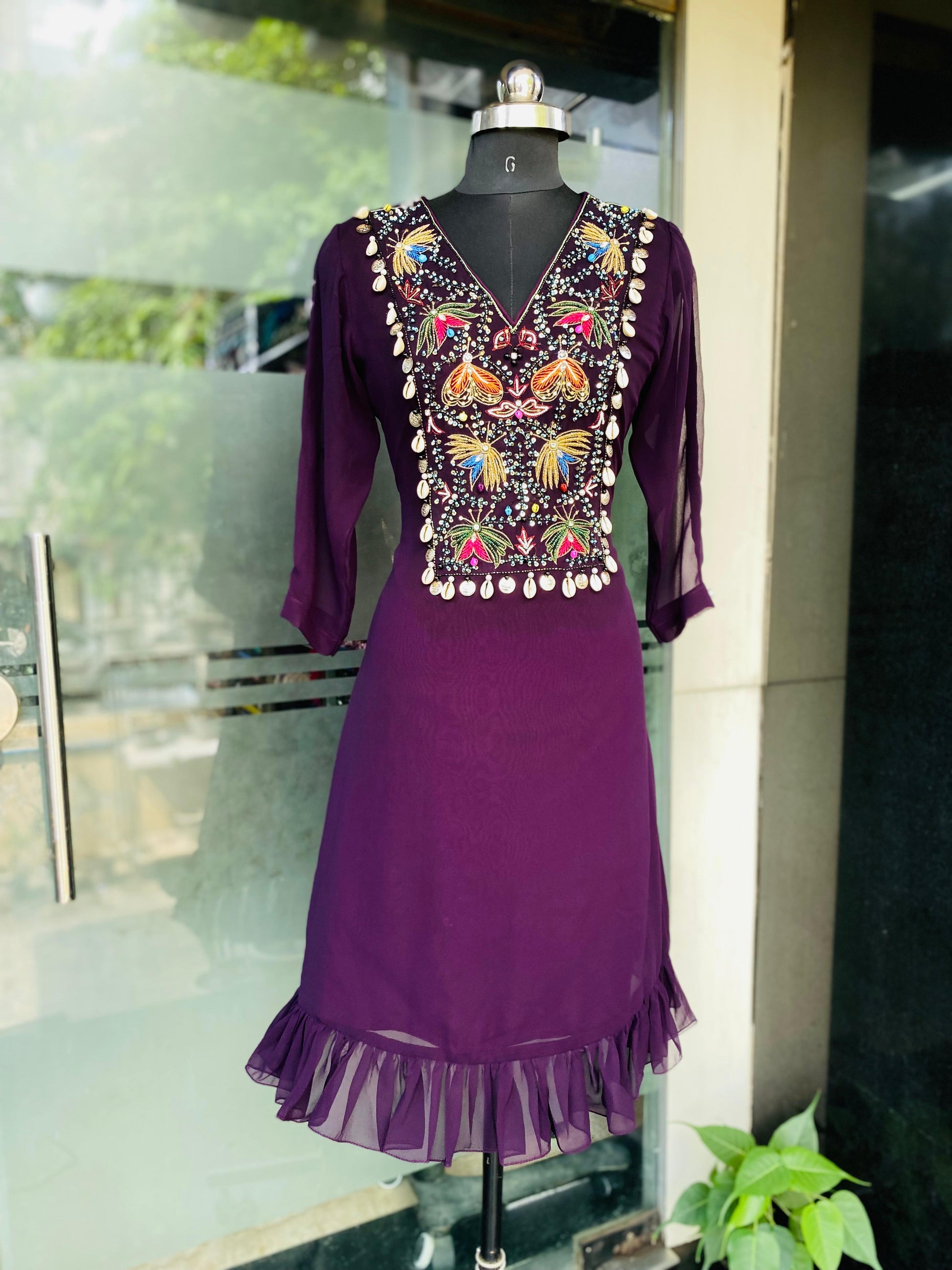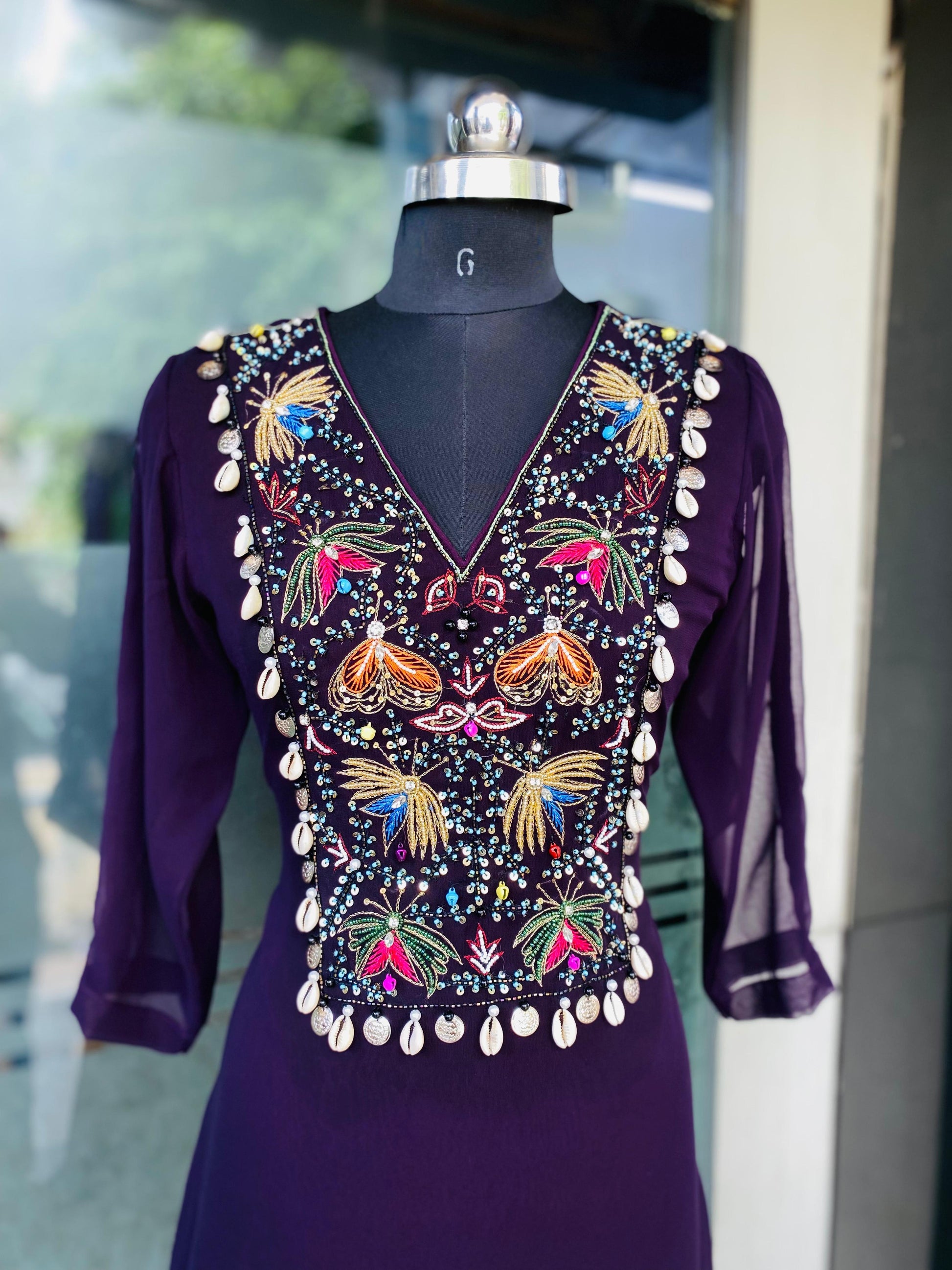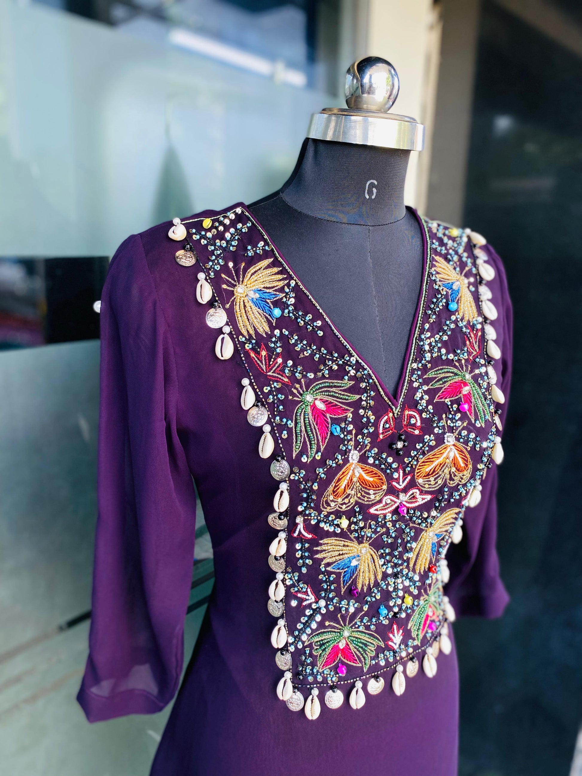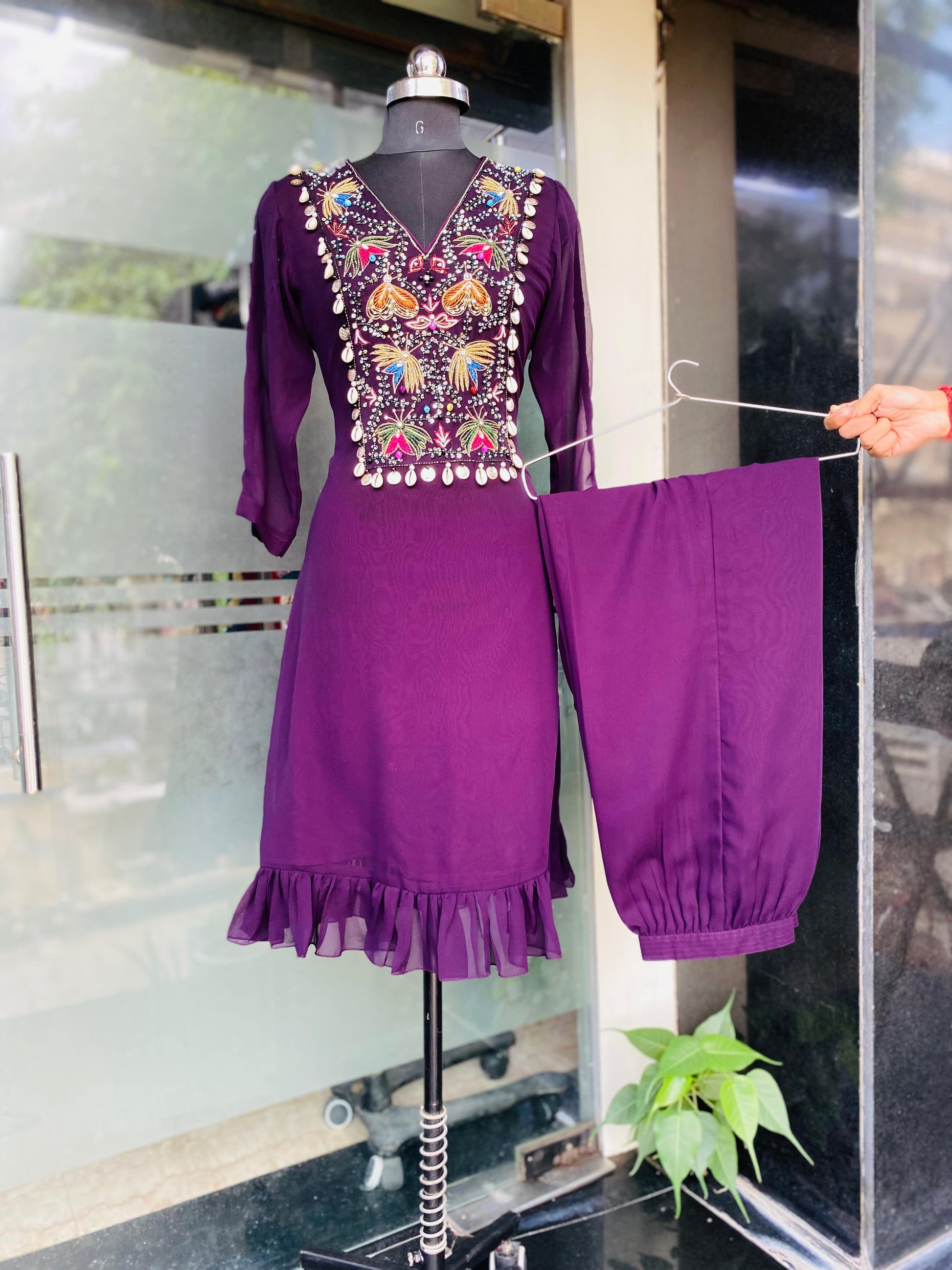 "Exude elegance in this dark purple suit, adorned with intricate embroidery and delicate ruffles. Perfect for festive gatherings, it blends traditional charm with modern style. šāØ #EthnicWear #ElegantFashion" |