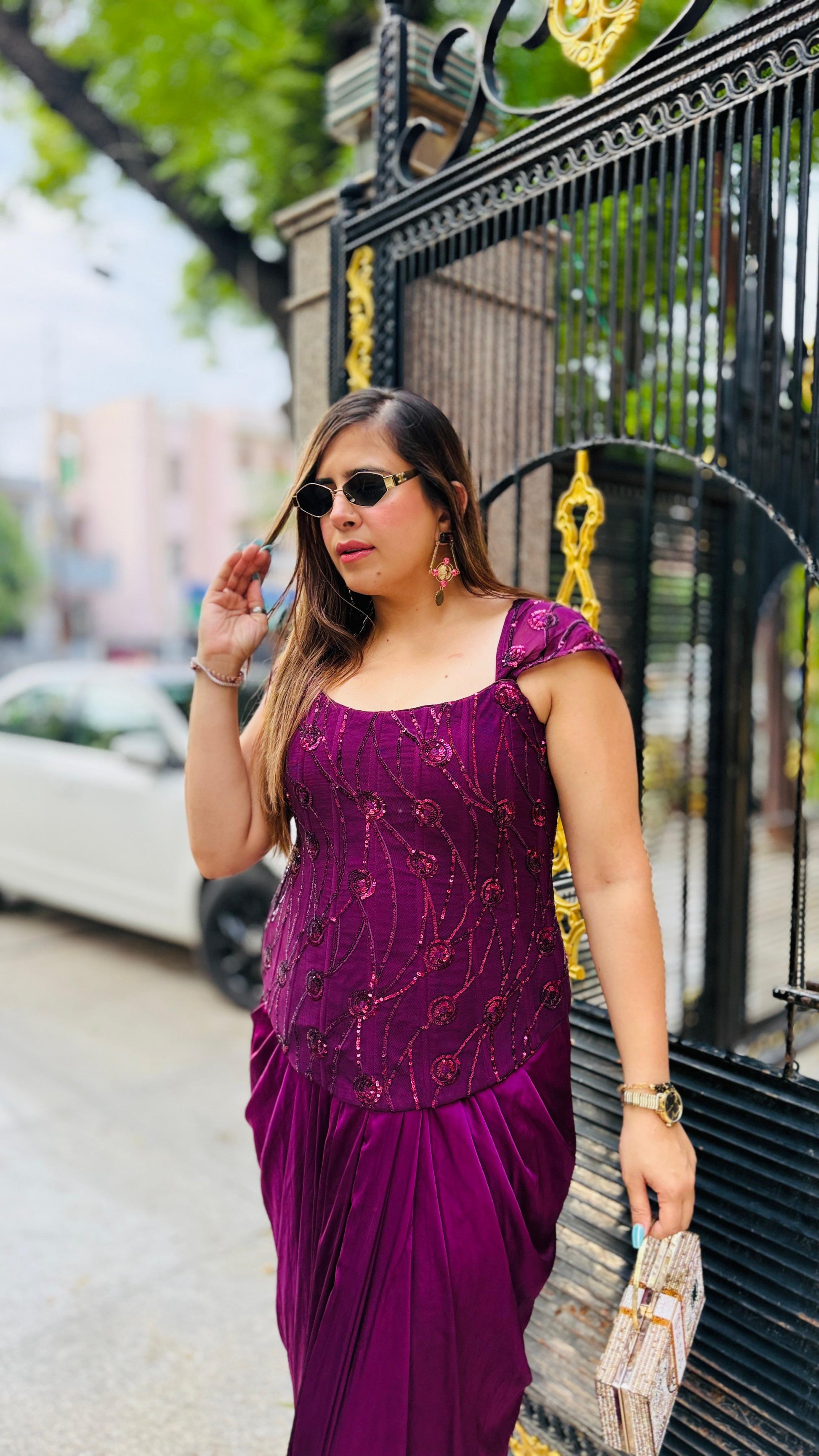 Model Length: 5’8 " Sample Length Top: High: 25" Low: 21" Dhoti: 43 " |