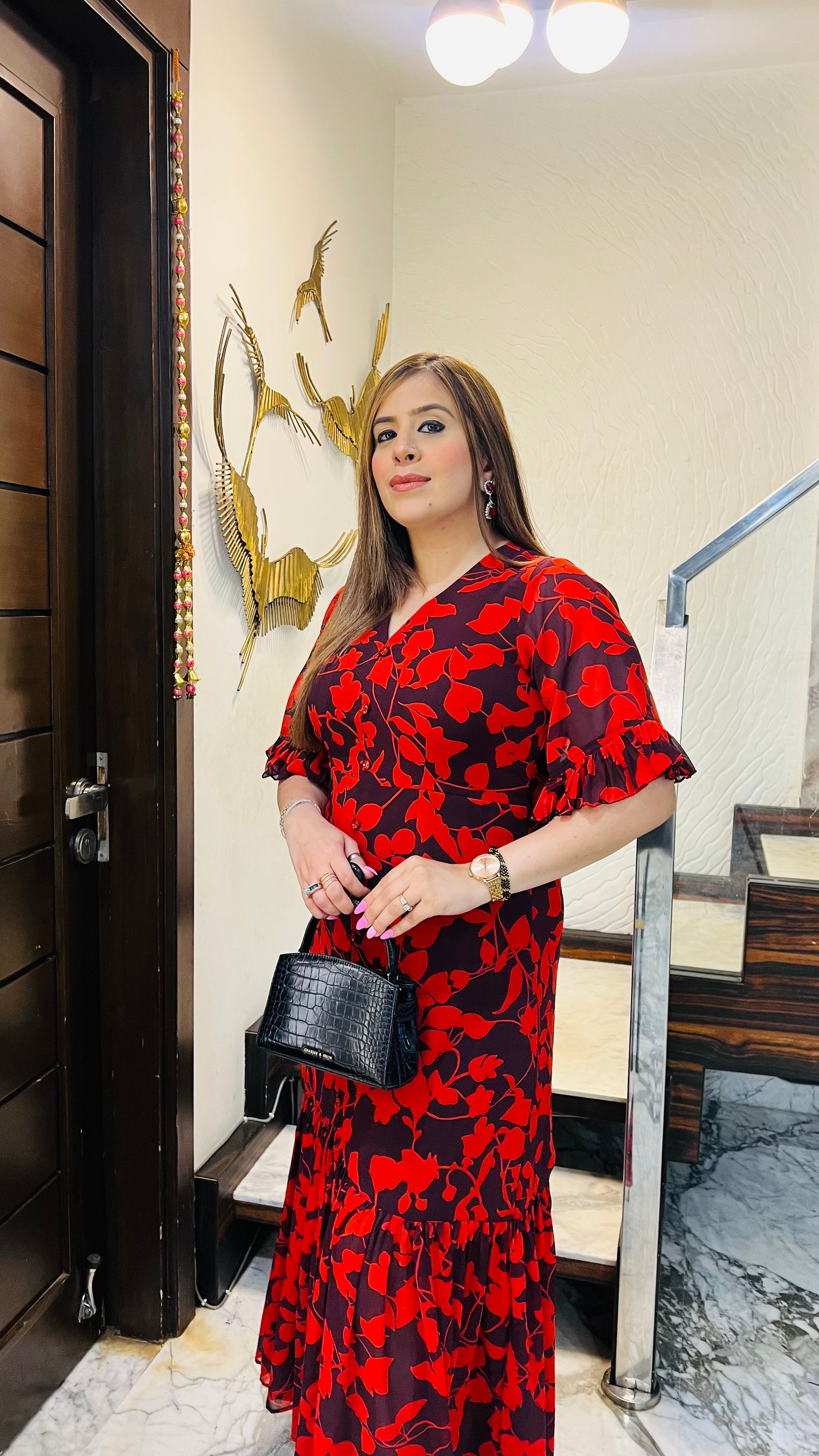 This deep wine maxi dress features a bold red floral print 🌺, a flattering V-neckline, ruffled sleeves, and a tiered hem for an elegant, flowy look ✨. Perfect for chic outings! 🖤👗 |