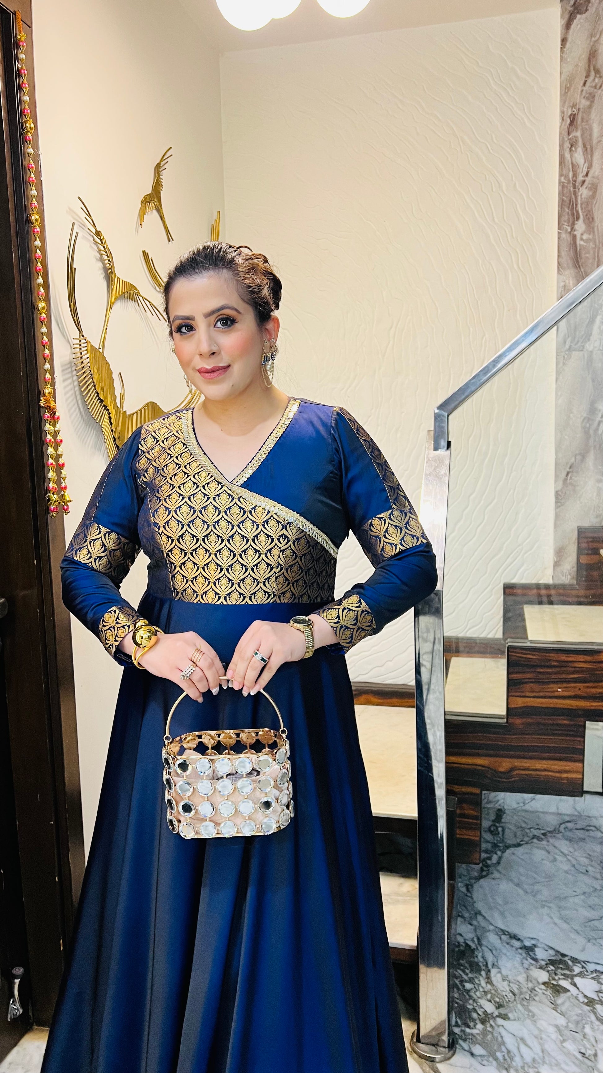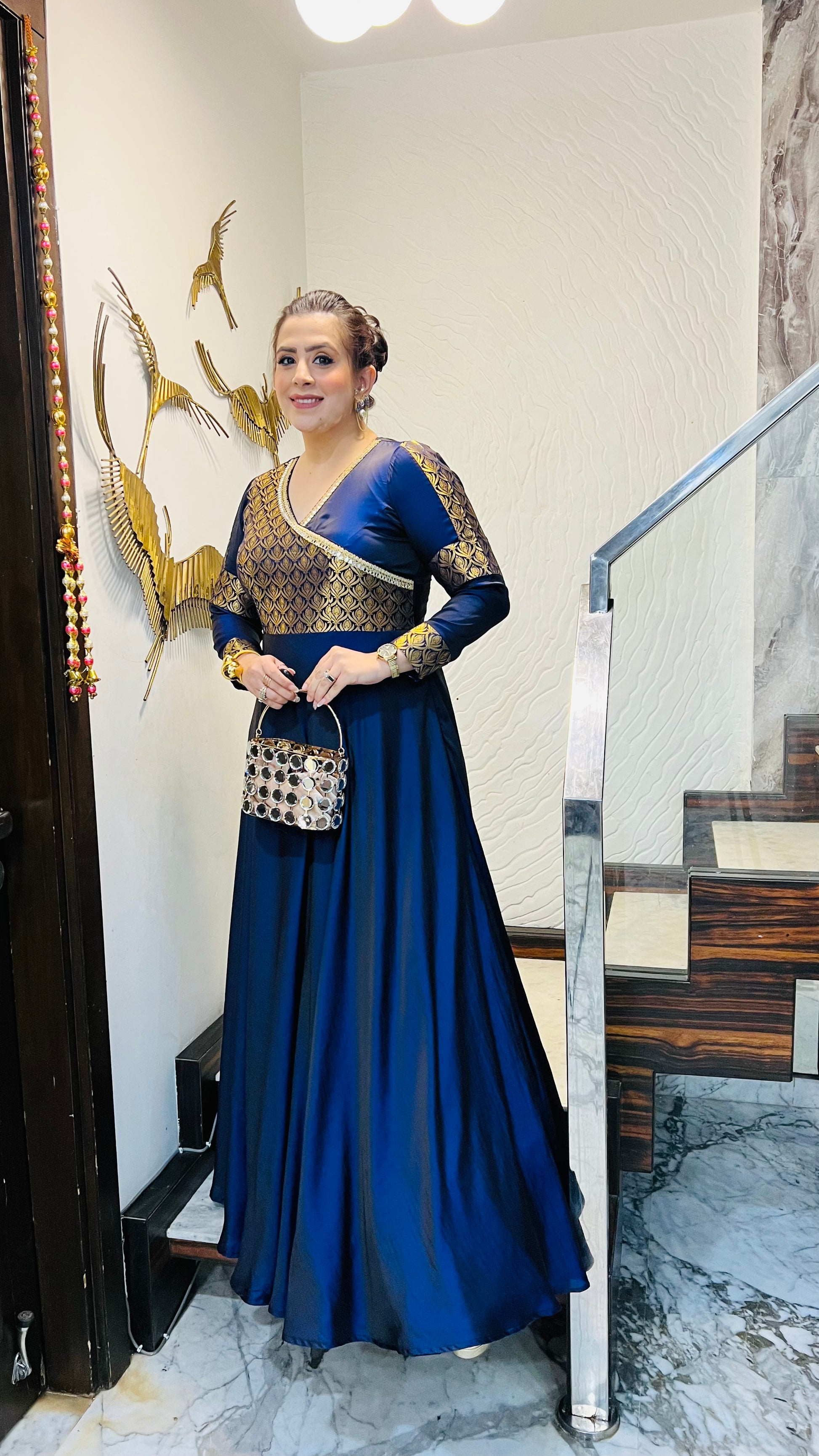Vibrant Dual Blue Winter Gown with intricate golden embroidery ✨, full sleeves, and a flared silhouette. Paired with a chic metallic handbag 👜 and elegant accessories for a graceful look 💃. |