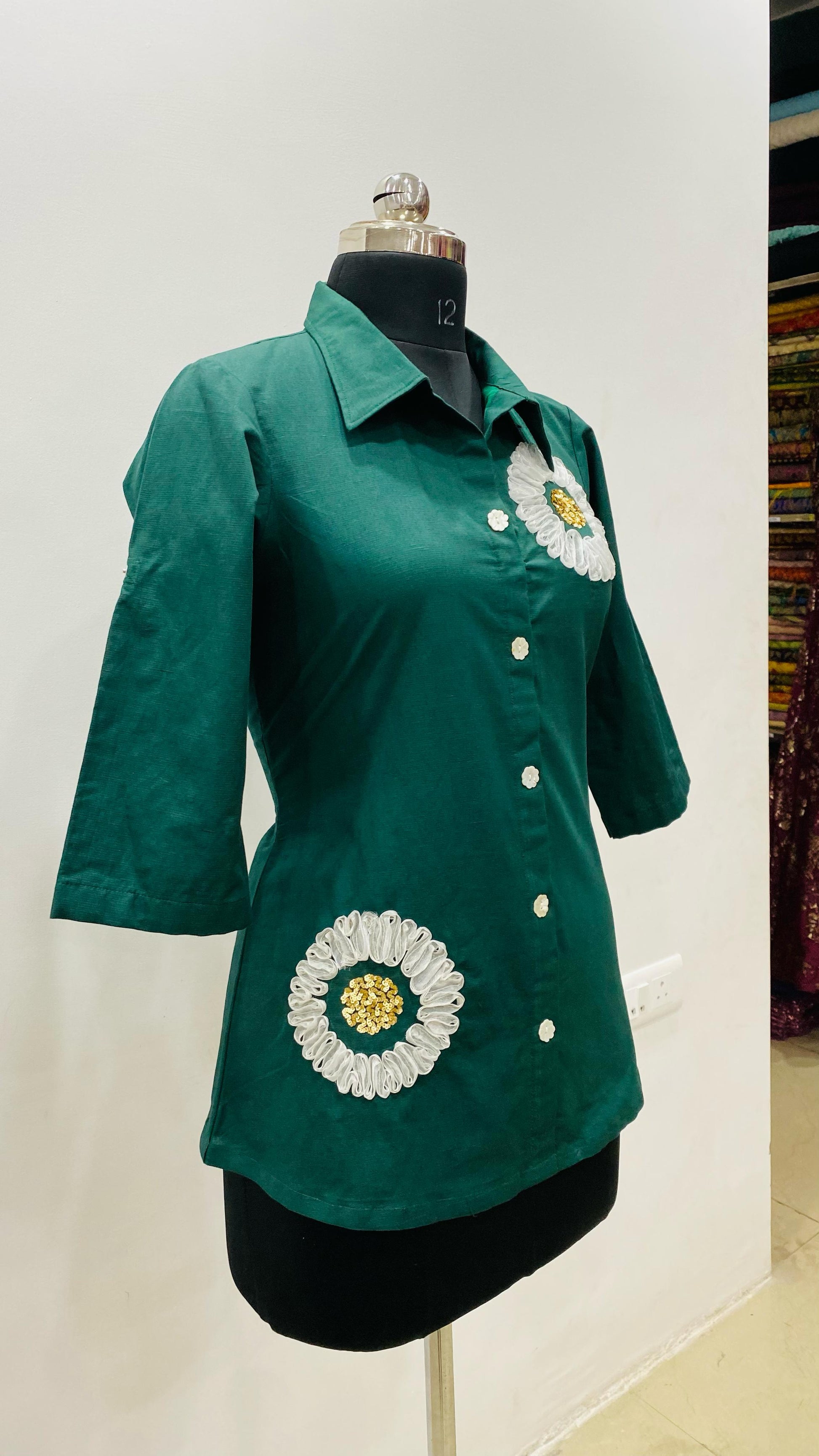 Chic forest green shirt 🌿 with daisy-inspired floral appliqués 🌼, 3/4 sleeves, and cute flower-shaped buttons 🌸—perfect for casual elegance with a touch of nature’s charm 🌼✨
