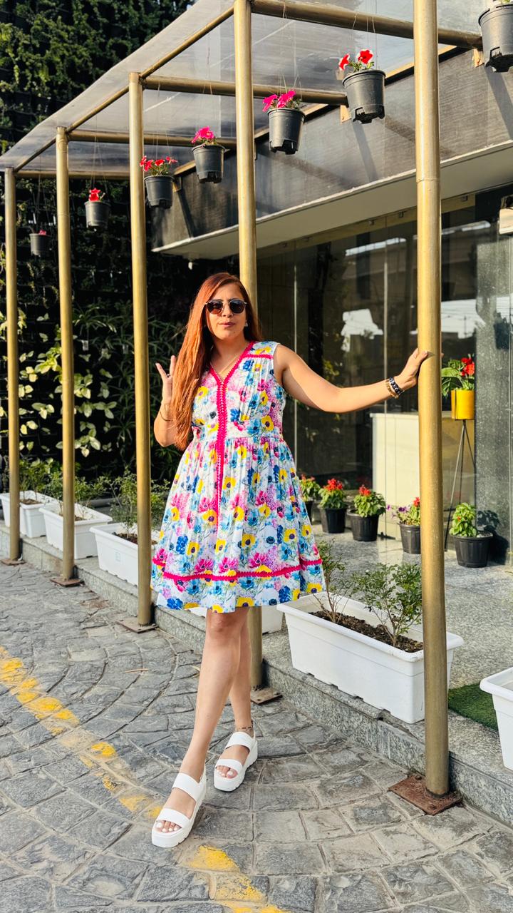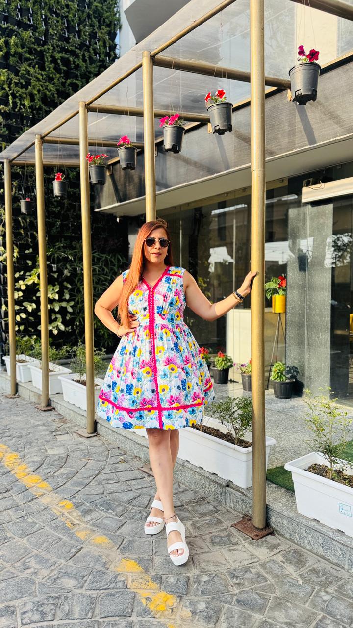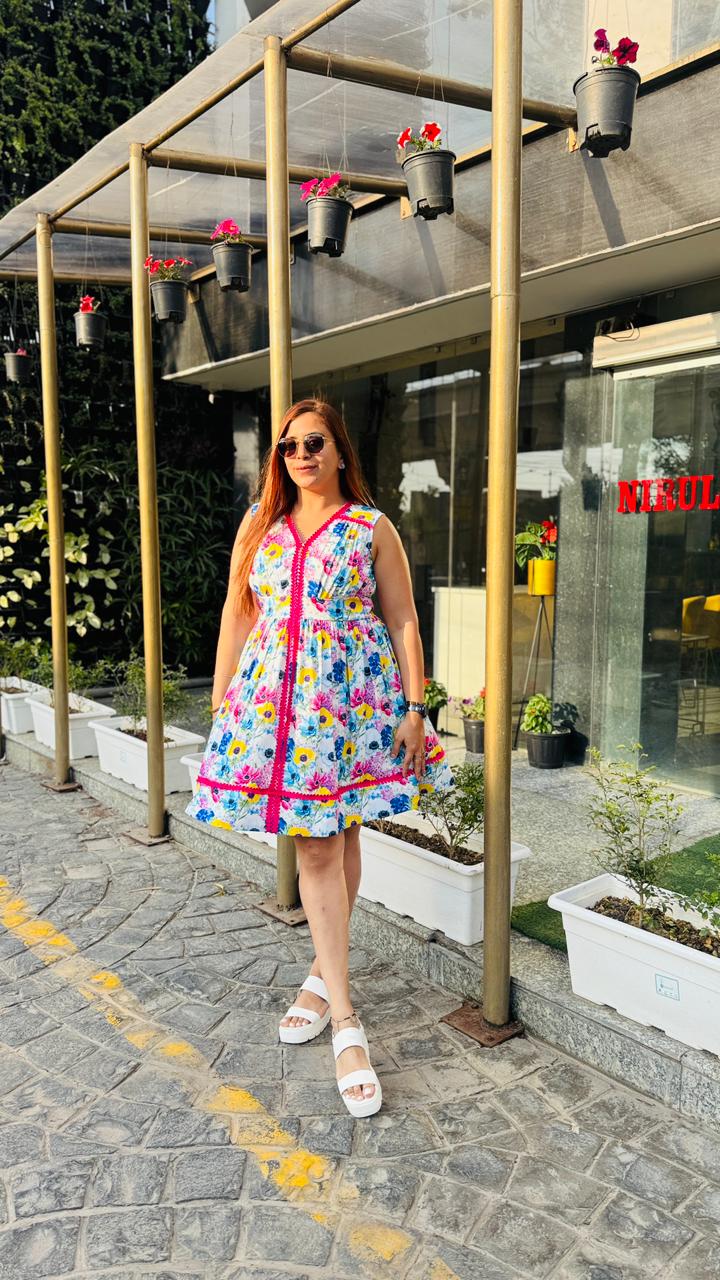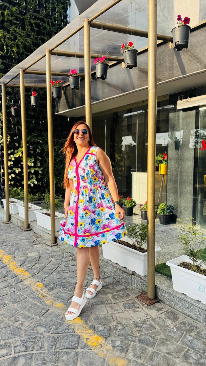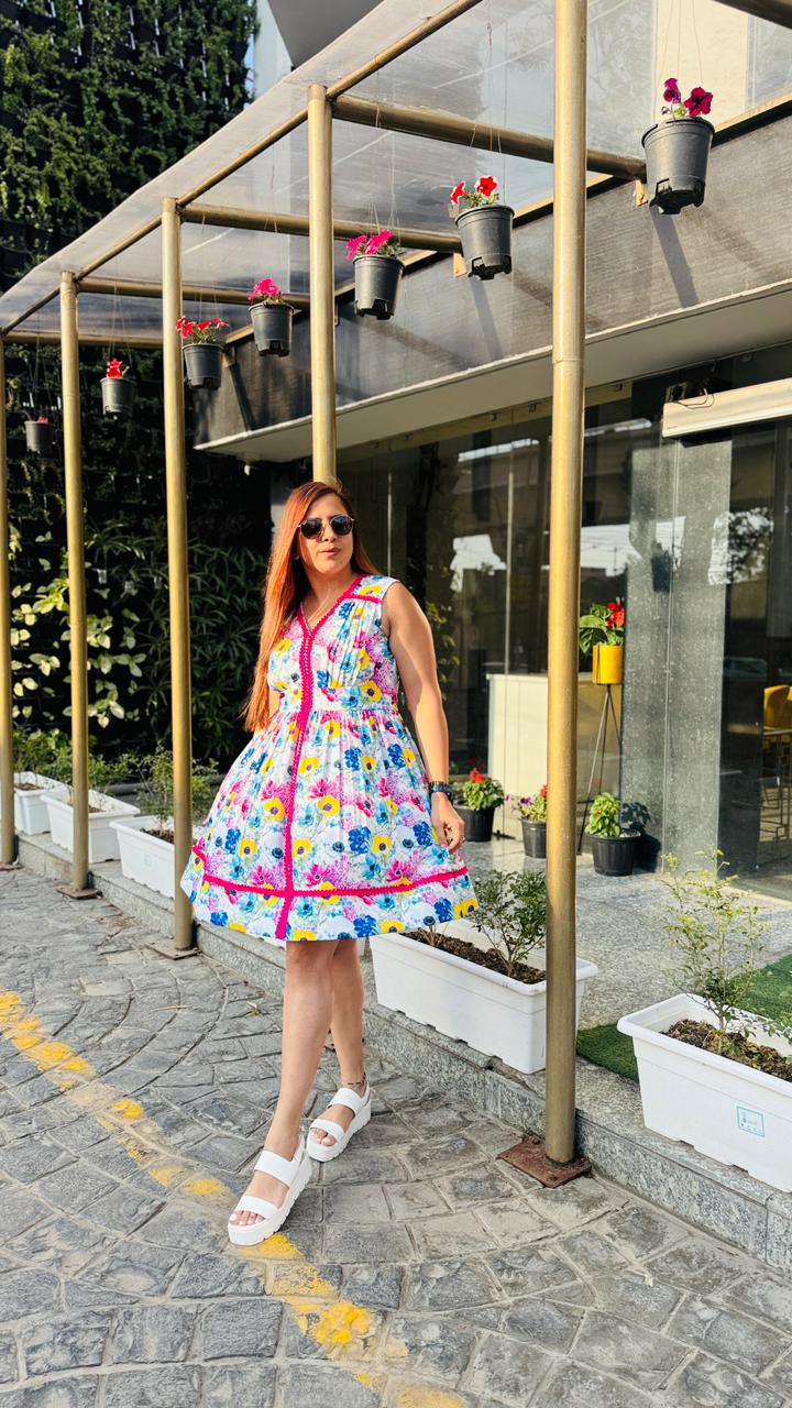 Step into effortless summer charm with this vibrant white floral dress from Lakhina Couture. Crafted in breathable pure cotton with soft cotton lining, it ensures all-day comfort even in warm weather. The flattering V-neckline and sleeveless silhouette enhance the feminine appeal, while the bold pink contrast lace detailing adds a playful couture touch. Designed with a graceful flare, this dress is perfect for brunches, vacations, and sunny day outings. |