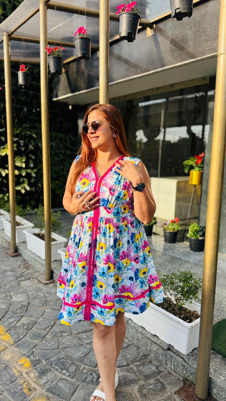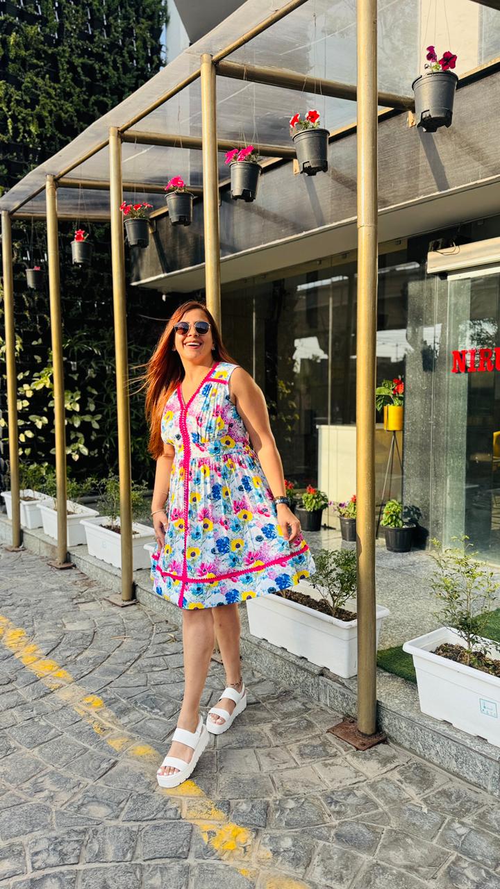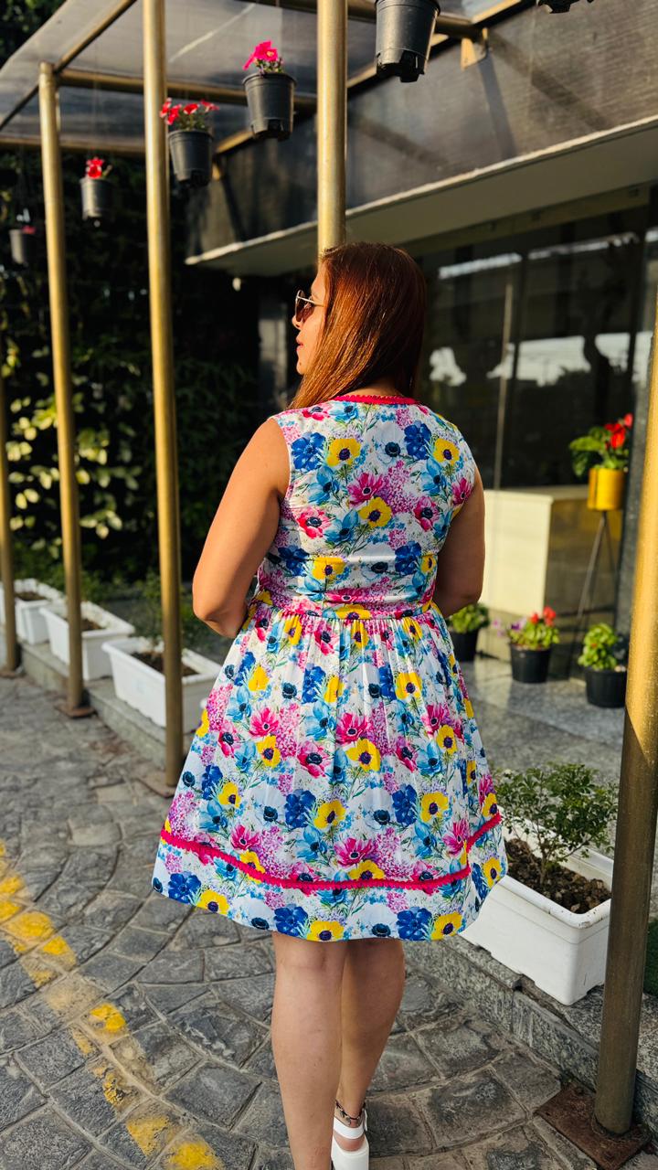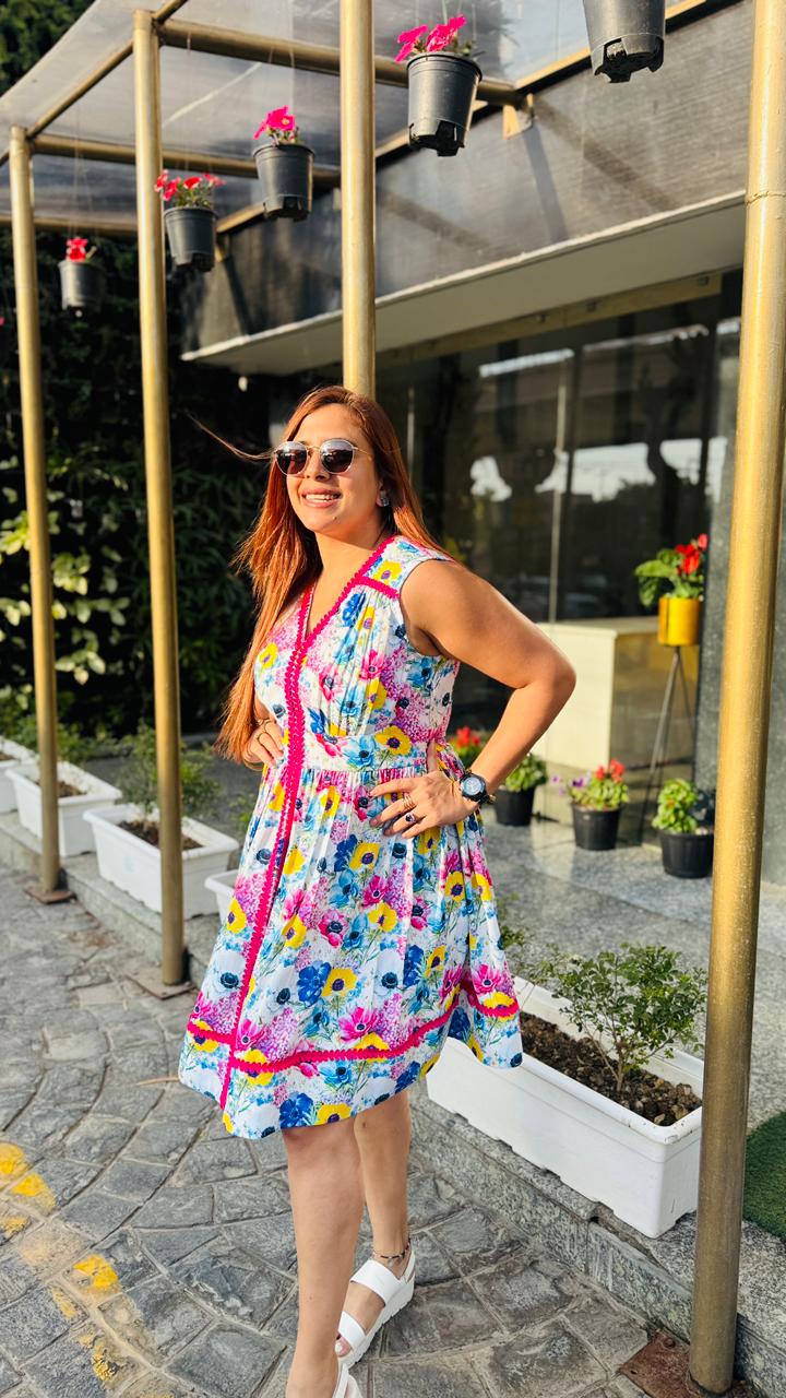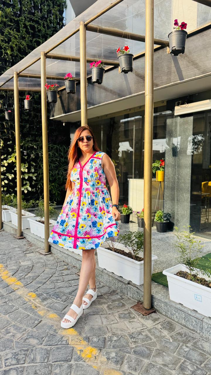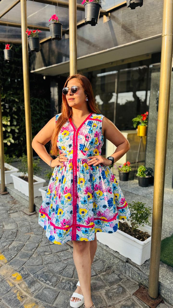 Step into effortless summer charm with this vibrant white floral dress from Lakhina Couture. Crafted in breathable pure cotton with soft cotton lining, it ensures all-day comfort even in warm weather. The flattering V-neckline and sleeveless silhouette enhance the feminine appeal, while the bold pink contrast lace detailing adds a playful couture touch. Designed with a graceful flare, this dress is perfect for brunches, vacations, and sunny day outings. |
