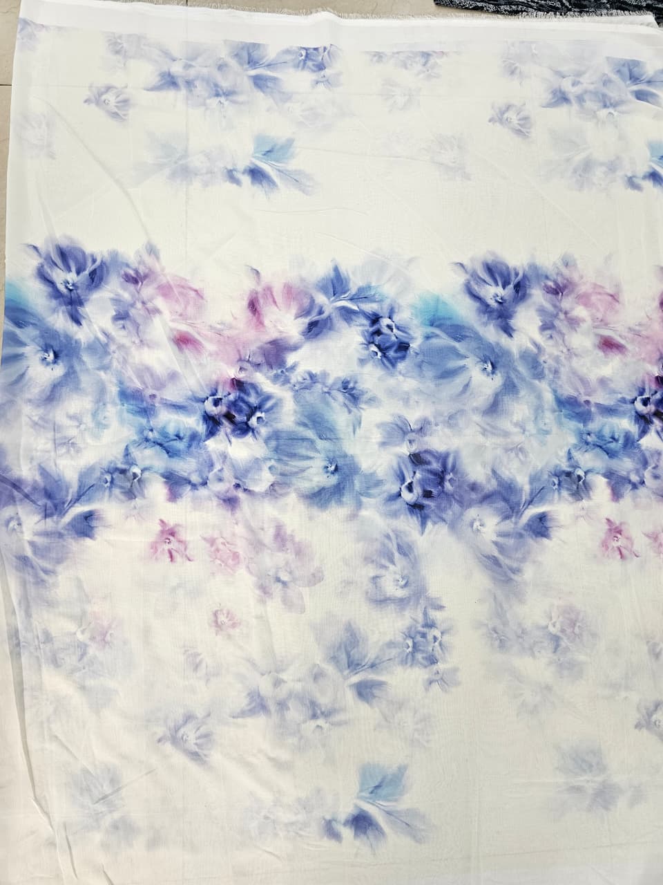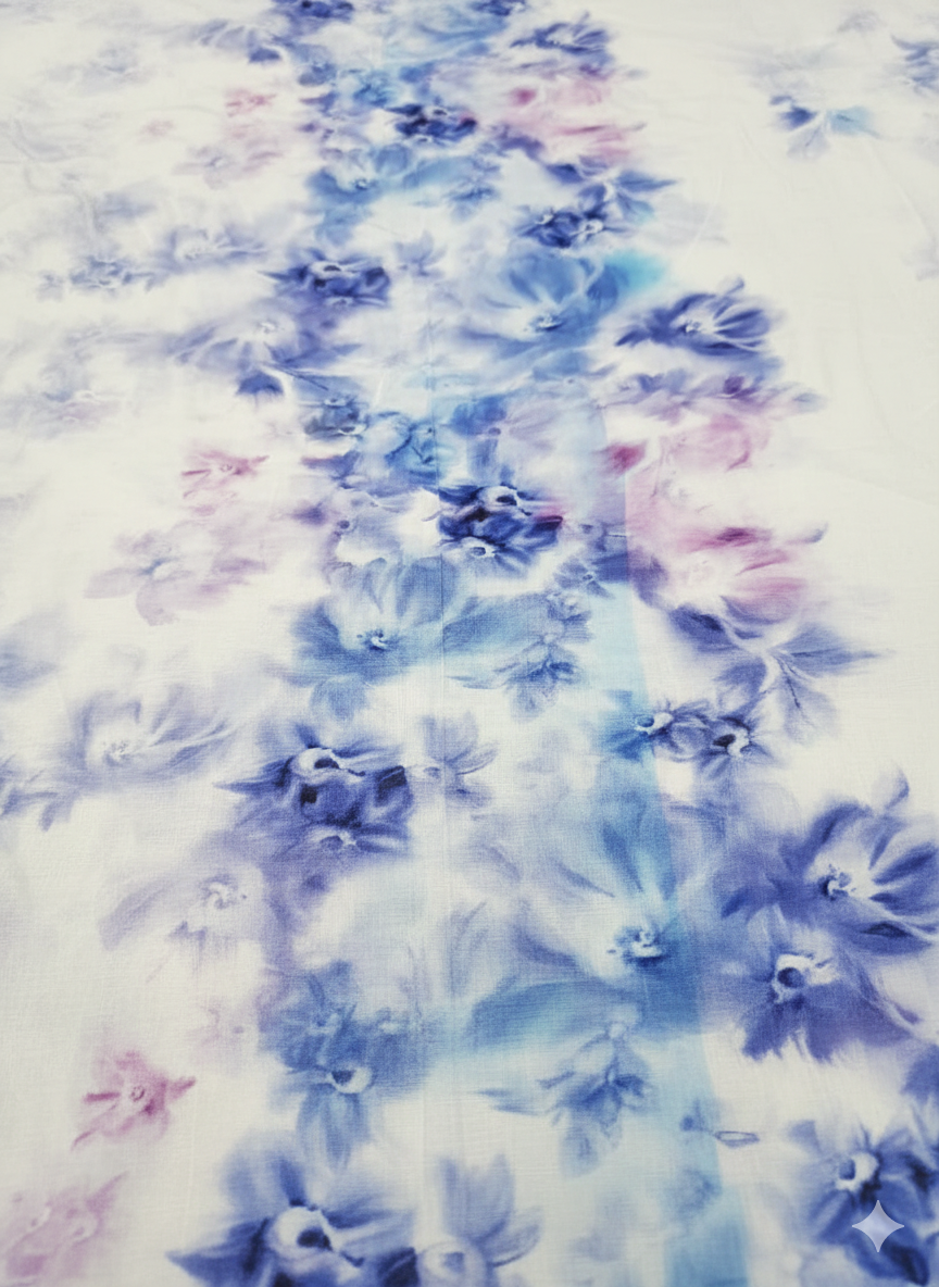 Made from high-quality chiffon, this fabric is soft, lightweight, and flowy, offering beautiful fall and smooth movement. The delicate blue and pastel floral print on a white base adds a refreshing, feminine, and modern touch.