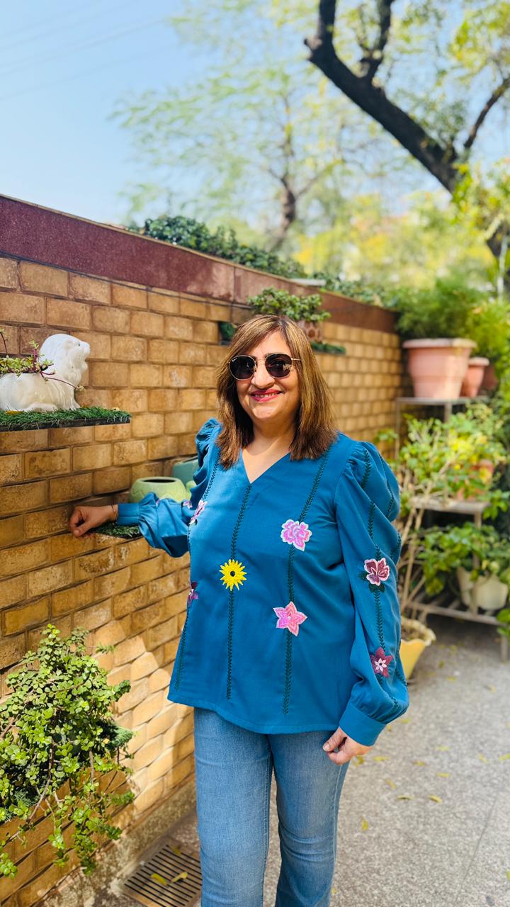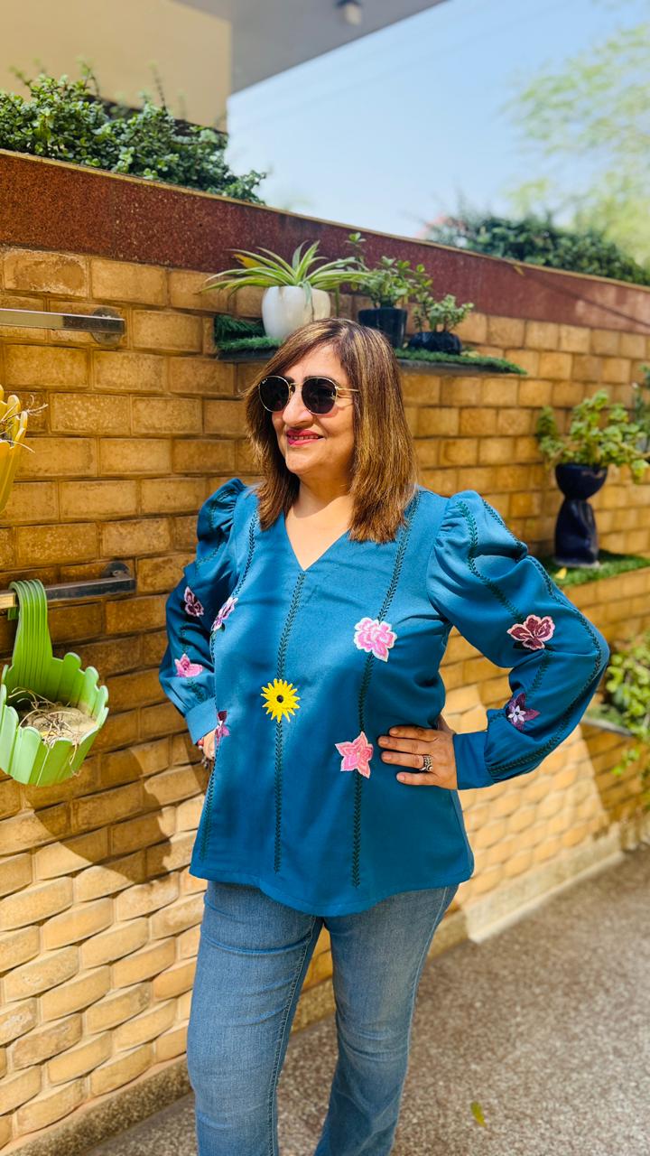 Refresh your summer style with this rich Turquoise top from Lakhina Couture. Crafted in lightweight georgette with a soft crepe lining, it offers breathable comfort and a graceful drape. Floral embroidery and statement puff sleeves add refined charm, making it perfect for elegant day outings and elevated casual looks. |