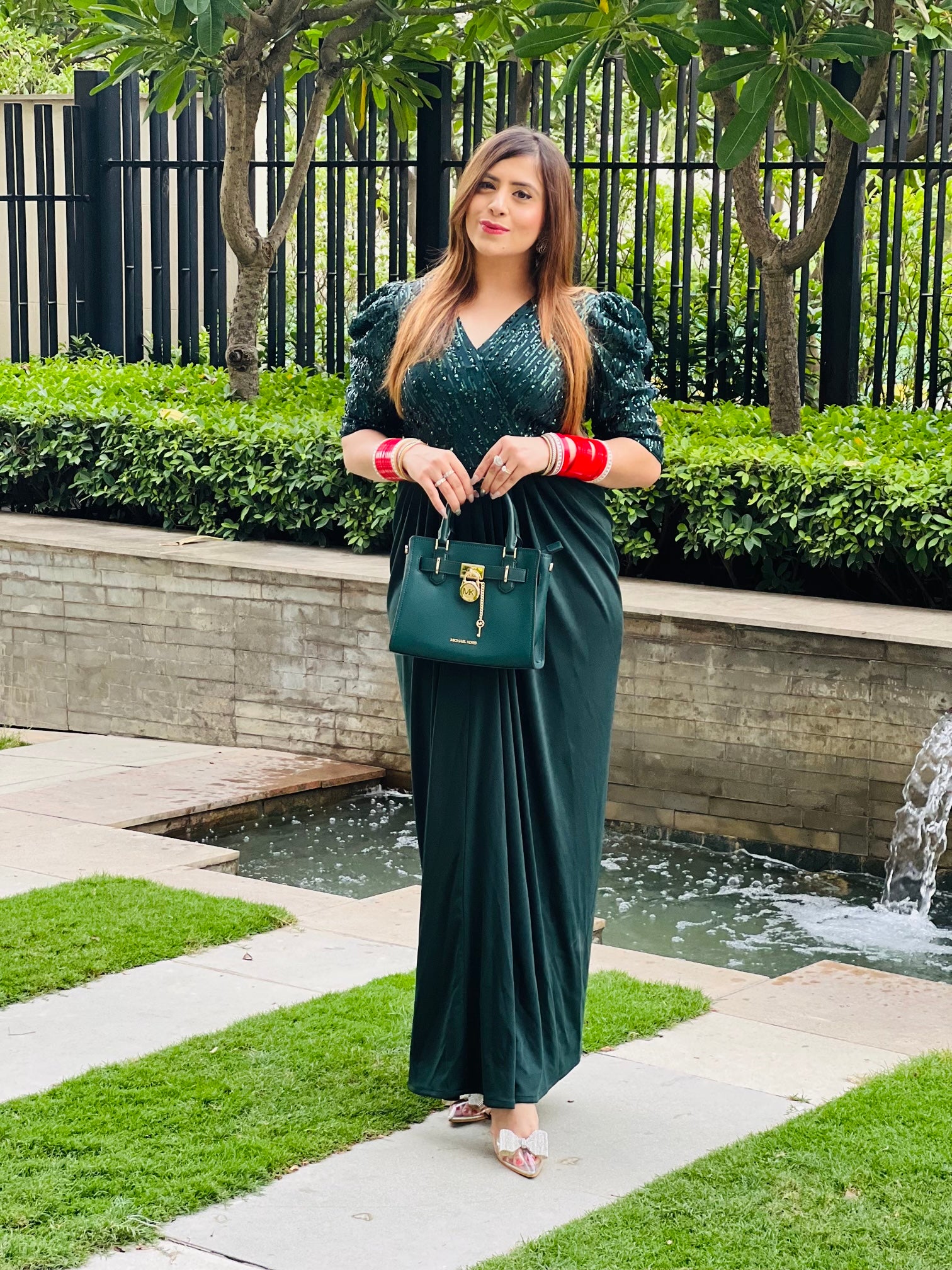Wearing a gorgeous drape dress curated in Sequin Net + Lycra fabric brought to you in many more colours!
