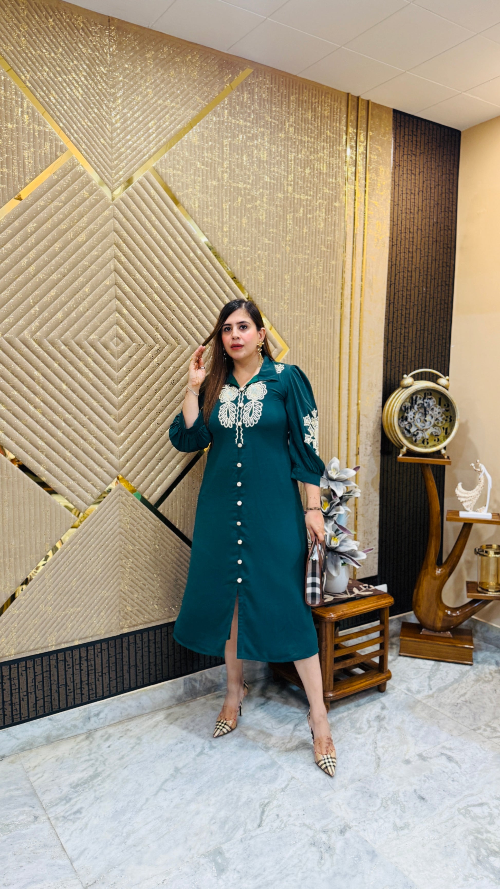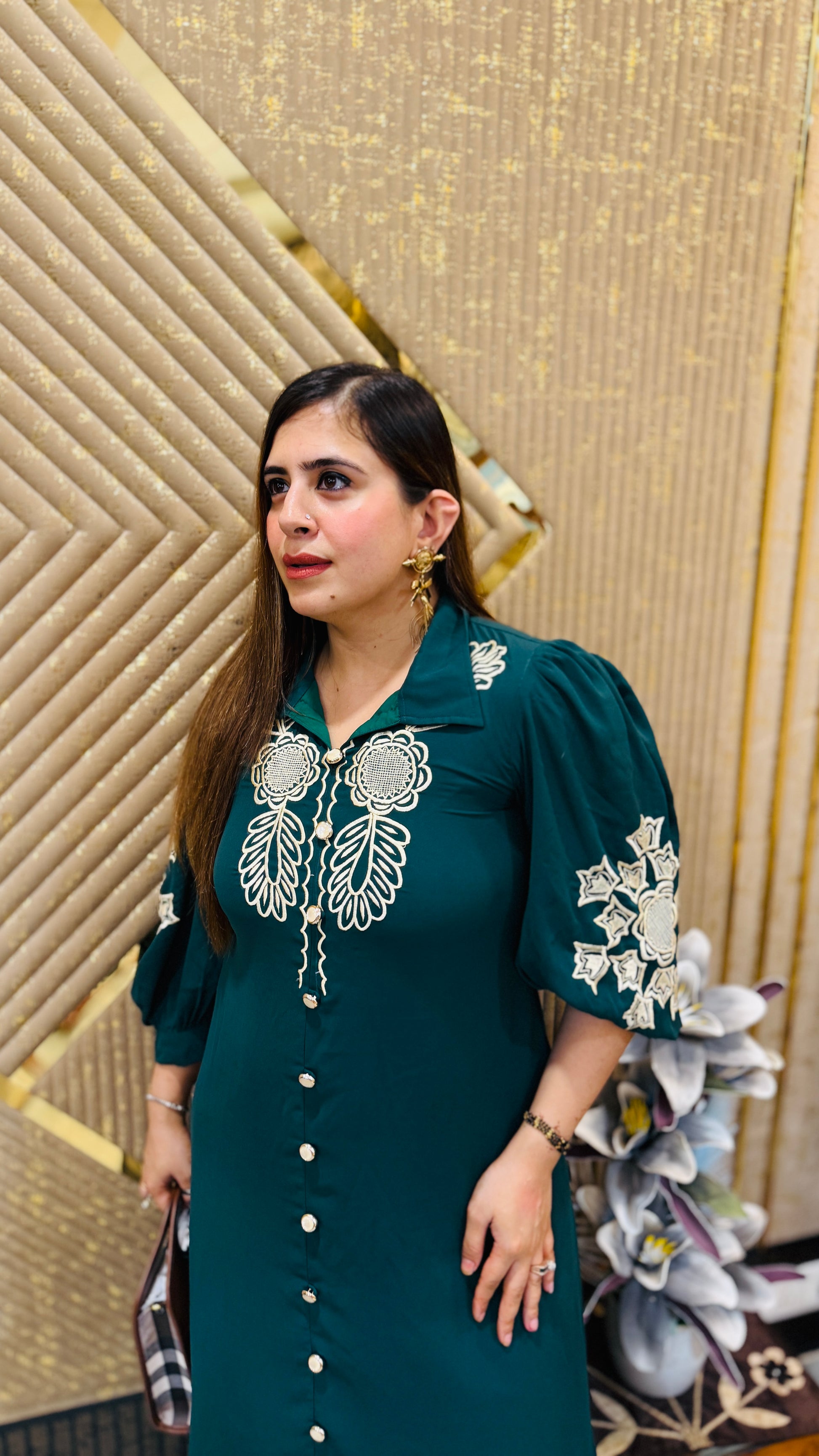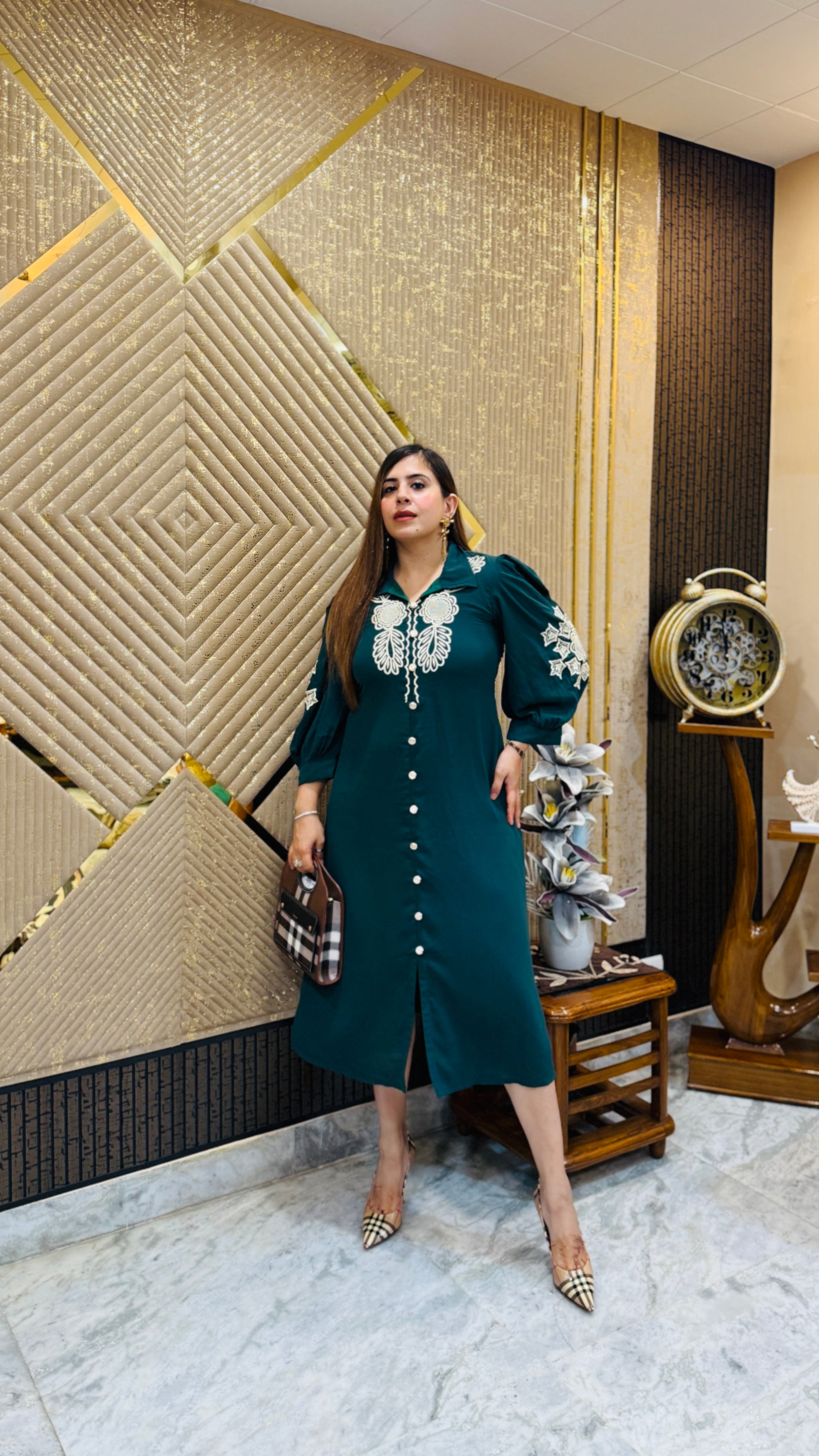 Elegant green midi dress 💚 with intricate ivory embroidery 🤍 on the bodice and puff sleeves ✨. Features front button detail, collared neckline, and a classy silhouette — perfect for chic occasions 🌸👗. |