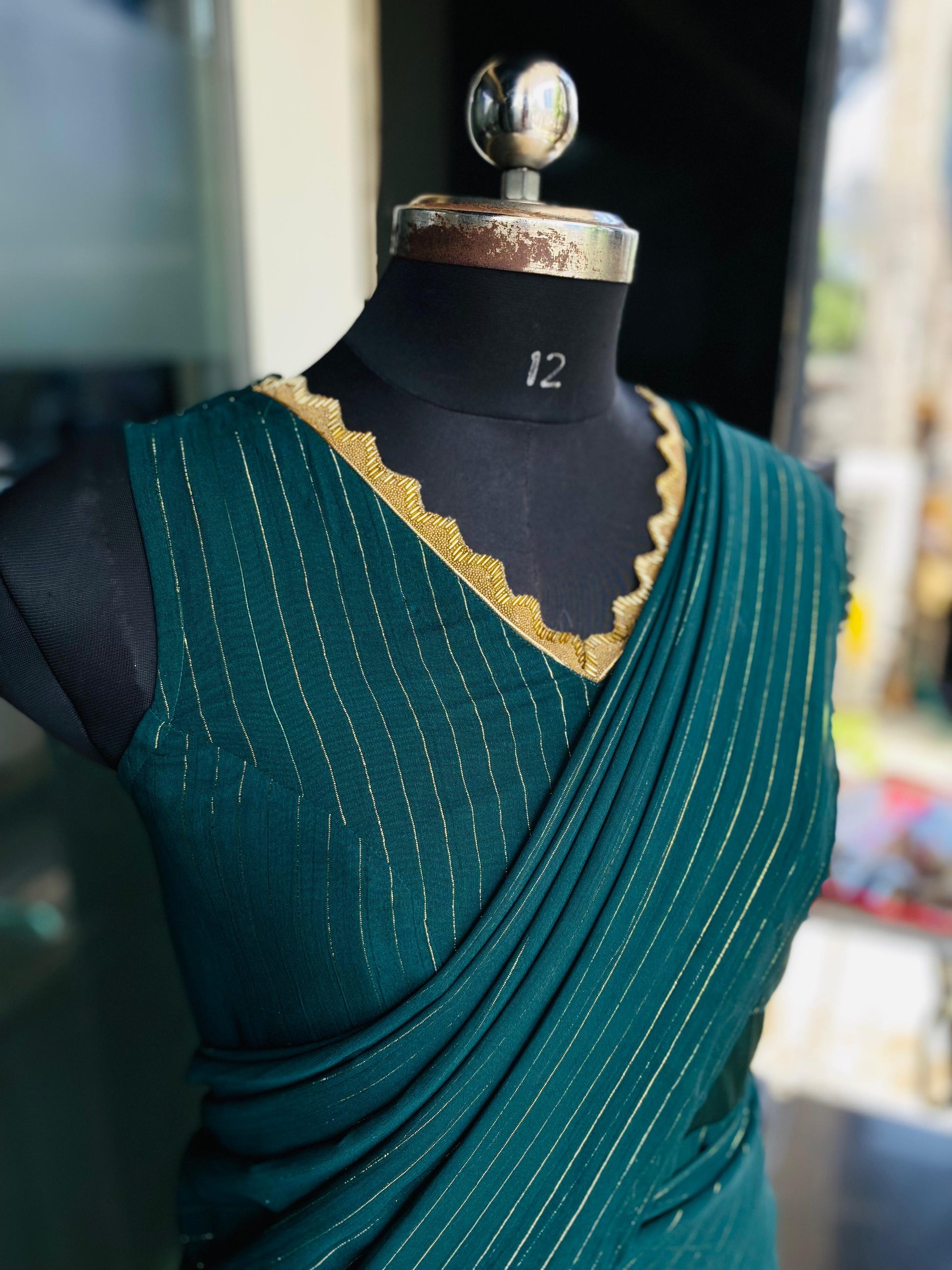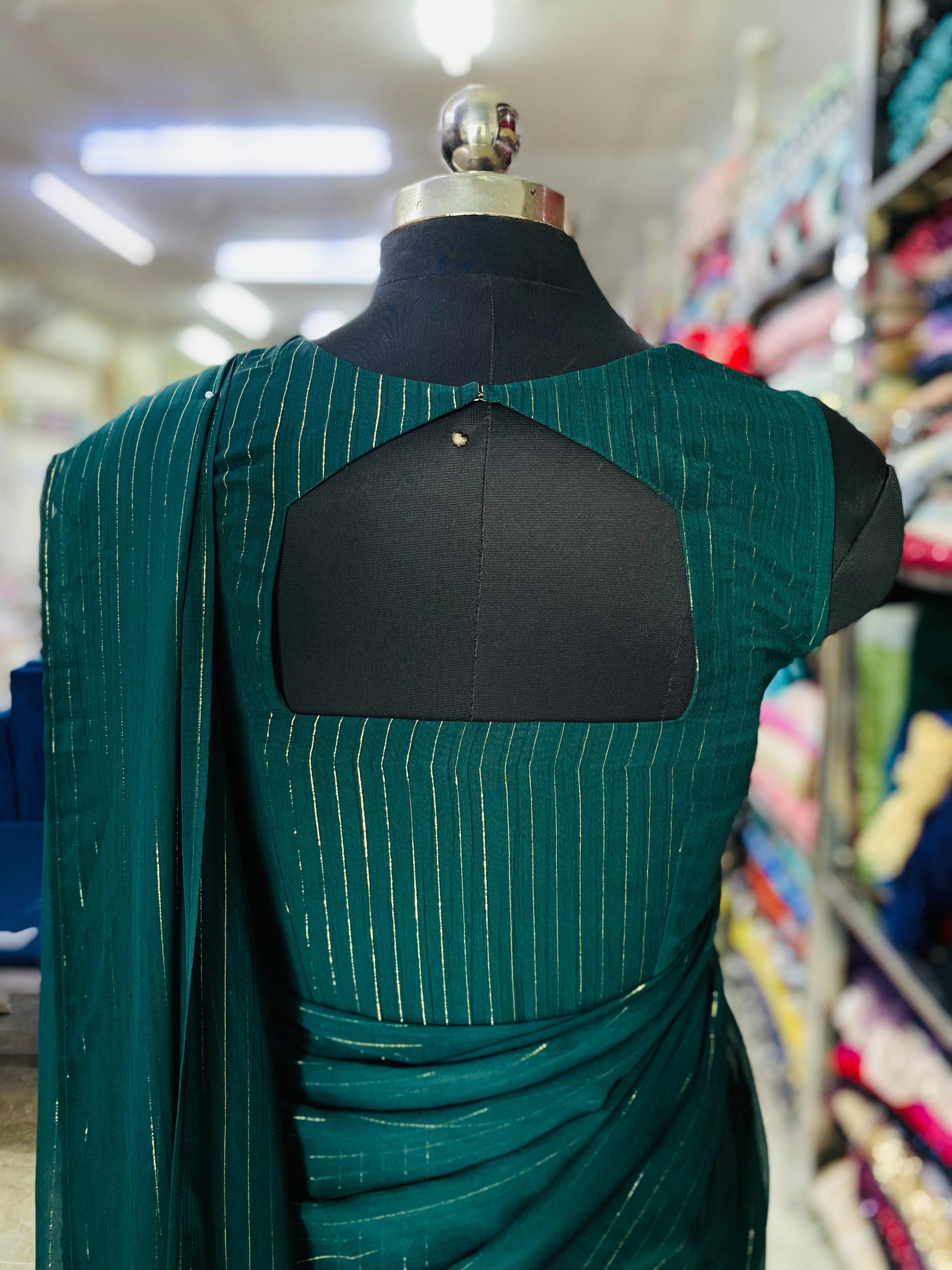 This Green Lurex Maxi Saree features a modern, sleek draped style with golden stripes and a ruffled bottom. Perfect for festive events, it blends elegance with contemporary flair. 💚✨ #ChicDrapes |