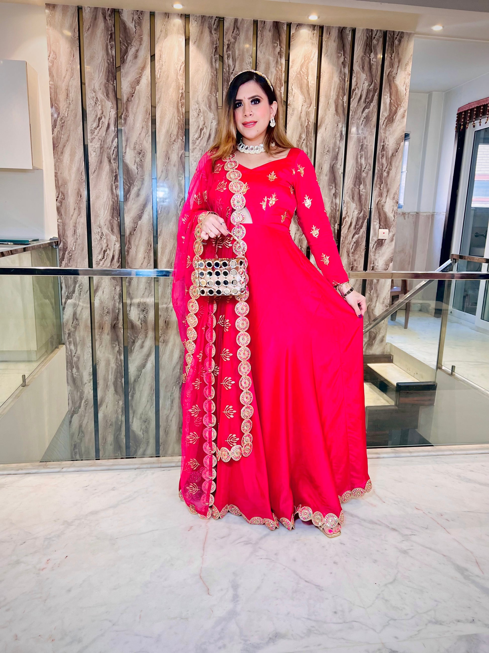 Hot Pink allure, draped in crepe grace – this Anarkali radiates elegance with every twirl, a vibrant symphony of style and sophistication. 💖✨ |